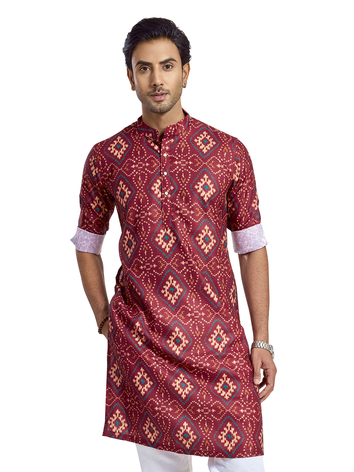 Rich maroon hues meet refined prints in this smooth silk kurta, ideal for festive evenings and cultural gatherings. Designed for mature men, it offers a blend of tradition and confident style. Comfortable to wear, it remains a graceful option for pujas or family events.