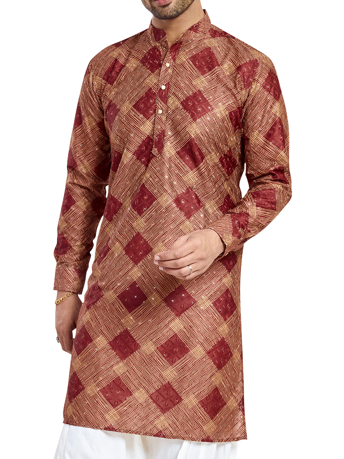 Crafted in rich maroon silk, this printed kurta brings effortless festive elegance with its soft sheen and refined tone. The Chinese collar and full sleeves enhance its classic charm. Perfect for joyful celebrations, it blends traditional finesse with contemporary sophistication for a poised, graceful look.