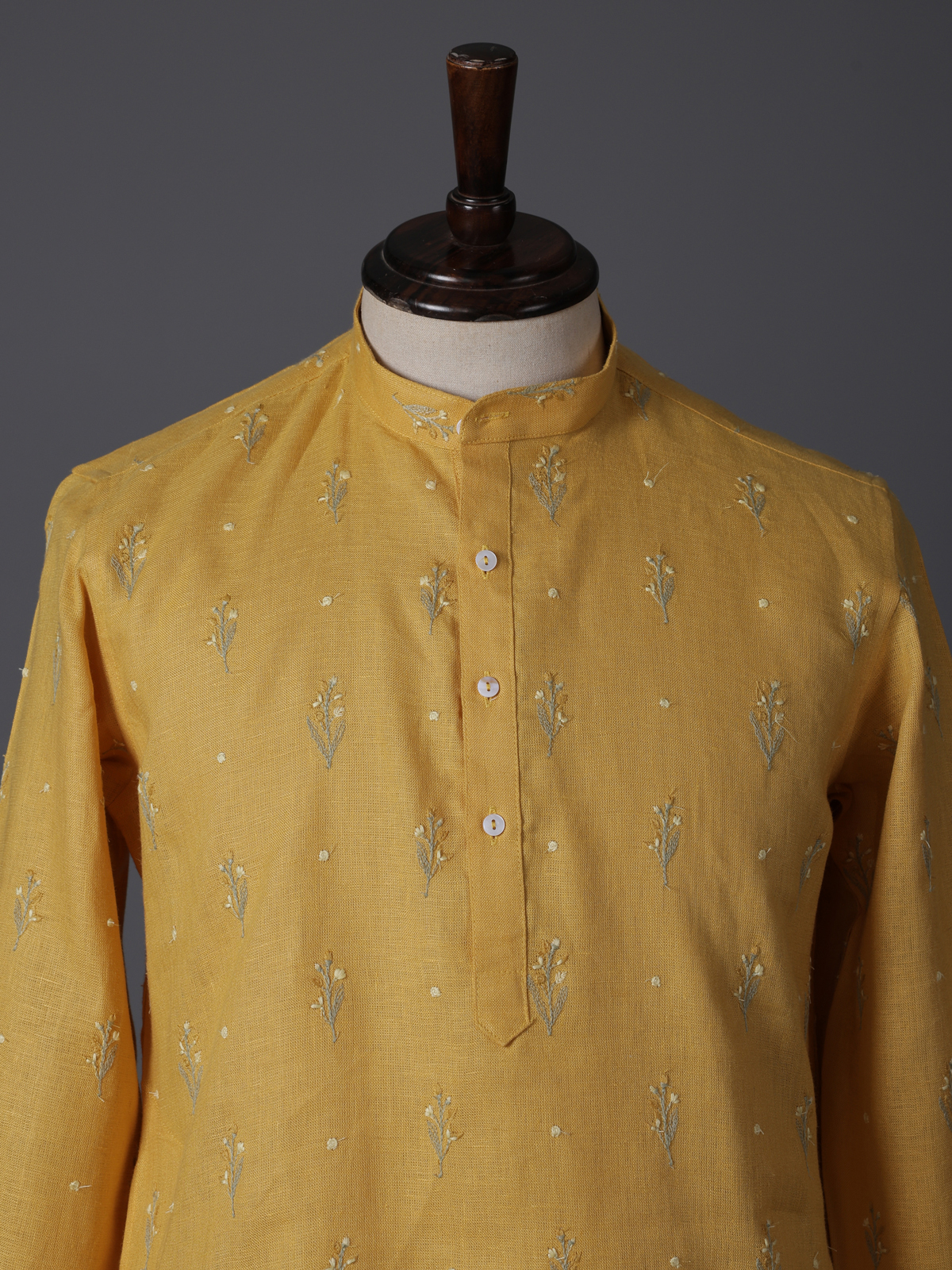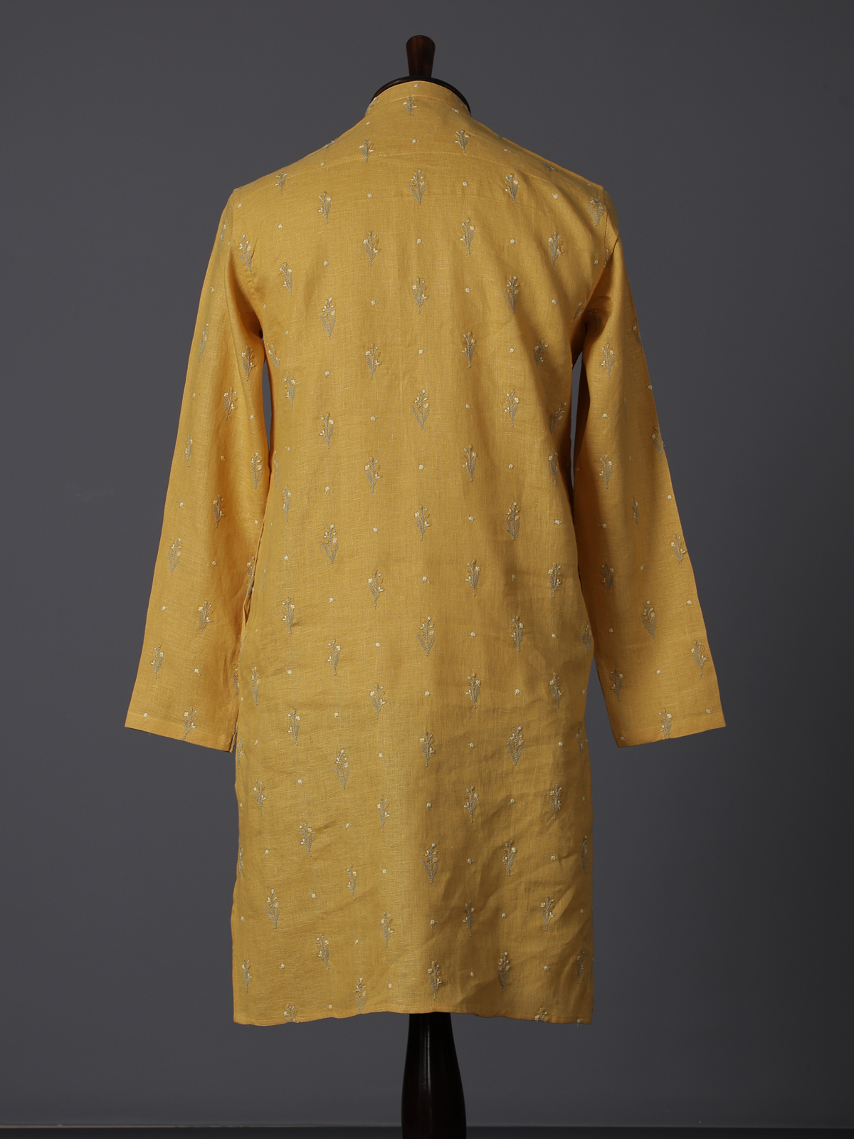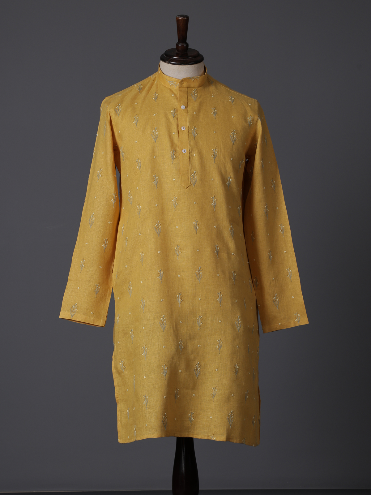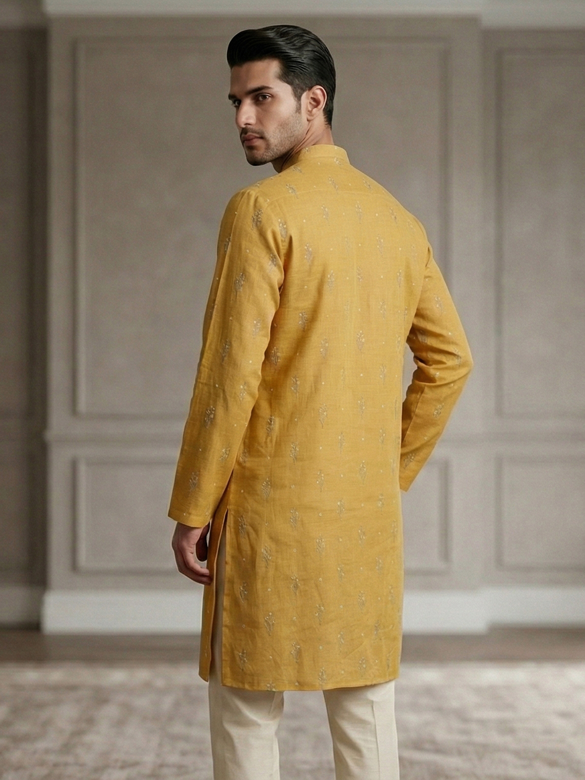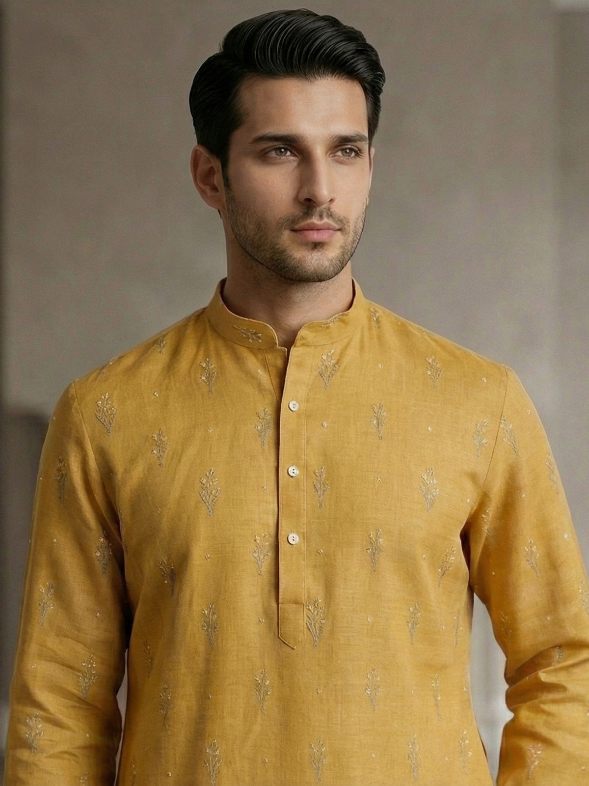 Cheerful mustard yellow brighten this cotton linen kurta crafted for festive occasions. Adorned with subtle thread work. It reflects simple yet elegant detailing. The chinese collar enhances its structured look. While the breathable fabric ensures comfort. Ideal for eid, haldi and celebrations. This kurta offers a lively and refreshing ethnic style.