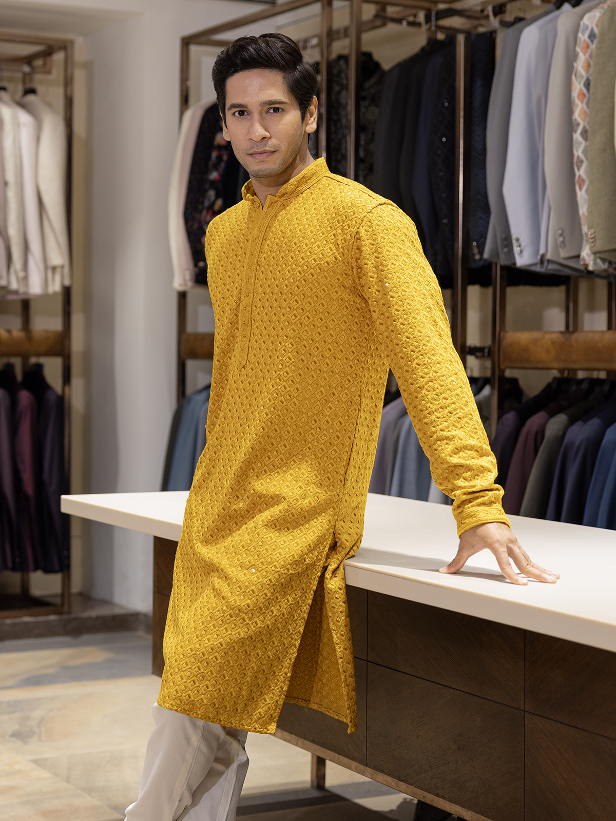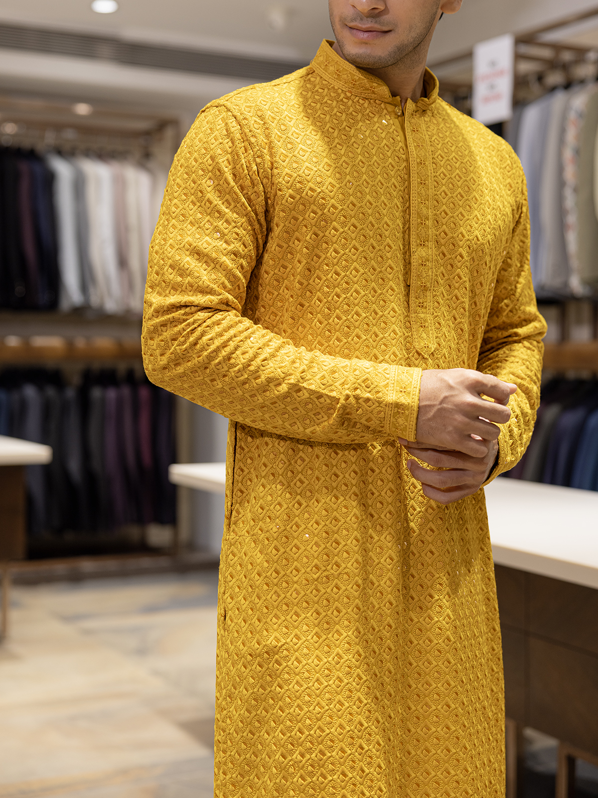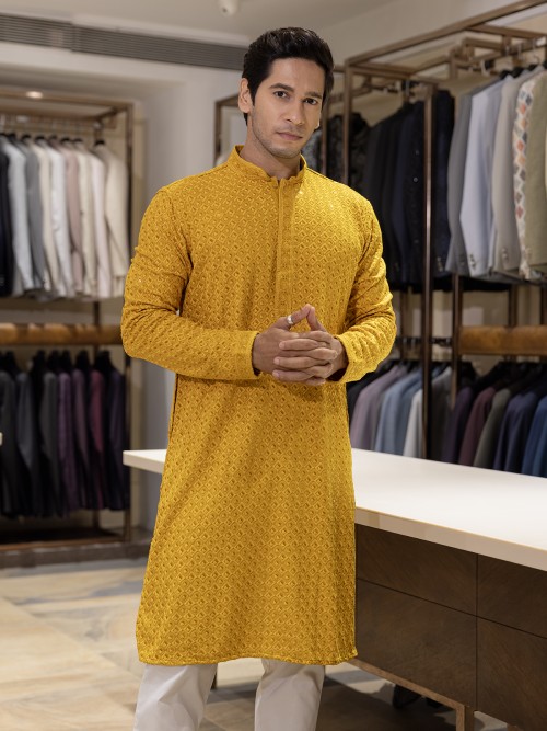 Glow in mustard yellow, this cotton silk kurta shines with thread and sequin accents. Featuring a mandarin collar and full sleeves, it blends brightness with festive elegance, ideal for Haldi ceremonies and cultural celebrations.