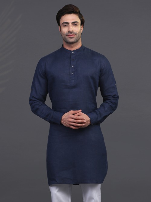 Dress up in this solid navy linen kurta suit for any festive occasion. It has a stand collar, short hook button placket, full sleeves with vented hem.