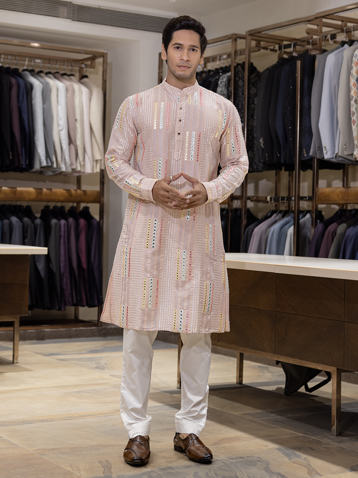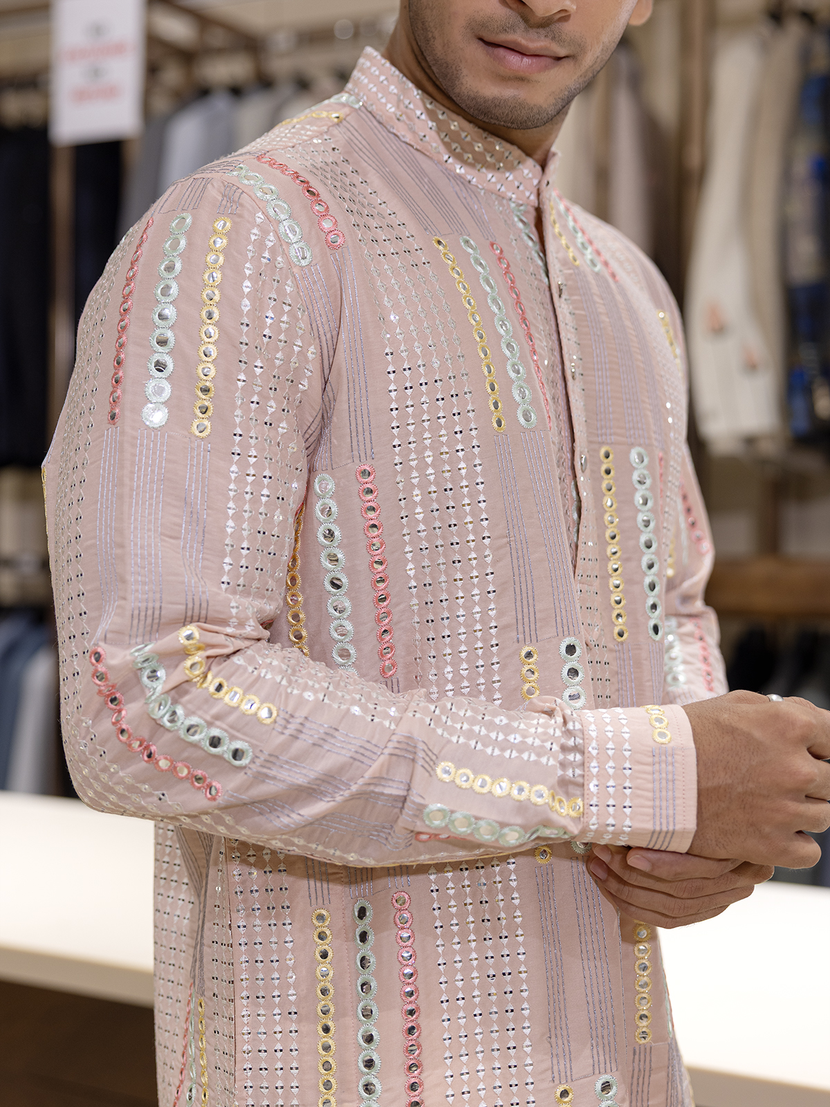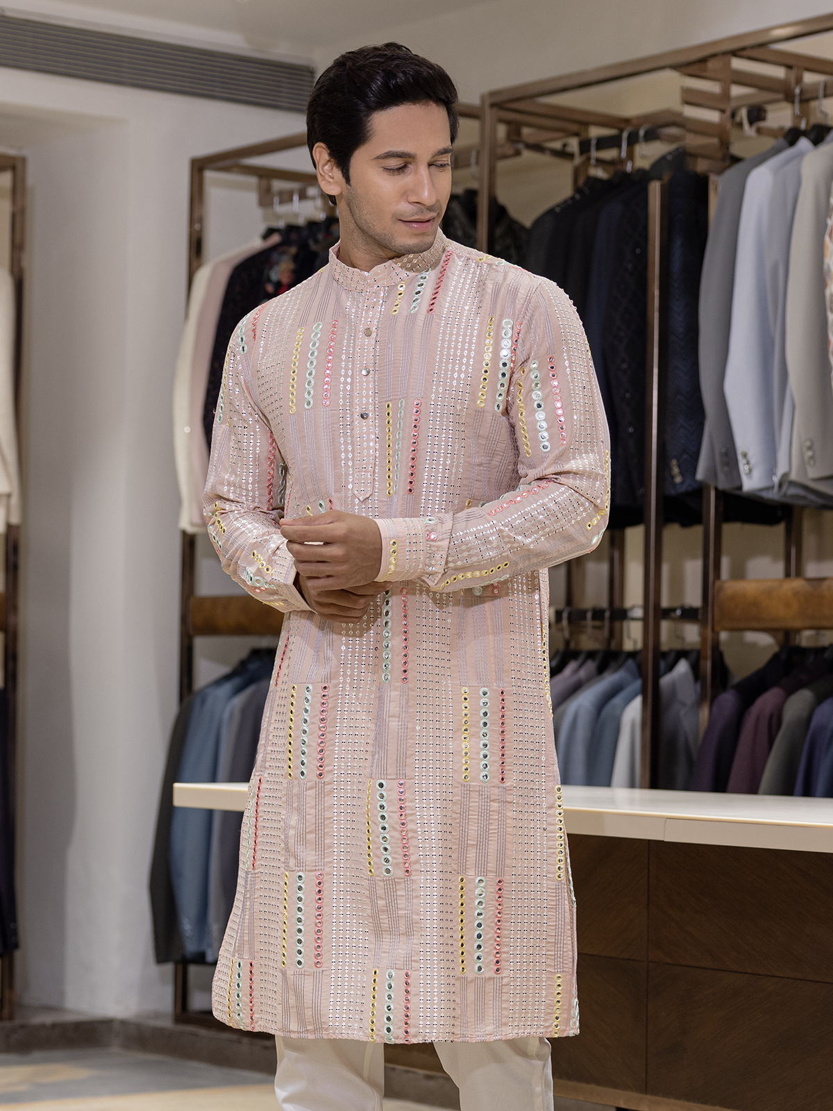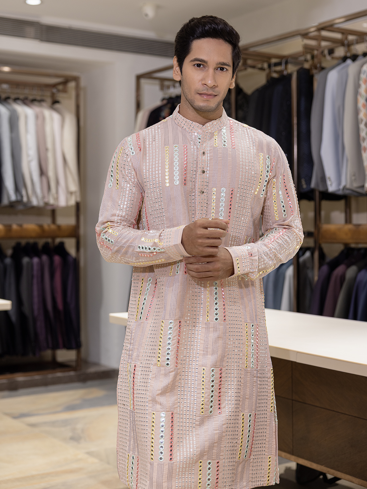 Radiance in peach, this cotton kurta glows with aabla and resham work. Styled with a mandarin collar and full sleeves, it reflects traditional charm and cultural grace, making it a refined choice for festive gatherings and joyful celebrations.