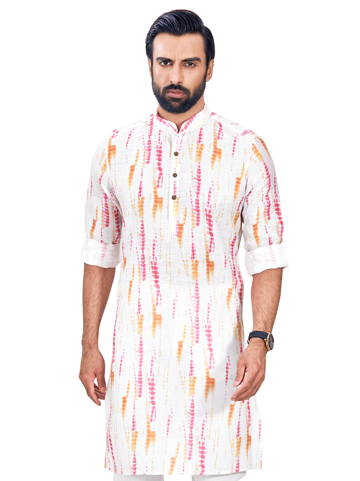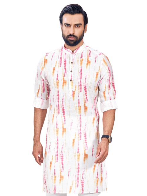 Introduce a contemporary twist to traditional Indian ethnic wear with this pink and white cotton kurta. The shibori print and features such as the mandarin collar, full sleeves and half buttoned placket make it a delightful addition to your festive wardrobe.