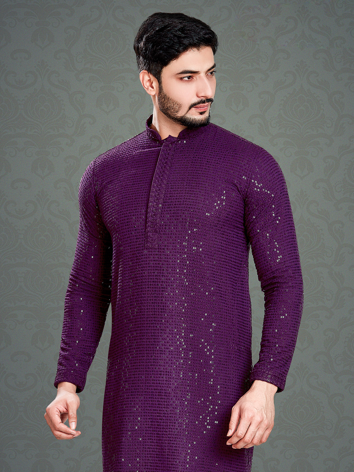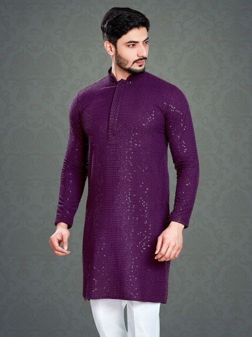 Versatile and eye catching, this purple cotton kurta with embroidery, resham and sequins work. Features a mandarin collar and full sleeves, this kurta makes for the perfect festive look.