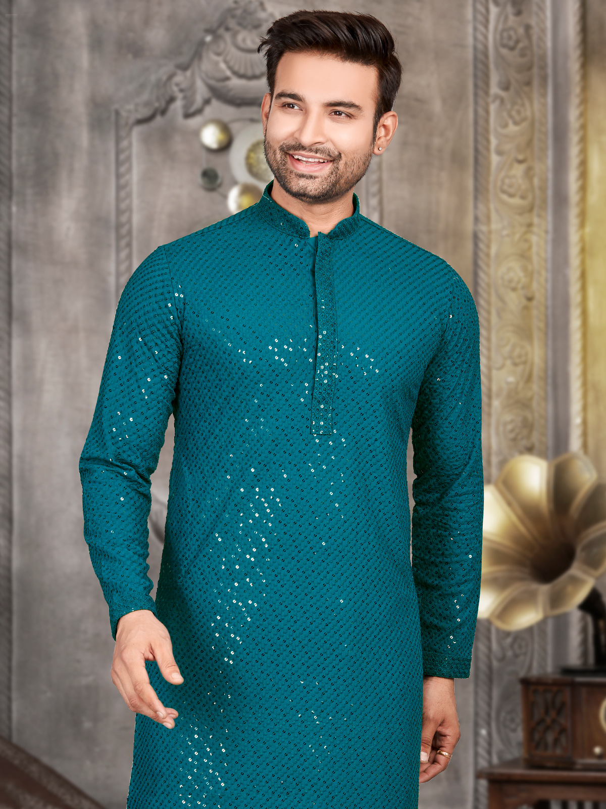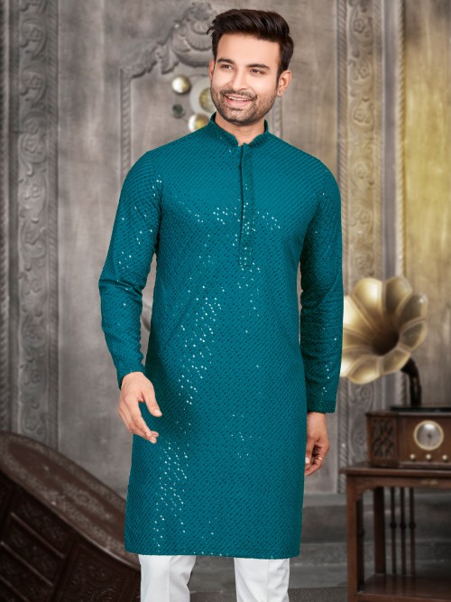 The rama blue cotton kurta for men features full sleeves and comfortable mandarin collar that offer style and ease of movement. The embroidery work is attractive.