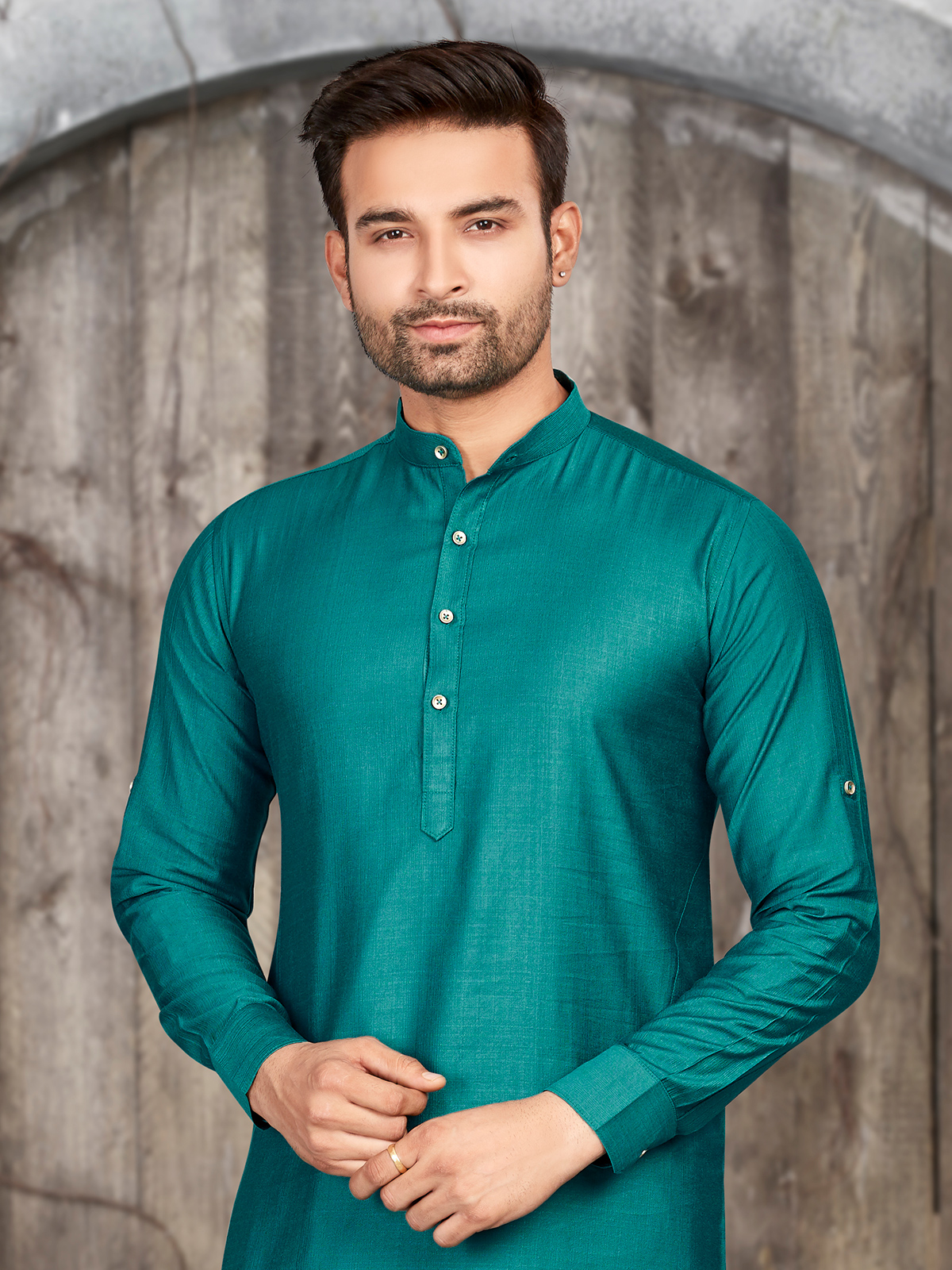 This rama green silk plain kurta lets you flaunt your taste in fashion. It features a mandarin collar and full sleeves for a trendy look.