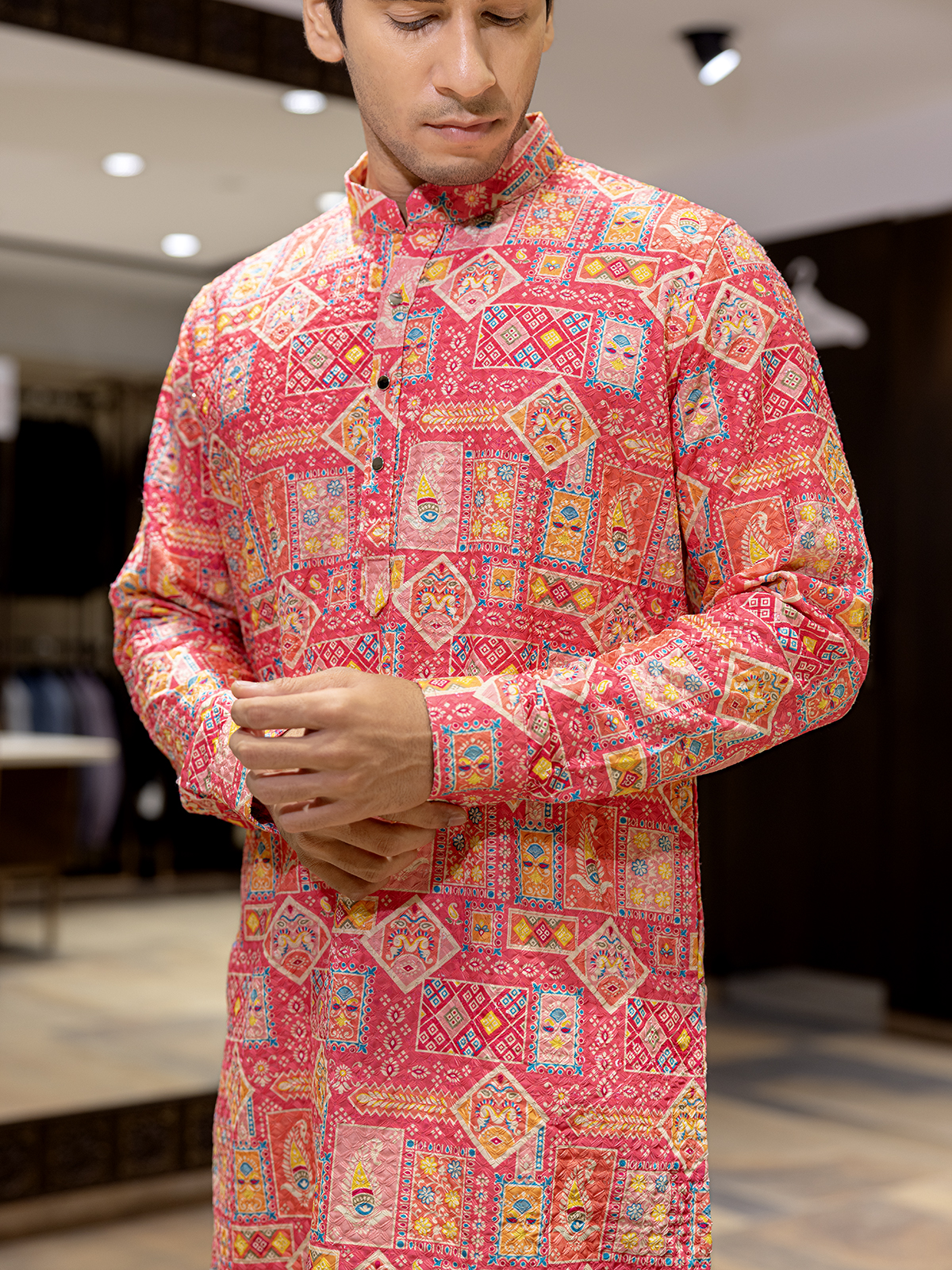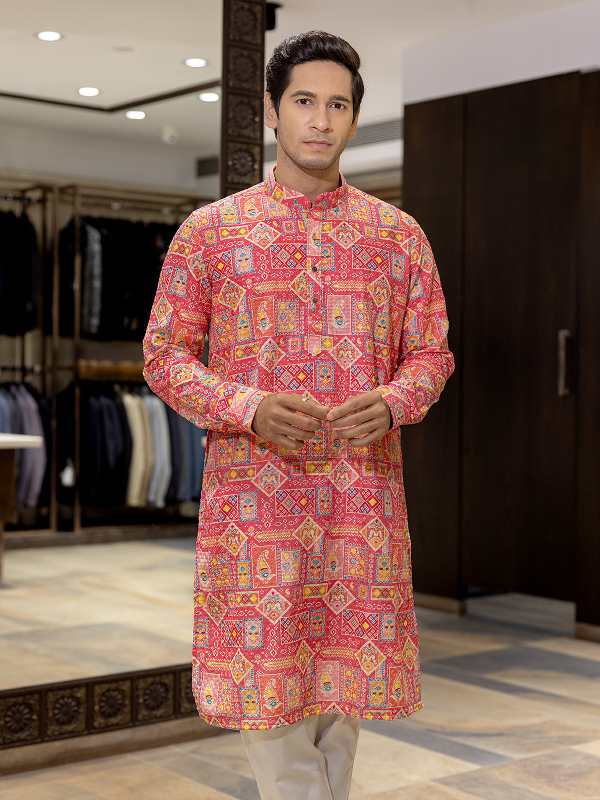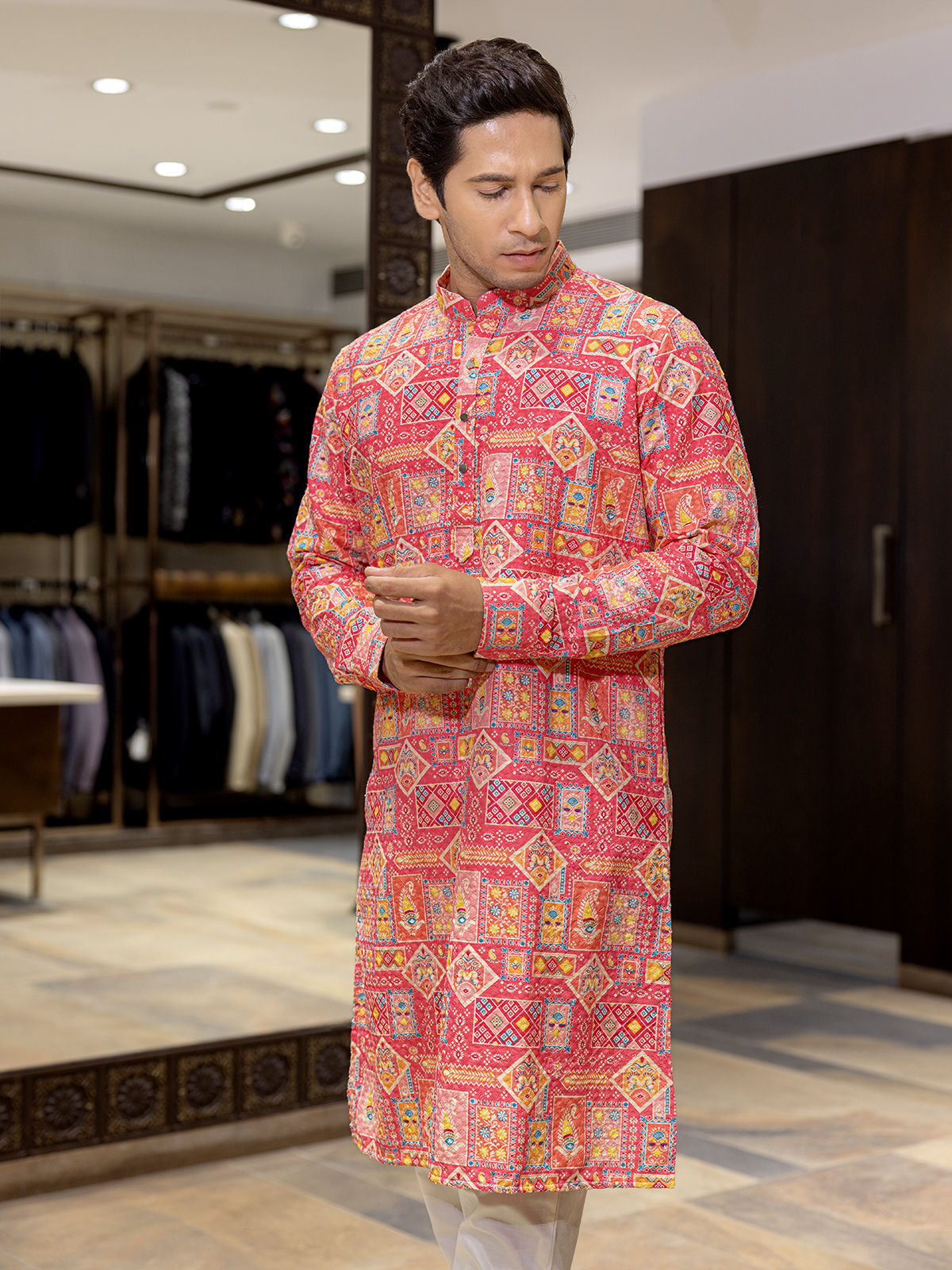 Elegance in red, this cotton silk kurta features printed detailing with thread and sequin work. Complete with a mandarin collar and full sleeves, it offers festive vibrance and ethnic allure, perfect for family functions and cultural occasions.