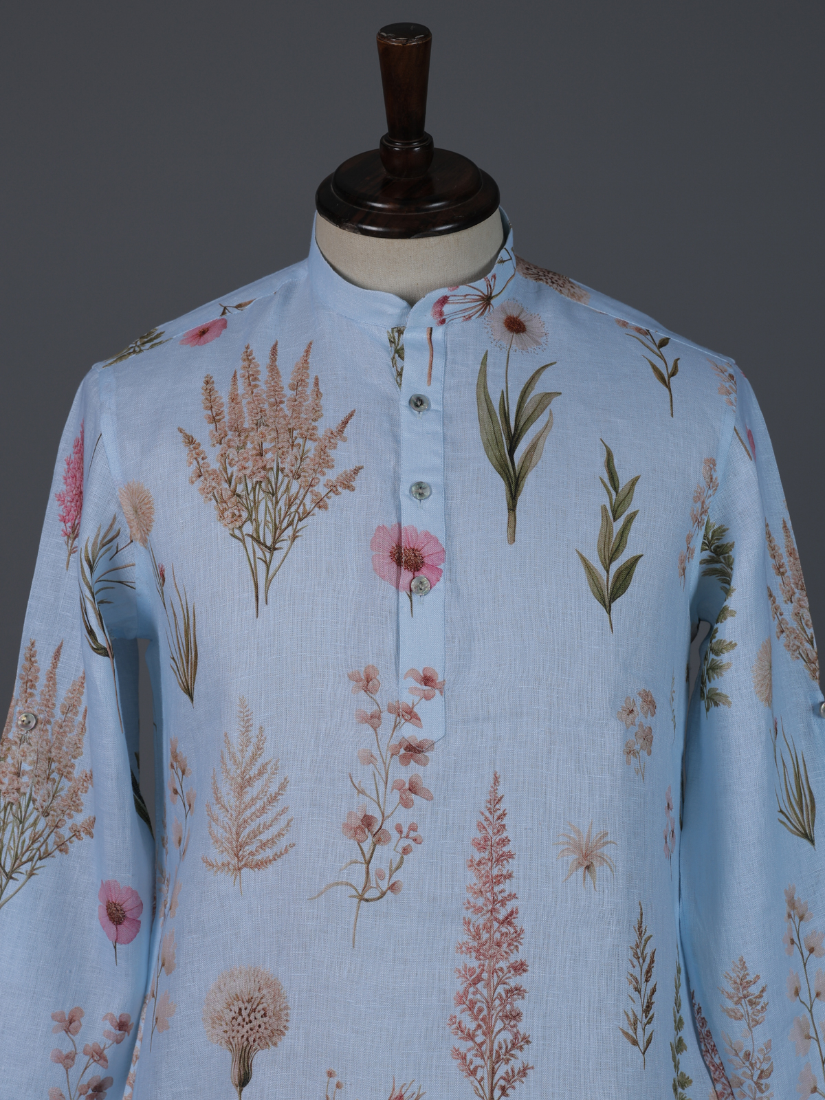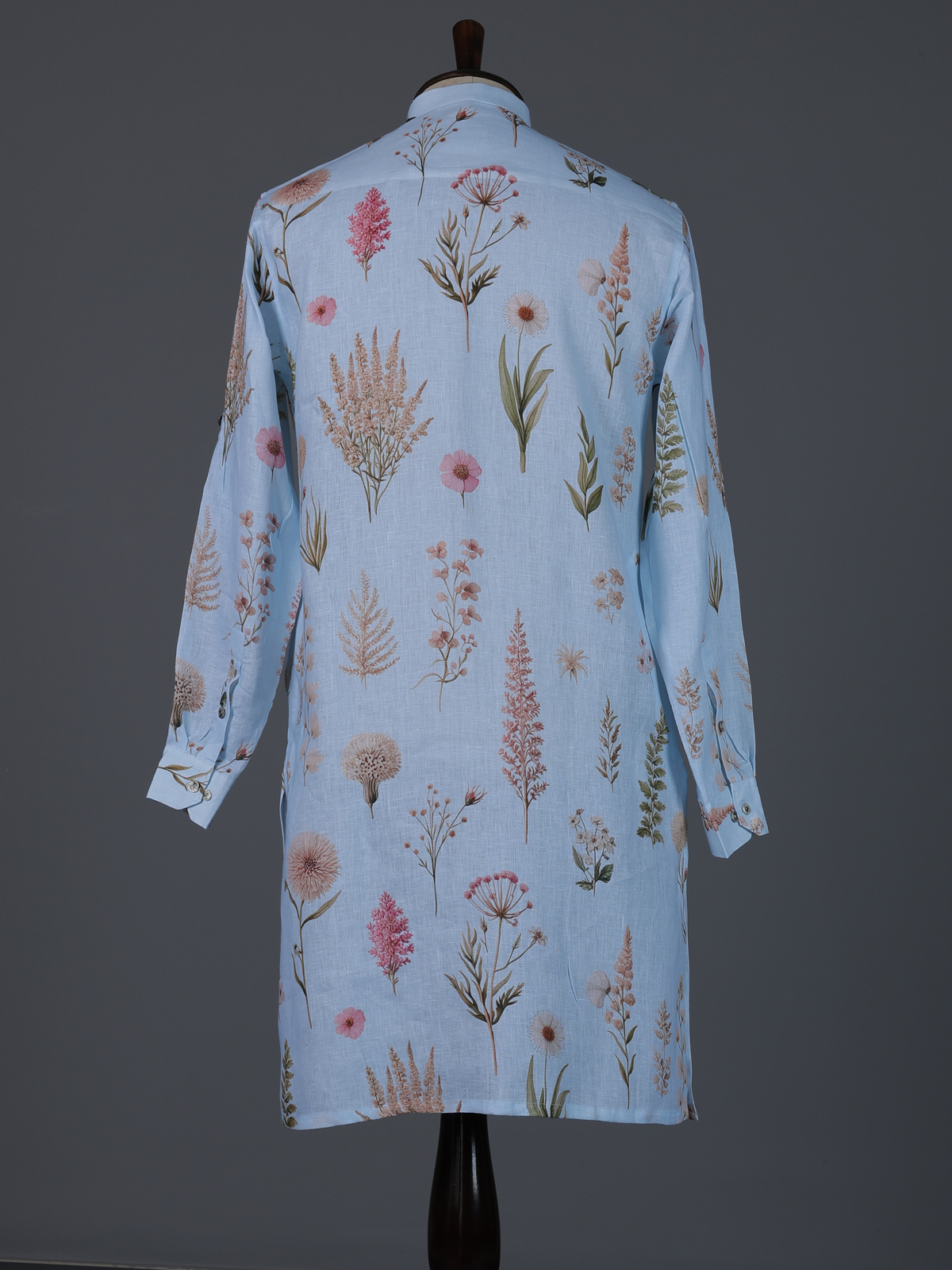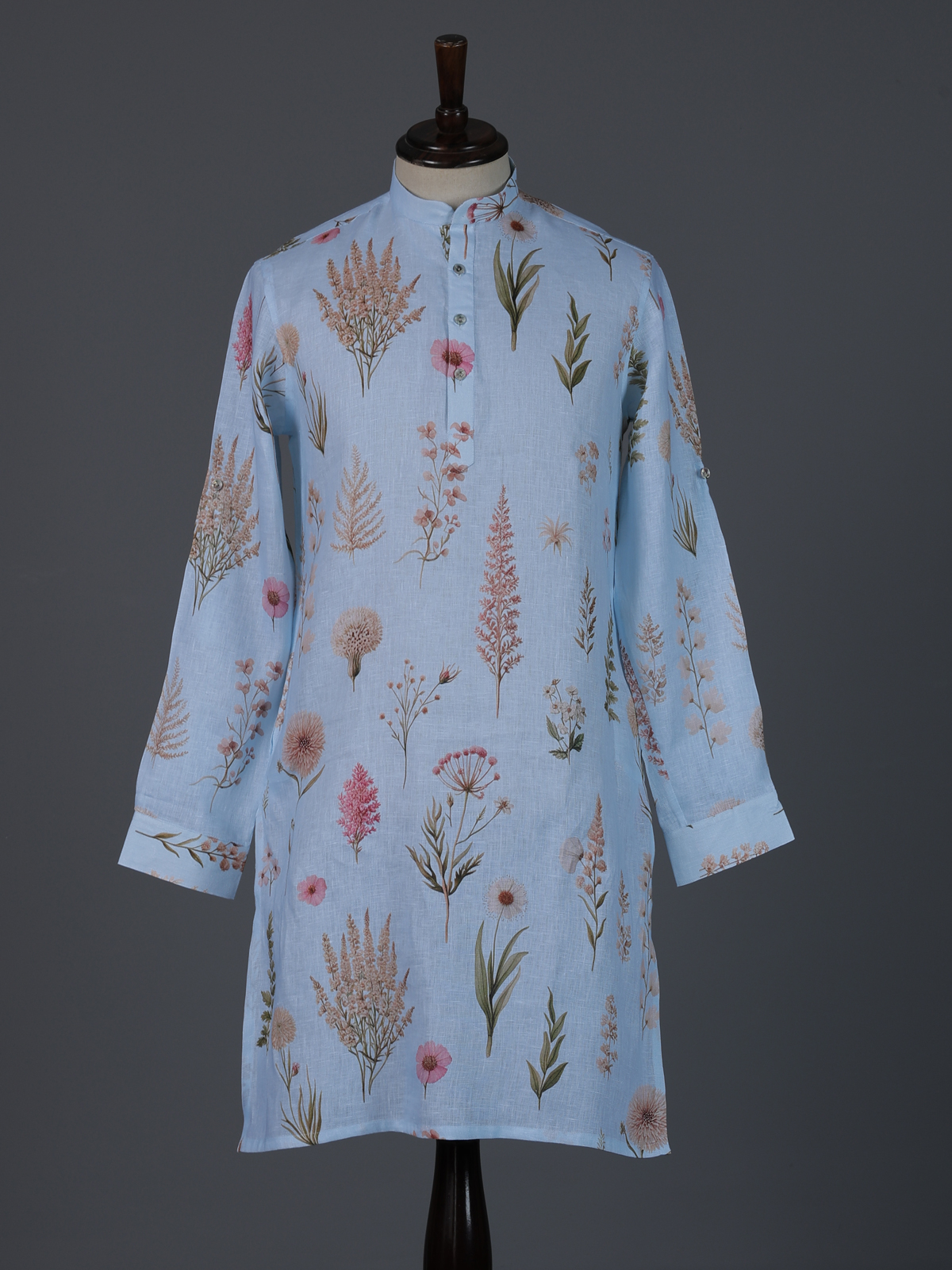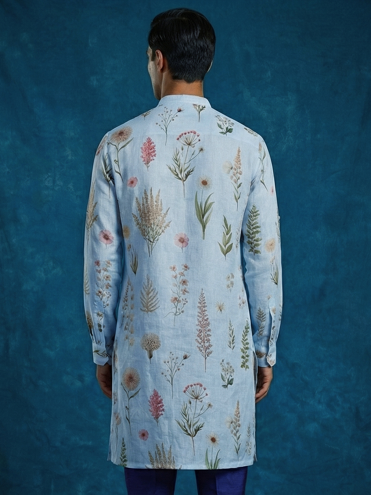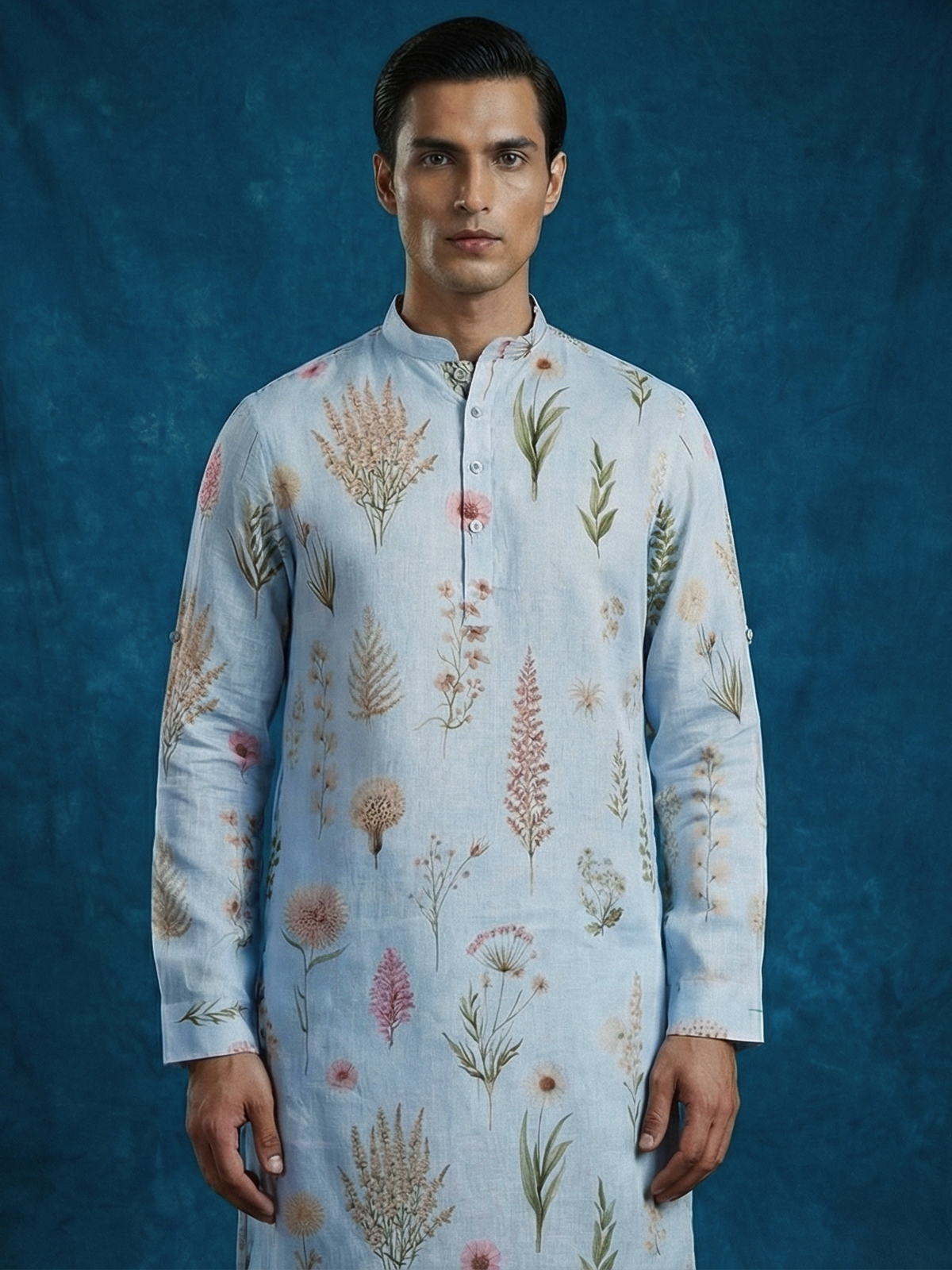 Fresh and soothing sky blue cotton linen kurta. Showcases graceful floral prints that enhance its festive elegance. Styled with a chinese collar, it creates a refined and modern silhouette. Lightweight and comfortable. It is ideal for eid festivities and daytime celebrations.