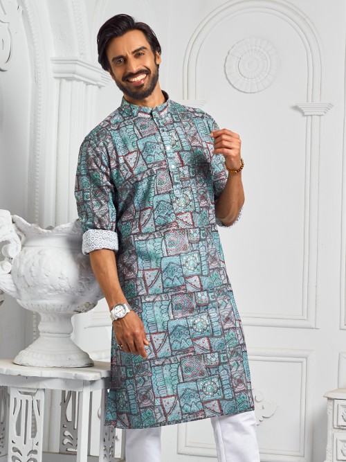 Elevate your style quotient with the stone blue silk printed kurta. Adorned with intricate sequins and resham work, it exudes elegance effortlessly. Featuring a mandarin collar and full sleeves, it promises a refined appearance.