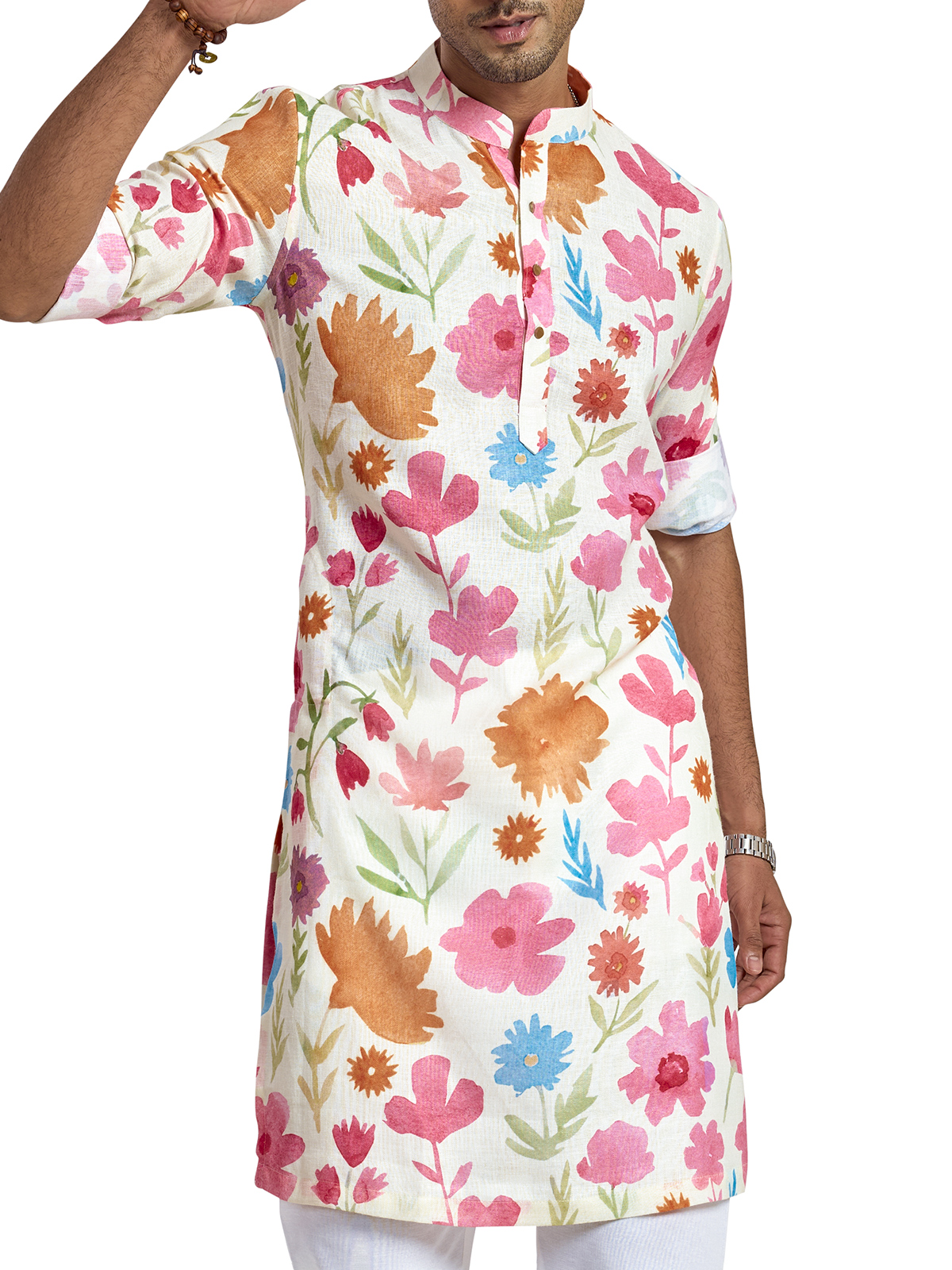 Woven in breathable cotton silk, this white floral printed kurta exudes easy sophistication and gentle charm. The Chinese collar and full sleeves add refined poise. Perfect for vibrant festive moments, it pairs beautifully with pants or jeans for a serene yet modern ethnic look.