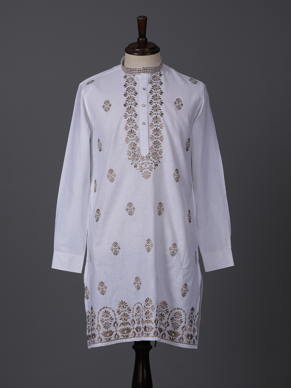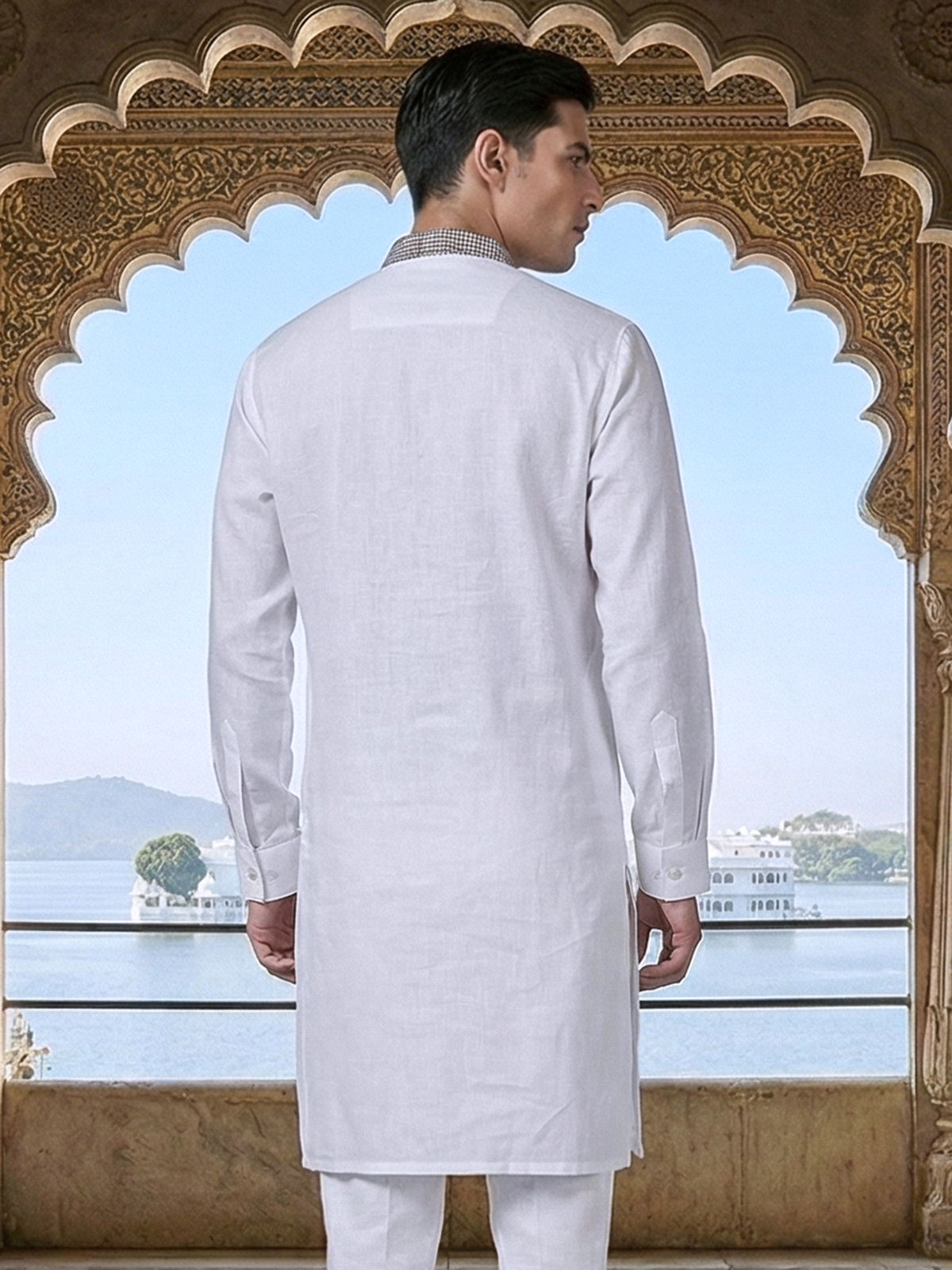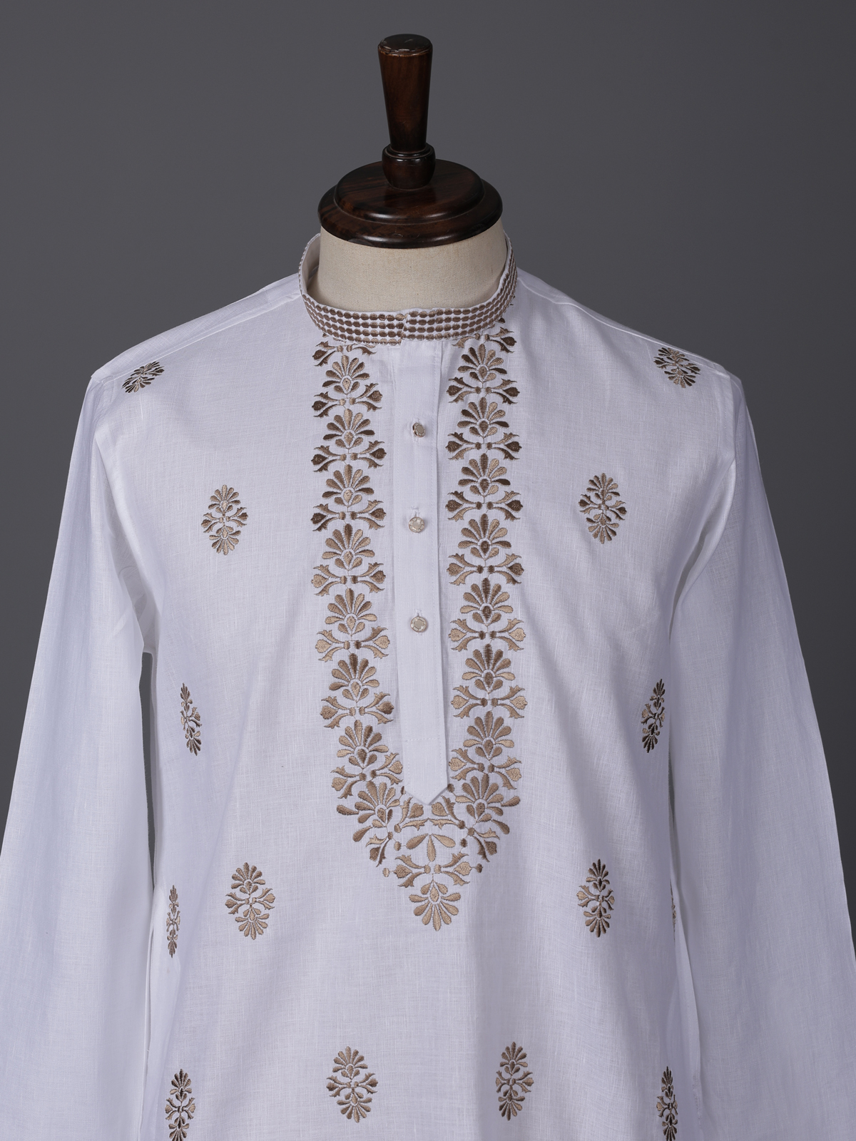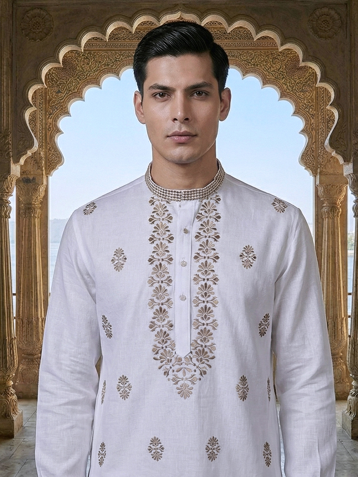 White Linen Embroidered Elegant Wedding Festive Kurta
