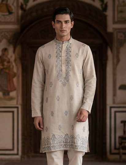 Pure white highlight the sophistication of this linen kurta designed for wedding and festive wear. Enhanced with fine embroidery, it offers a clean and elegant aesthetic. The chinese collar adds modern structure. While the lightweight fabric ensures comfort. Perfect for celebrations, this kurta creates a refined and graceful ethnic statement.