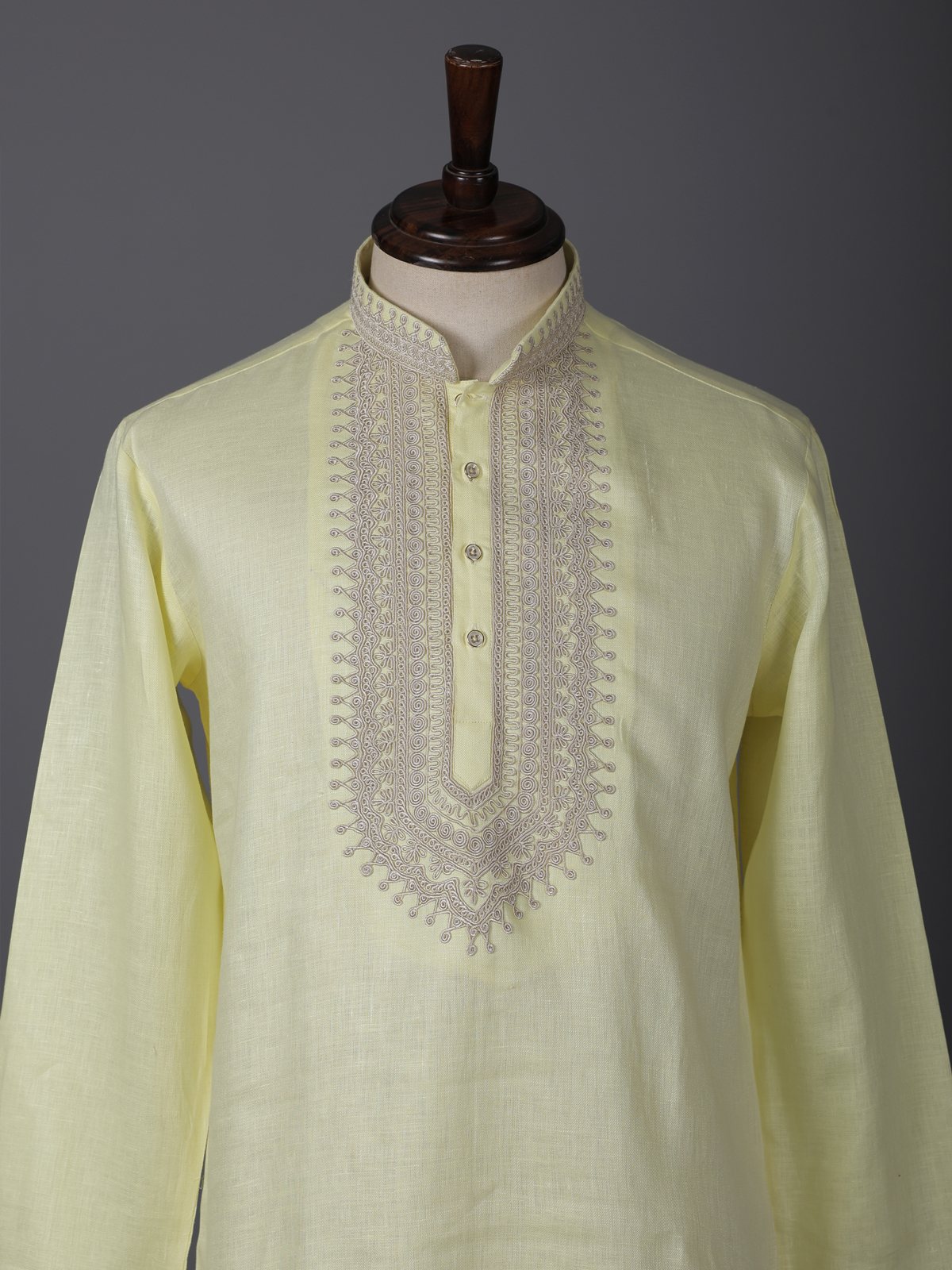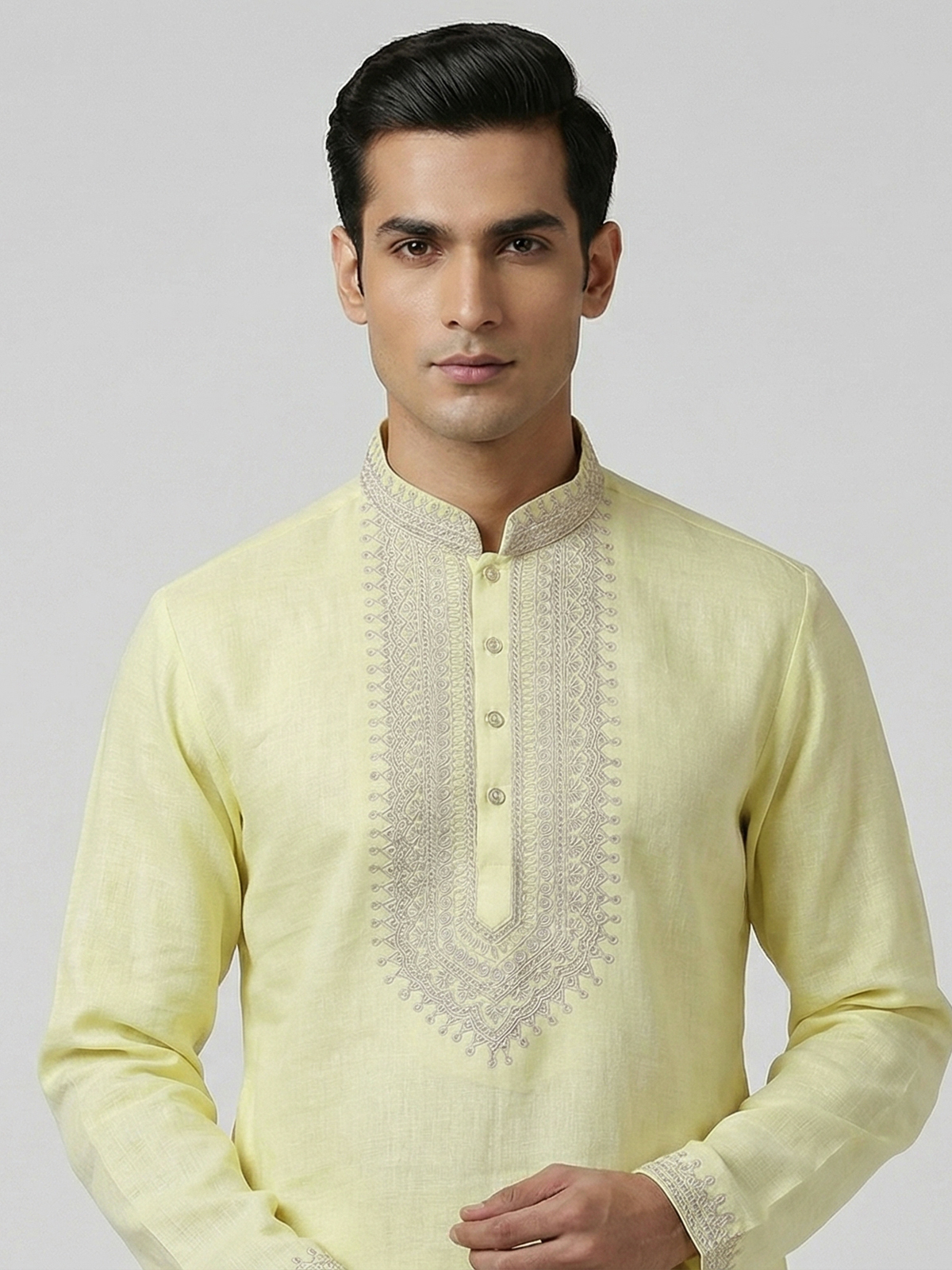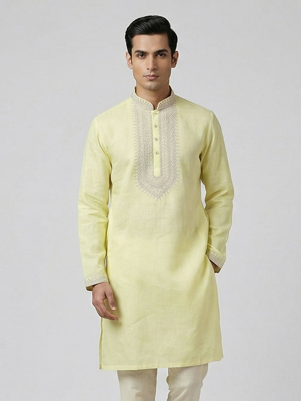 Cheerful yellow shades bring vibrant charm to this cotton linen kurta designed for festive occasions. Detailed with fine thread work, it highlights traditional artistry with a minimal appeal. The chinese collar enhances its structured elegance. While the breathable fabric ensures comfort. Ideal for haldi, sangeet and celebrations, this kurta offers a bright and refreshing ethnic style.