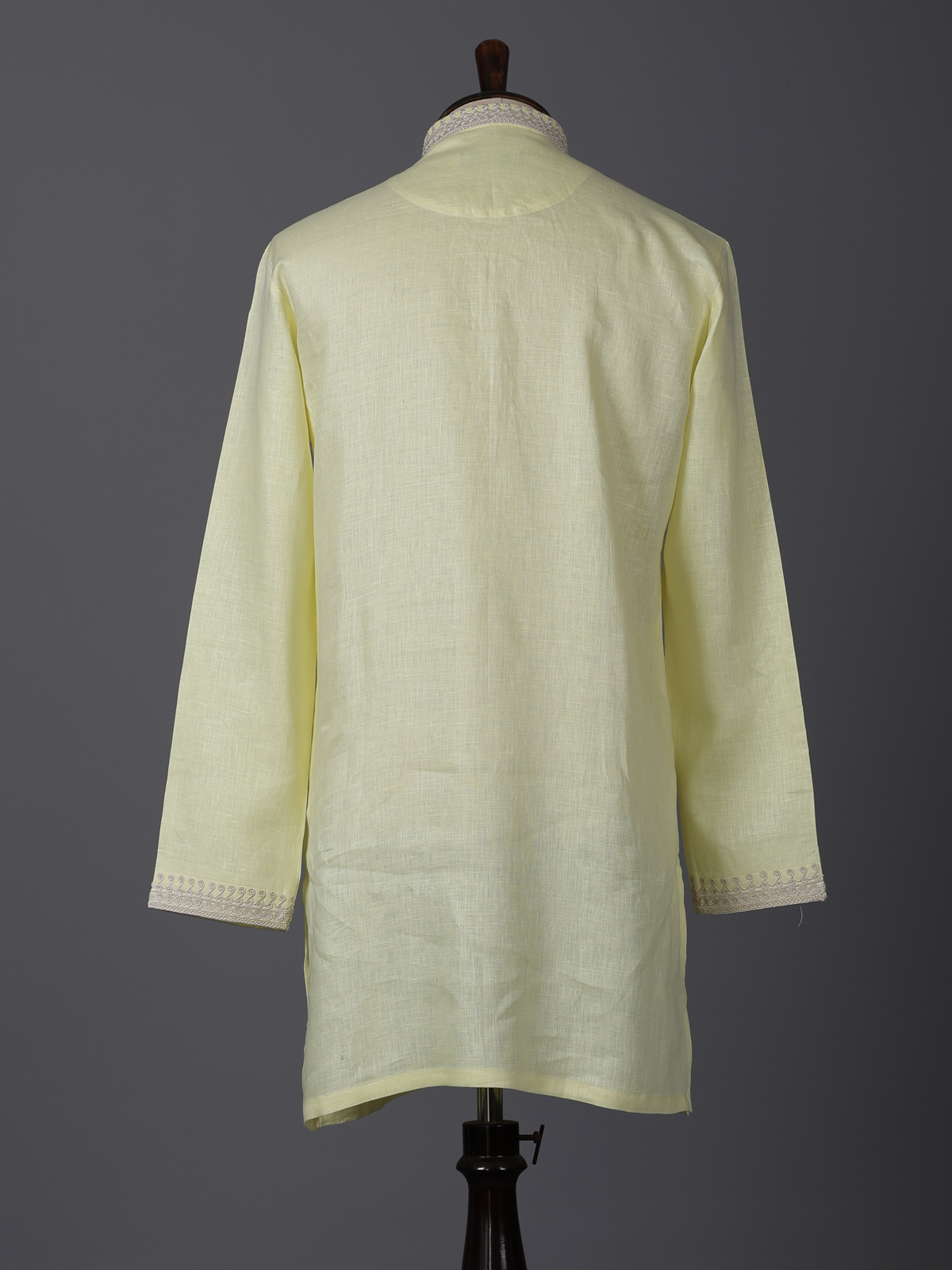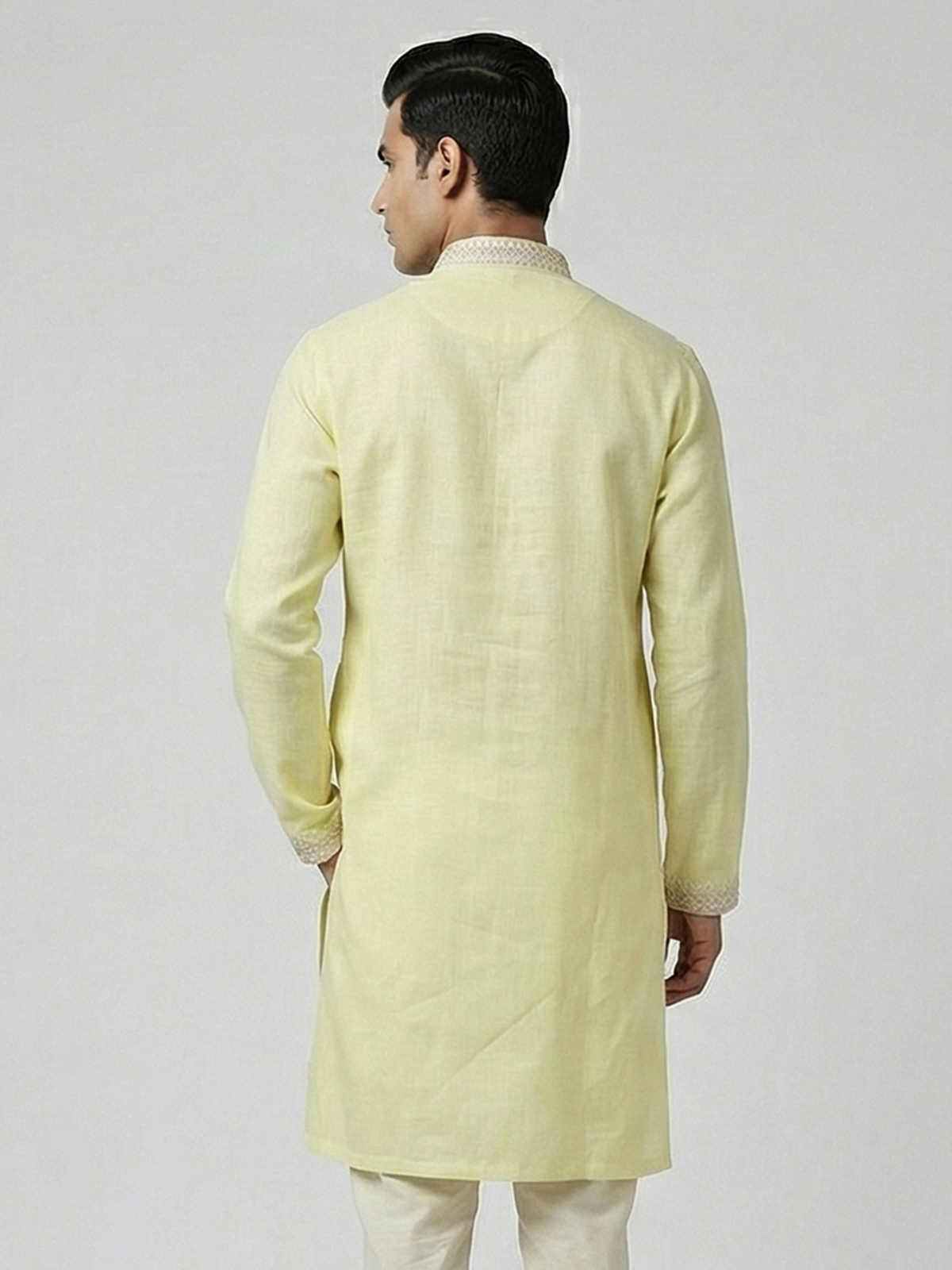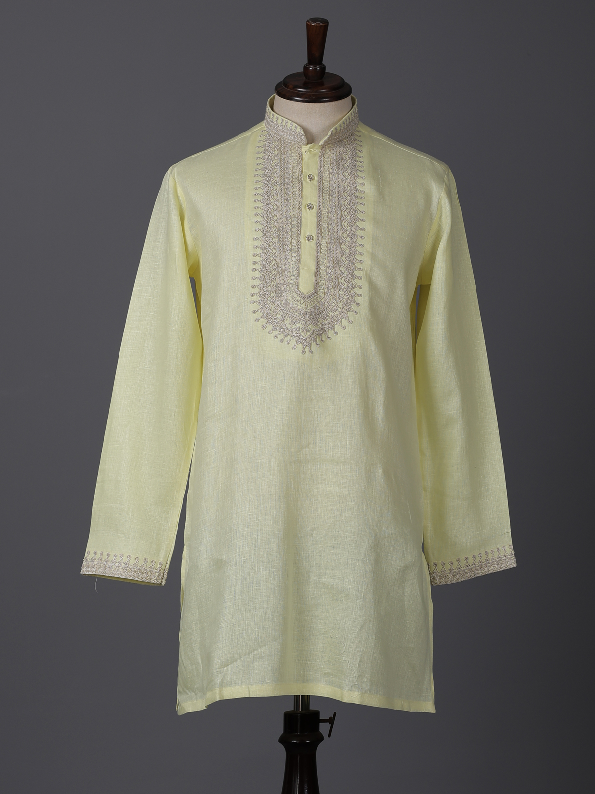 Cheerful yellow shades bring vibrant charm to this cotton linen kurta designed for festive occasions. Detailed with fine thread work, it highlights traditional artistry with a minimal appeal. The chinese collar enhances its structured elegance. While the breathable fabric ensures comfort. Ideal for haldi, sangeet and celebrations, this kurta offers a bright and refreshing ethnic style.
