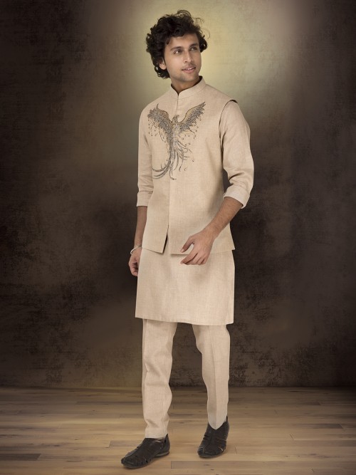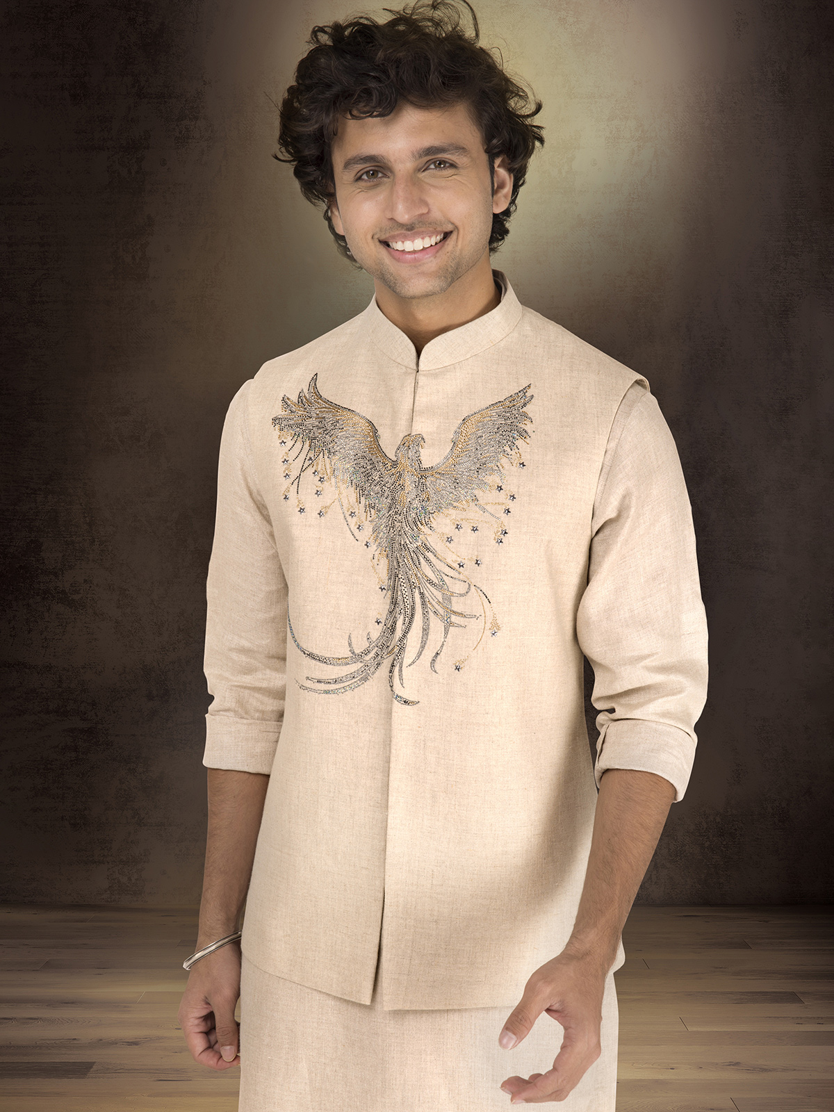In pure beige linen, this waistcoat set features delicate stone accents that lend understated grandeur. Its soft hue and refined charm make it ideal for festive or wedding wear. Paired with a pant, it blends comfort with effortless sophistication.