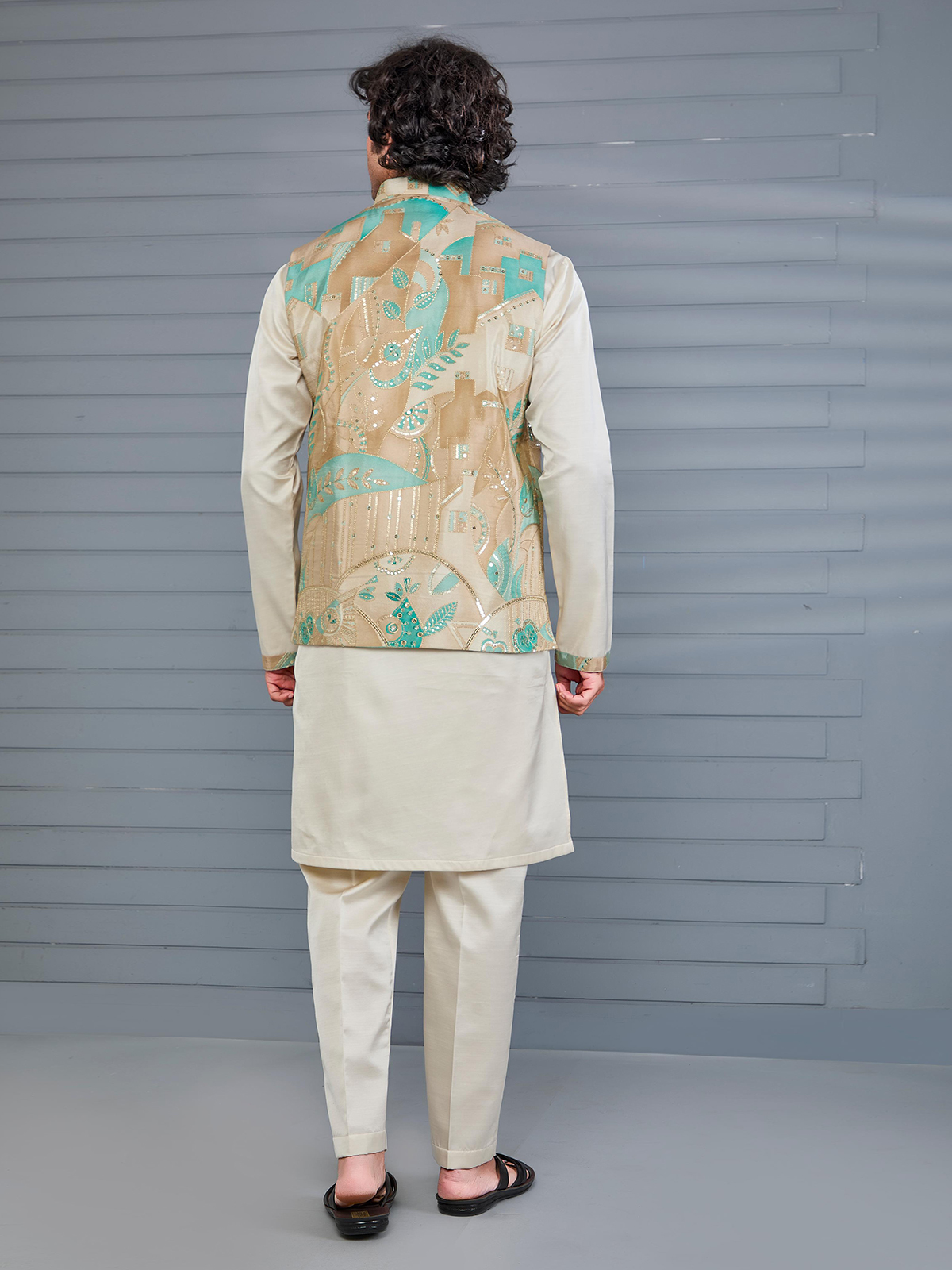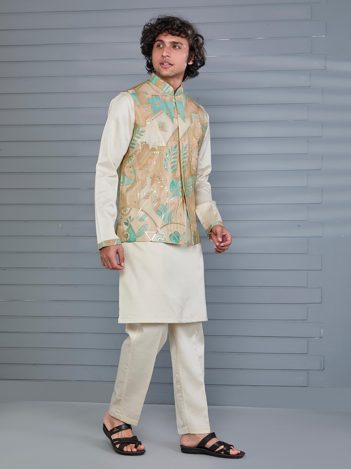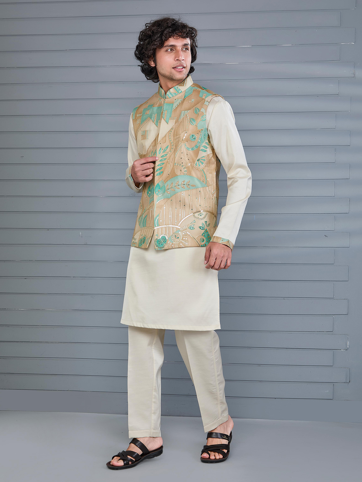 Gracefully designed in printed silk, this beige waistcoat is adorned with fine embroidery and sequin accents. Featuring a classic Chinese collar and paired with a matching pant, it delivers refined ethnic charm for weddings and festive receptions.
