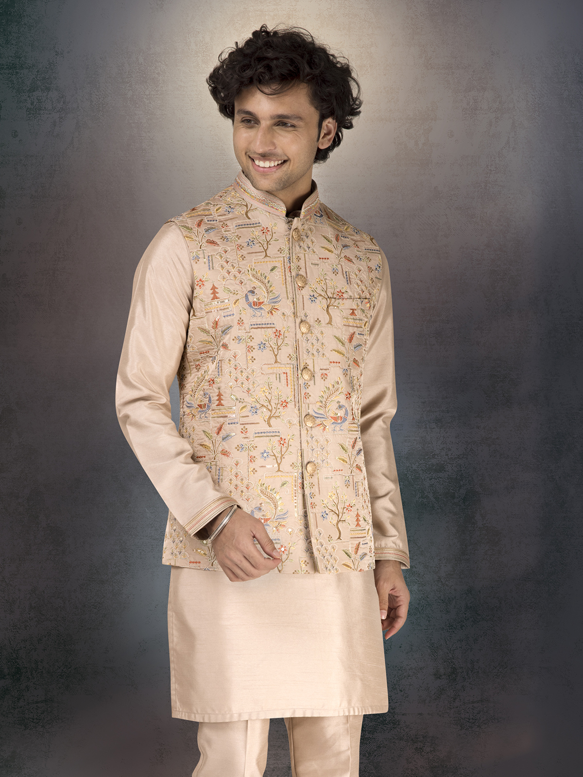 Beige silk gleams with festive grace in this waistcoat set adorned with delicate thread and sequins detailing. Its refined texture and modern appeal make it perfect for receptions and grand gatherings. Styled with a pant, it whispers elegance in every fold.