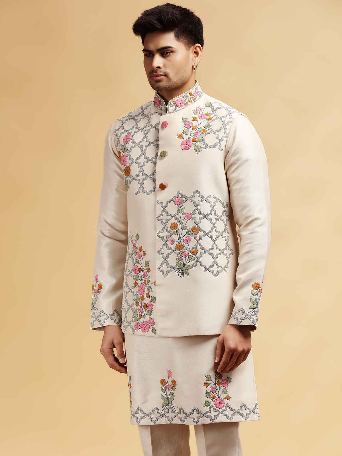 Beige Silk Thread Worked Waistcoat Set Wedding