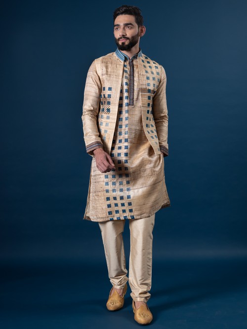 Stylish for weddings, this printed beige waistcoat pair was designed with refinement in mind. Crafted from high-quality silk fabric, it features exquisite embroidery. For a cohesive ensemble for any occasion, it includes a matching bottom.