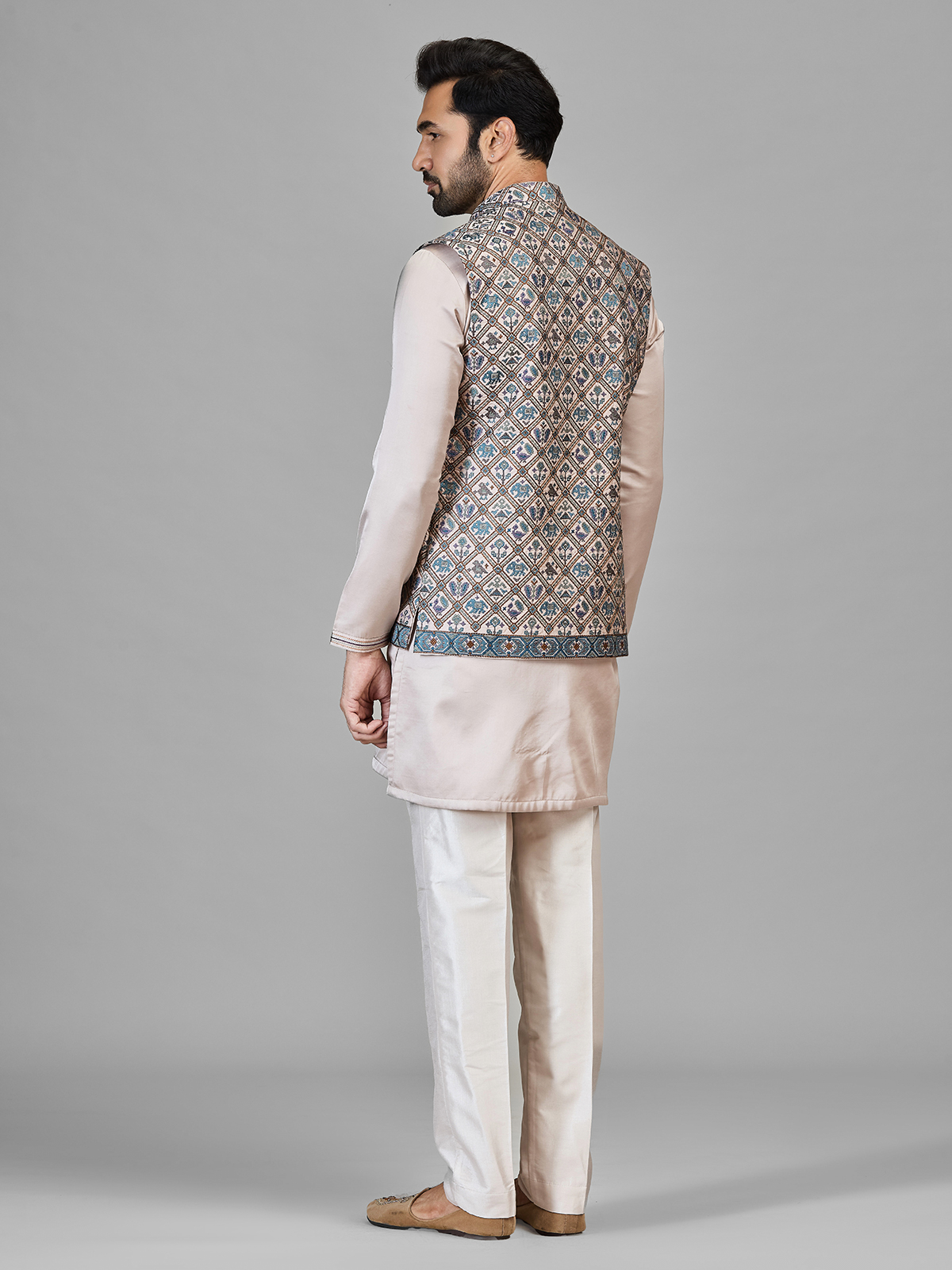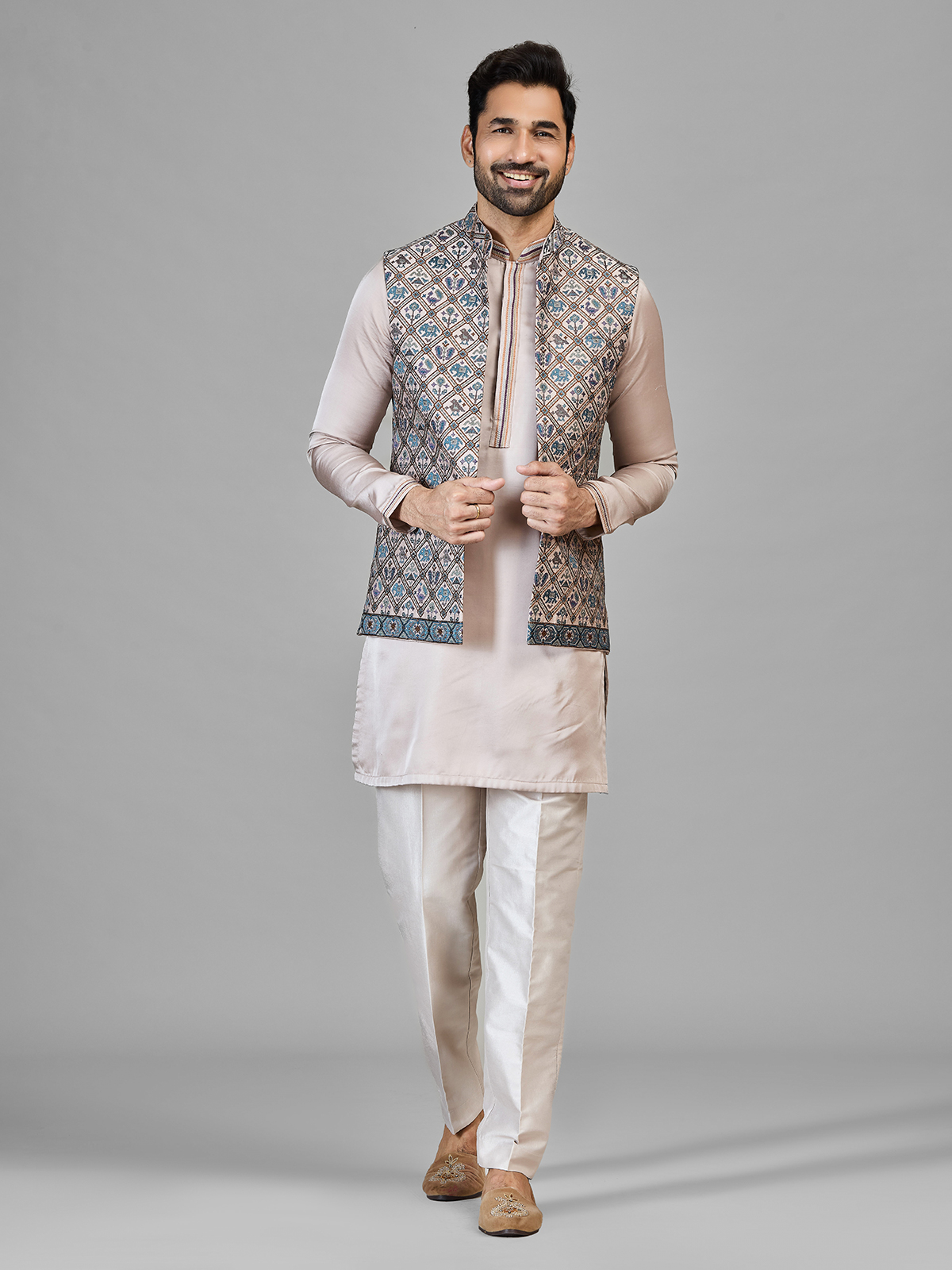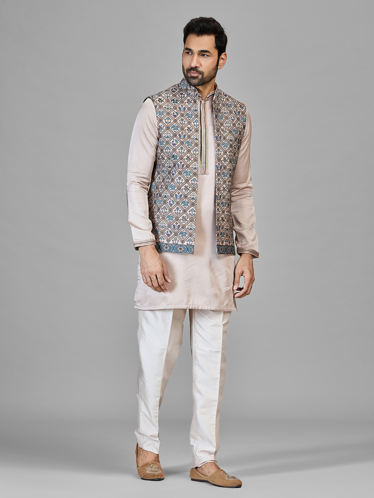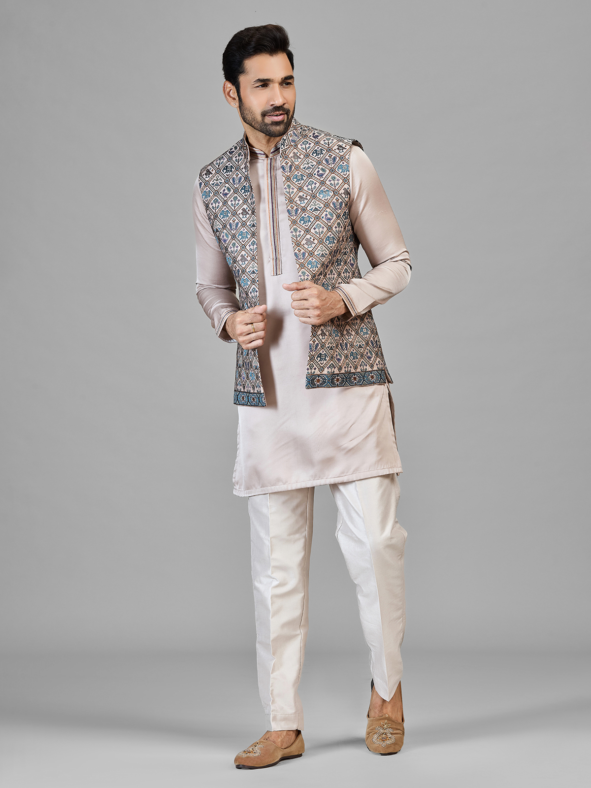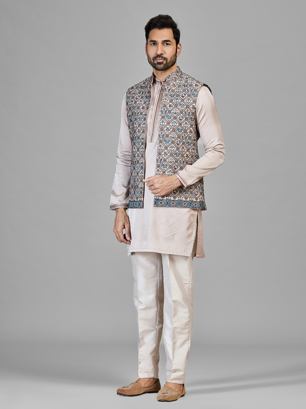 This stylish mens silk waistcoat set features a beautifully patterned sleeveless waistcoat layered over a soft beige kurta and paired with same toned bottoms. The waistcoat is adorned with intricate geometric and ethnic motifs with thread, adding a vibrant touch to the subtle base. Finished with a mandarin neckline, the ensemble is perfect for festive occasions, weddings, eid and traditional celebrations.