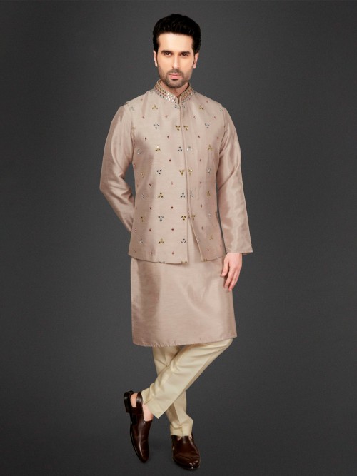 Make a statement in this beige festive waistcoat set for men made of cotton silk fabric. It features stunning resham and mirror work throughout the attire, with a stand collar, full-length sleeves, full buttoned placket, and vented hemline. Pair it with a bottom for a perfect outfit.