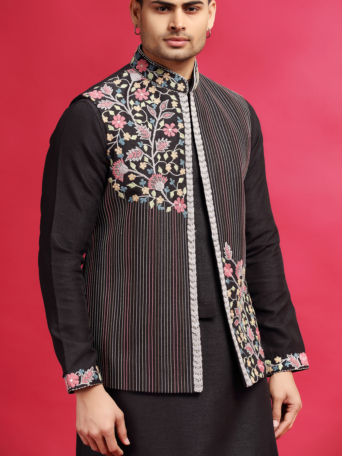 In deep black silk, this waistcoat set reveals masterful thread craftsmanship. The sleeveless cut and elevated chinese collar lend regal authority. Paired with coordinated pants, it resonates with timeless allure and impeccable sophistication—an ensemble of bold grace.