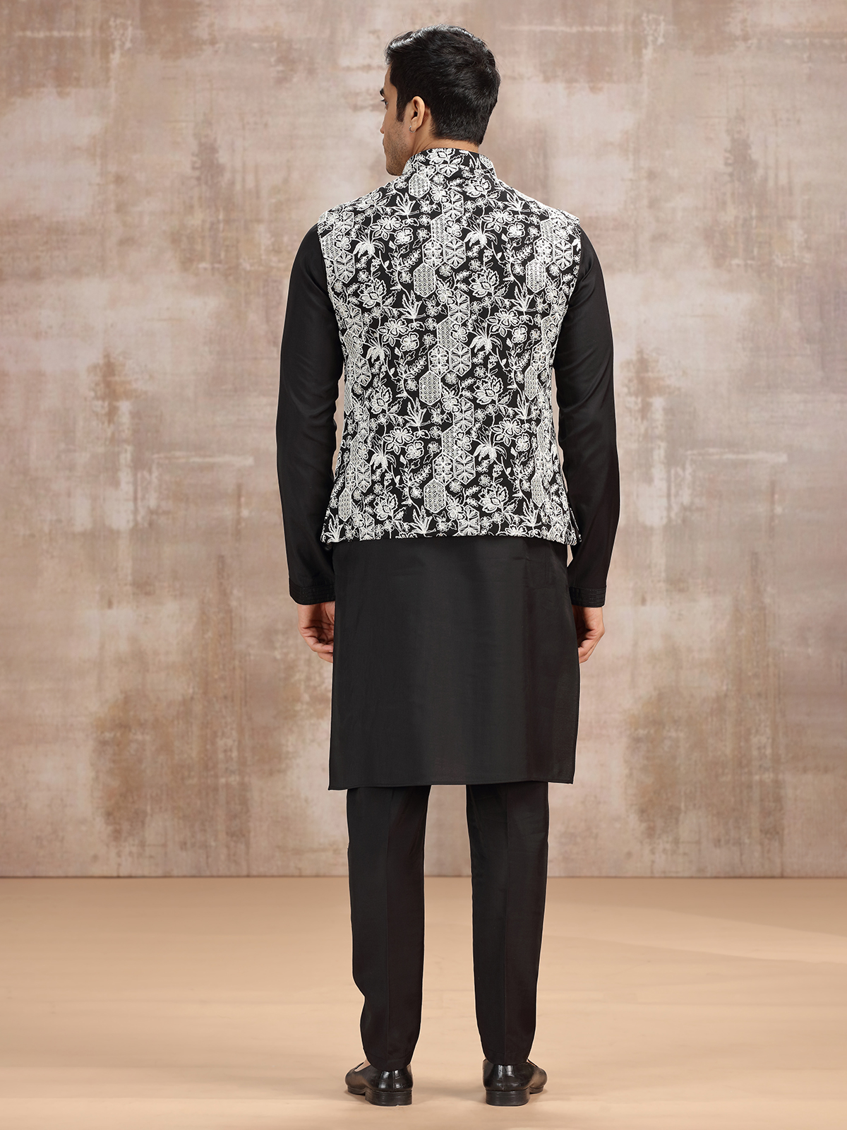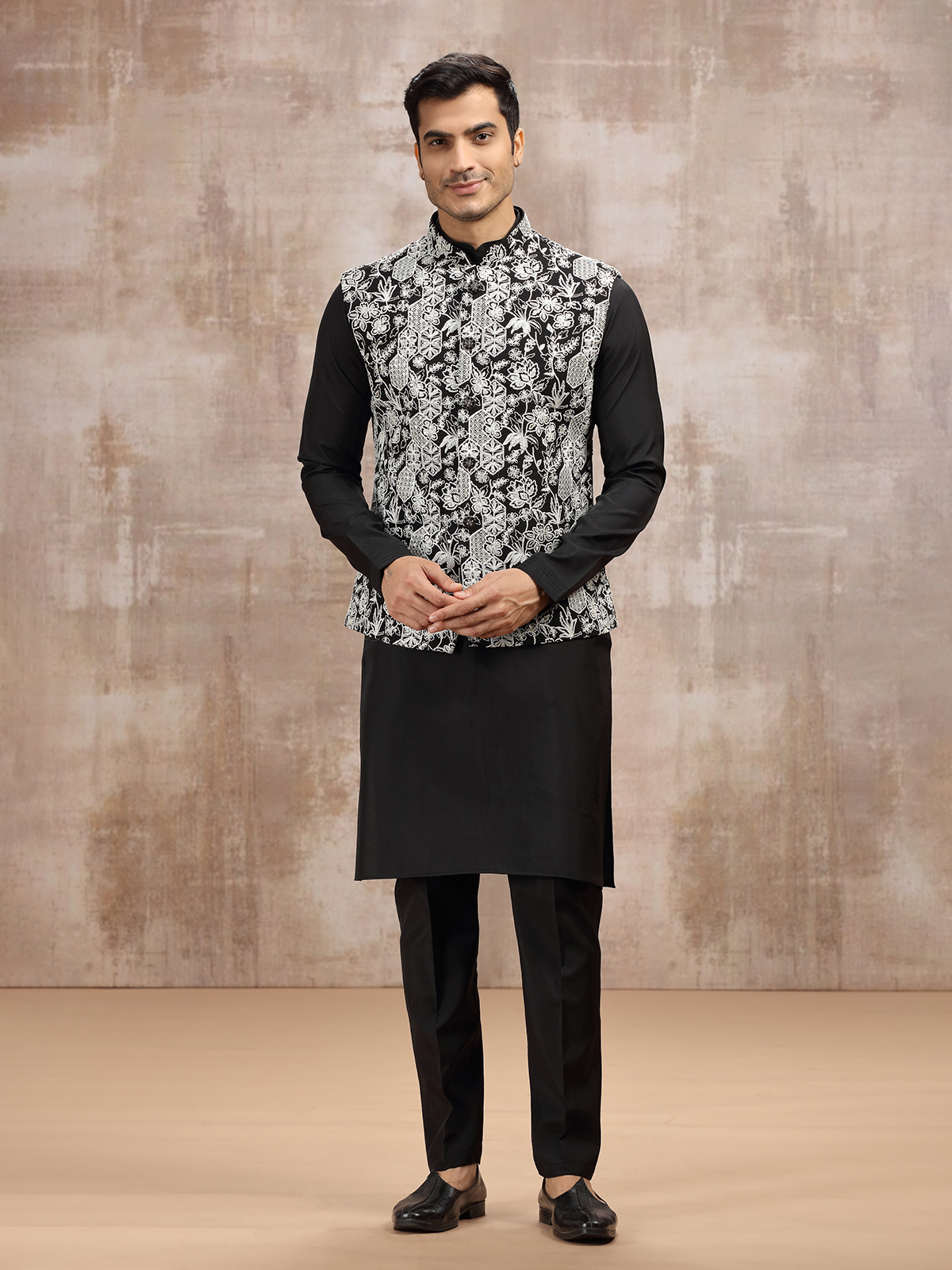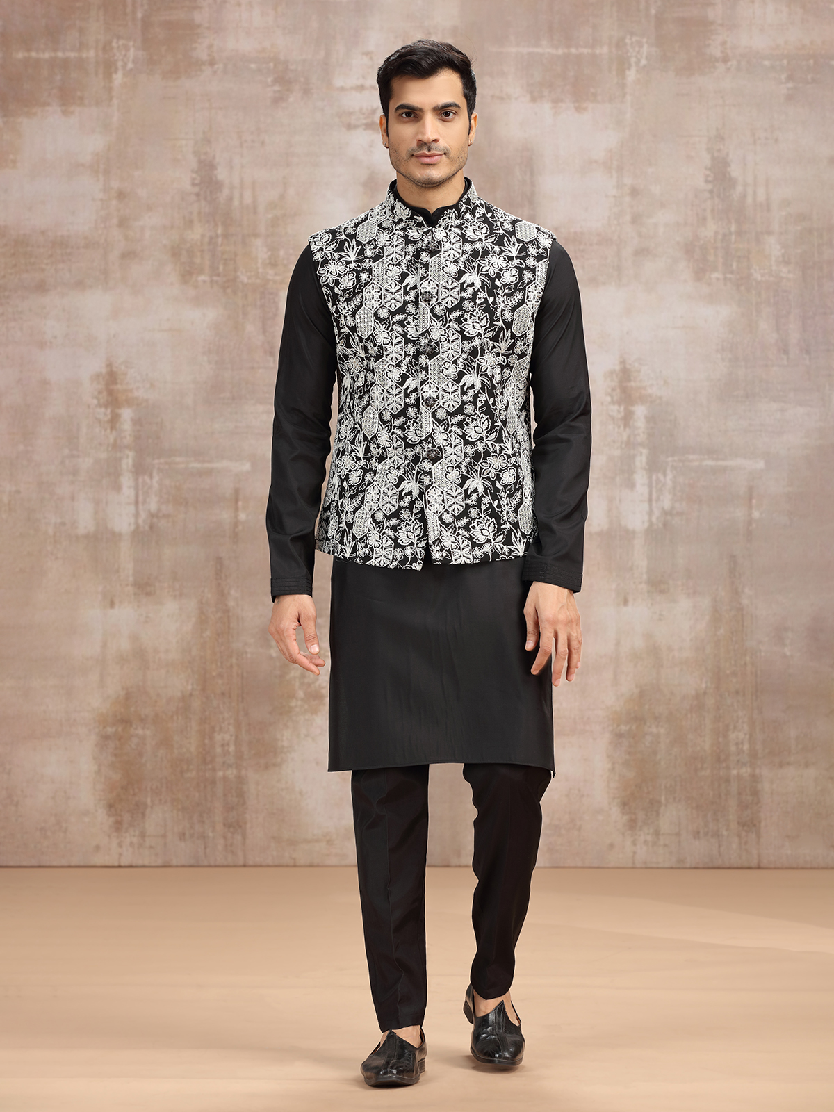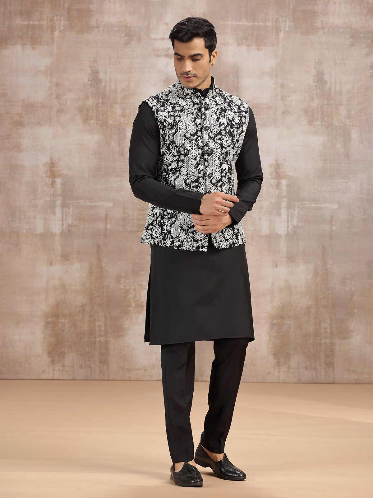 This black cotton silk waistcoat set, detailed with resham, thread, and sequins, reflects a touch of regal grace. The full sleeve kurta with stand collar is paired with a sleeveless waistcoat, creating an elegant balance. Accompanied by a pant, the attire is designed for weddings and receptions, blending traditional craftsmanship with a refined contemporary edge.