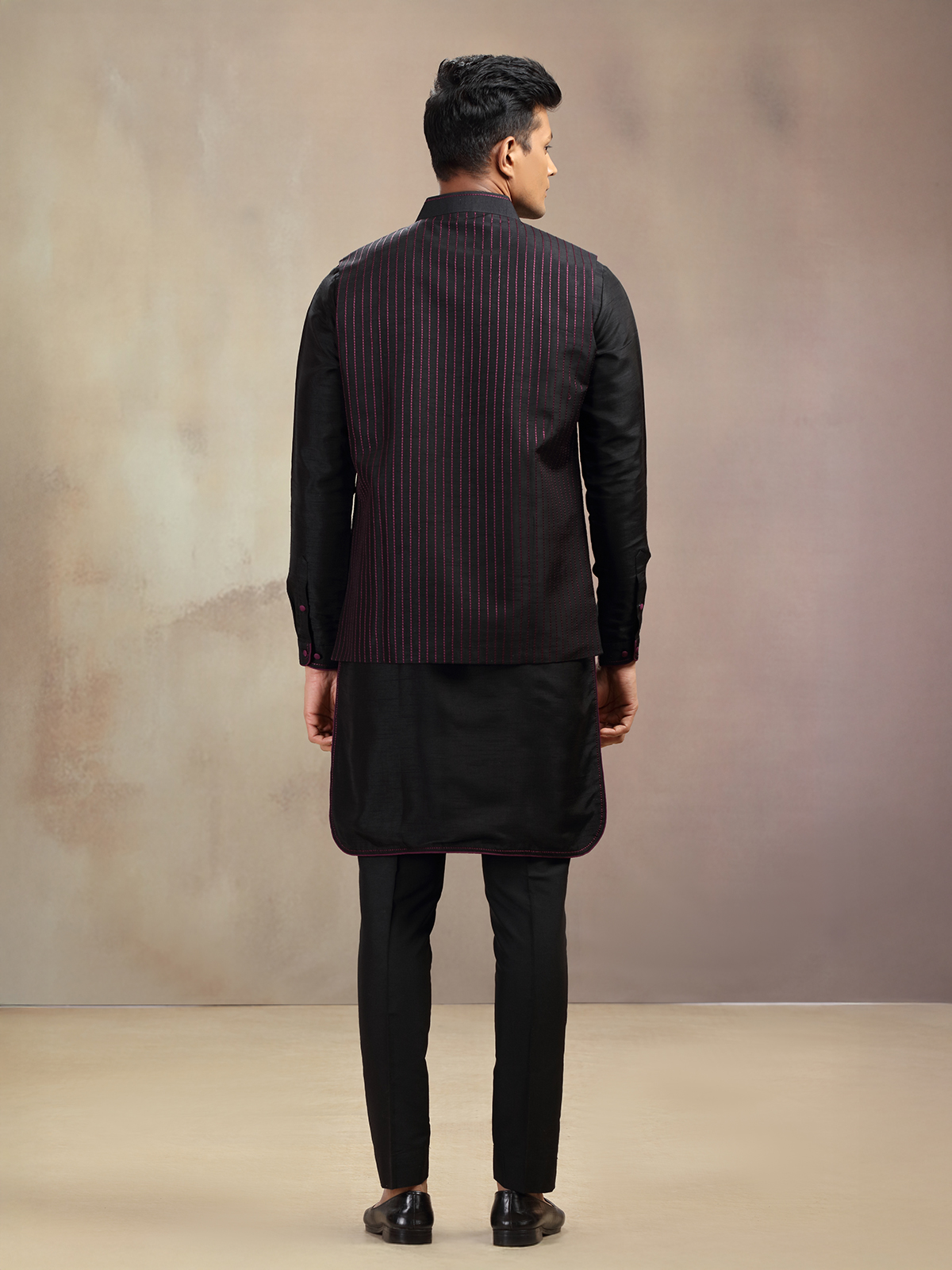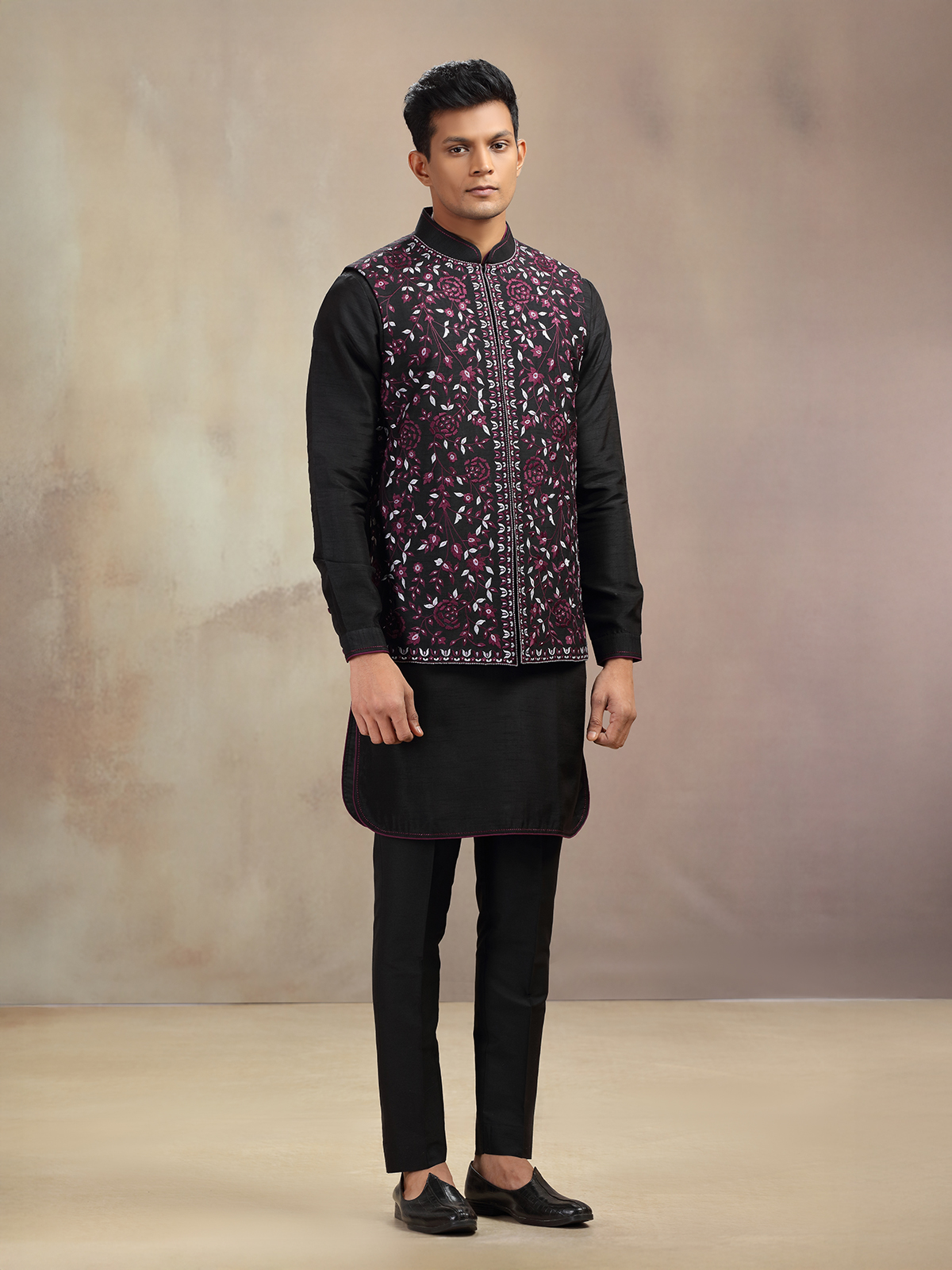Black cotton waistcoat set radiates classic sophistication, perfect for understated festive style. Fine embroidery flows gracefully over the fabric, blending tradition with modern flair. Designed with a mandarin collar, it pairs smoothly with a pant for a poised, stylish ensemble.