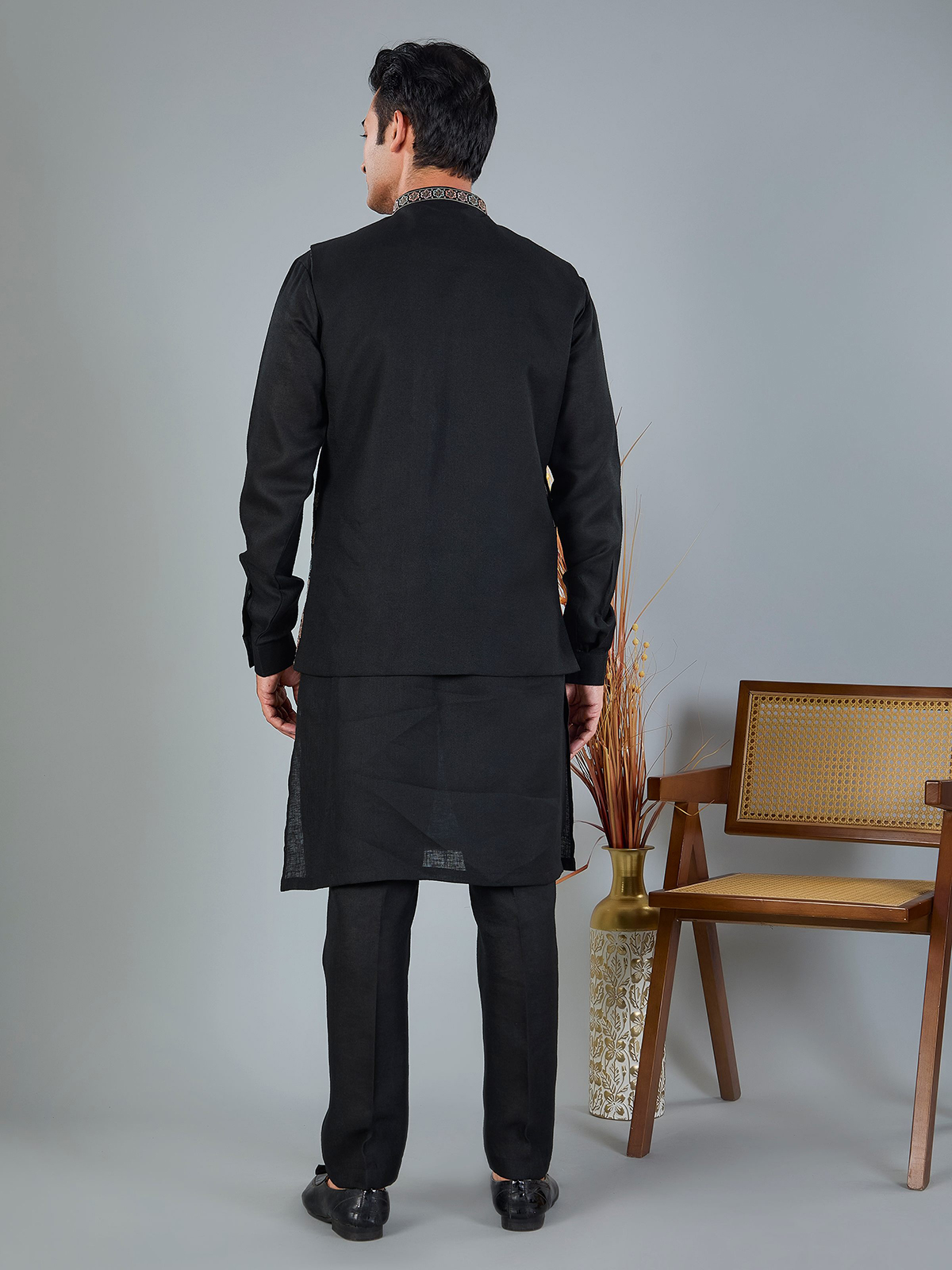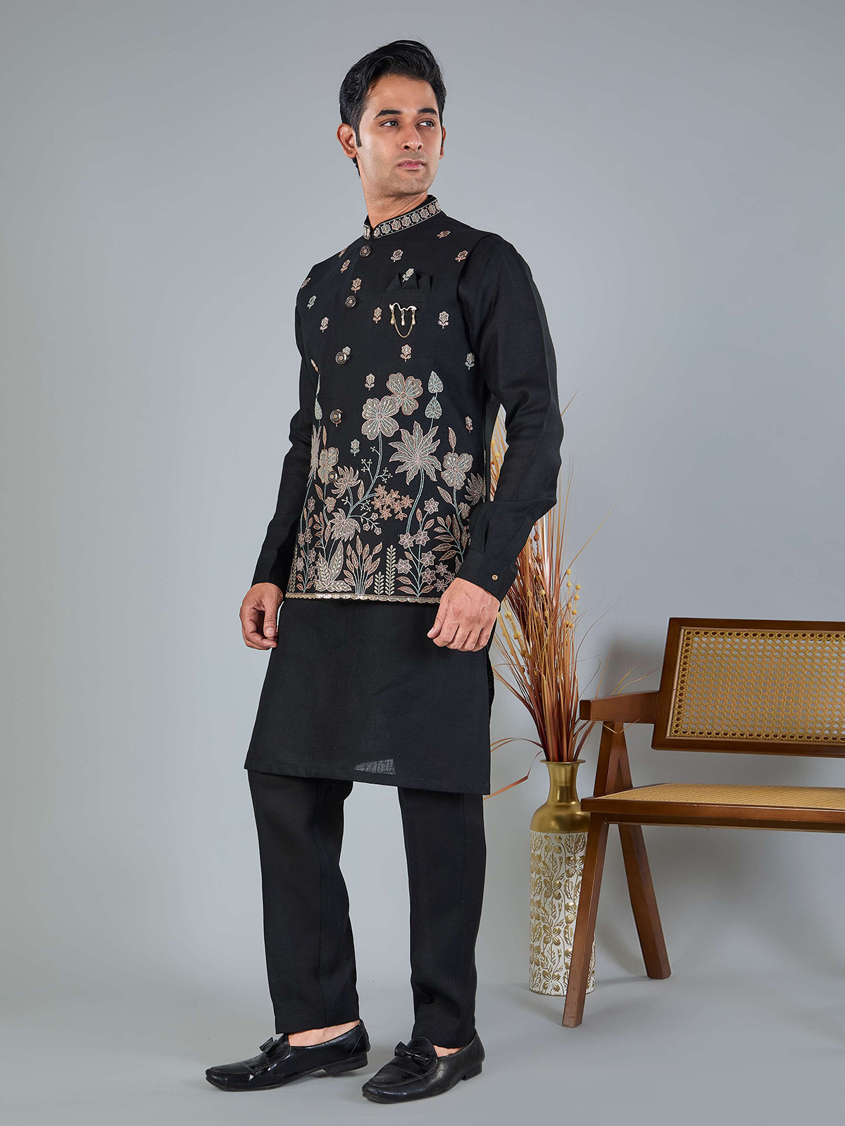 Sophisticated black silk waistcoat adorned with intricate embroidery and sequin detailing. Featuring a Chinese collar and matching pant, it creates a bold, elegant statement for weddings and grand reception evenings.