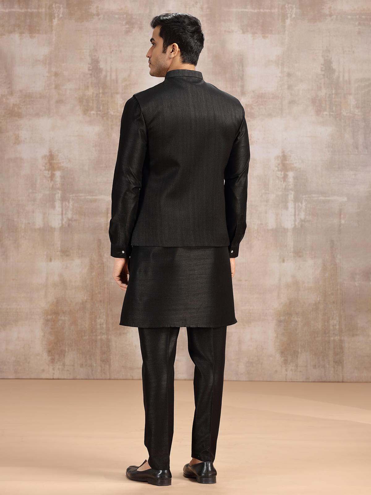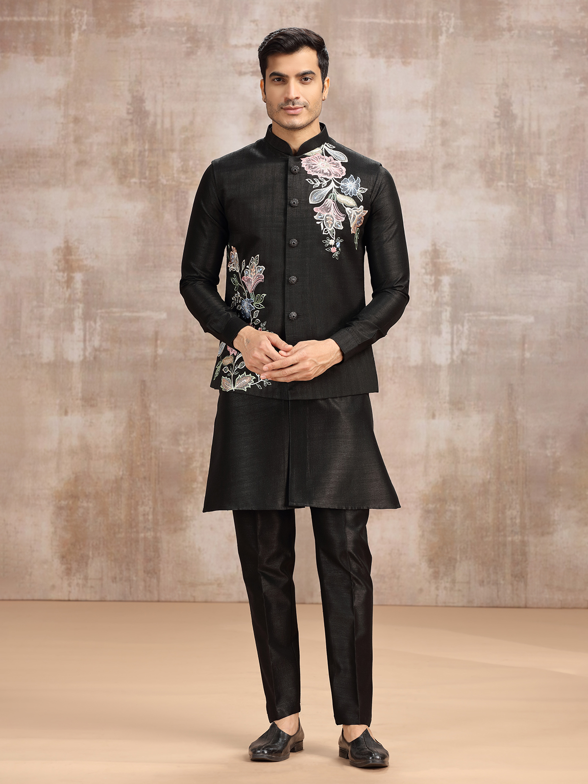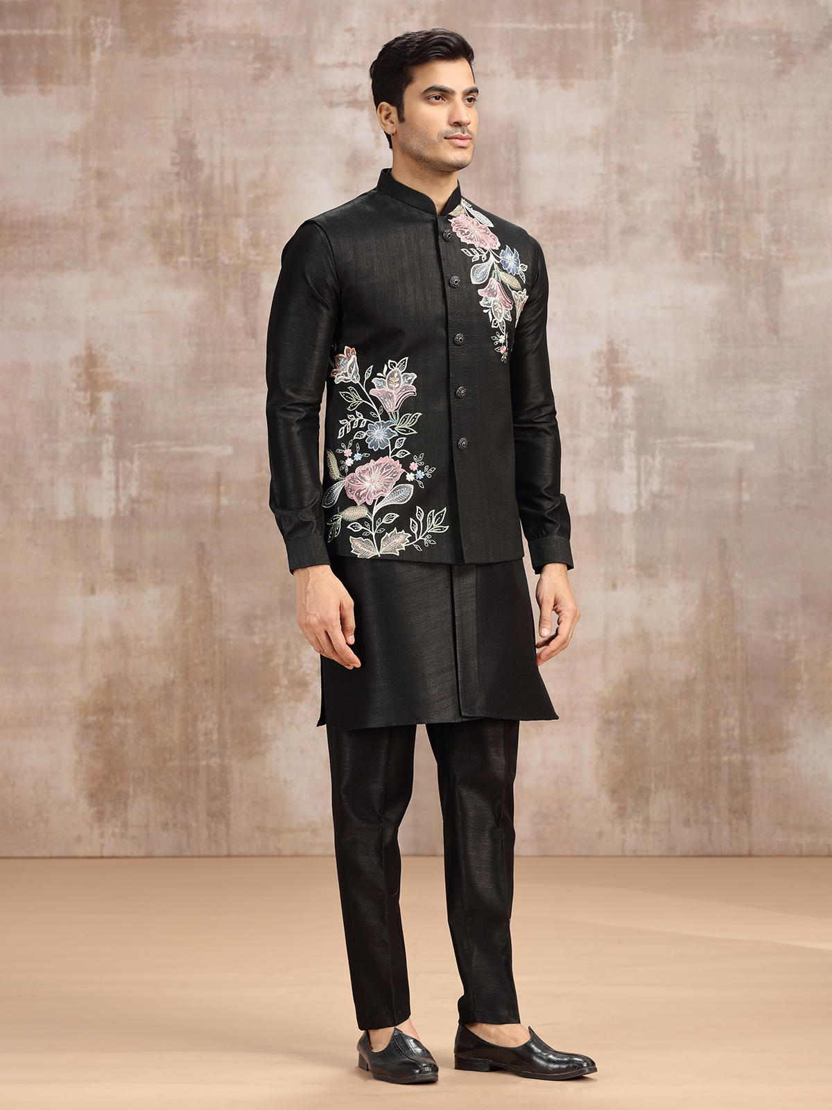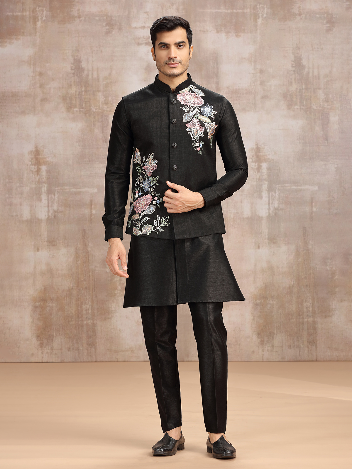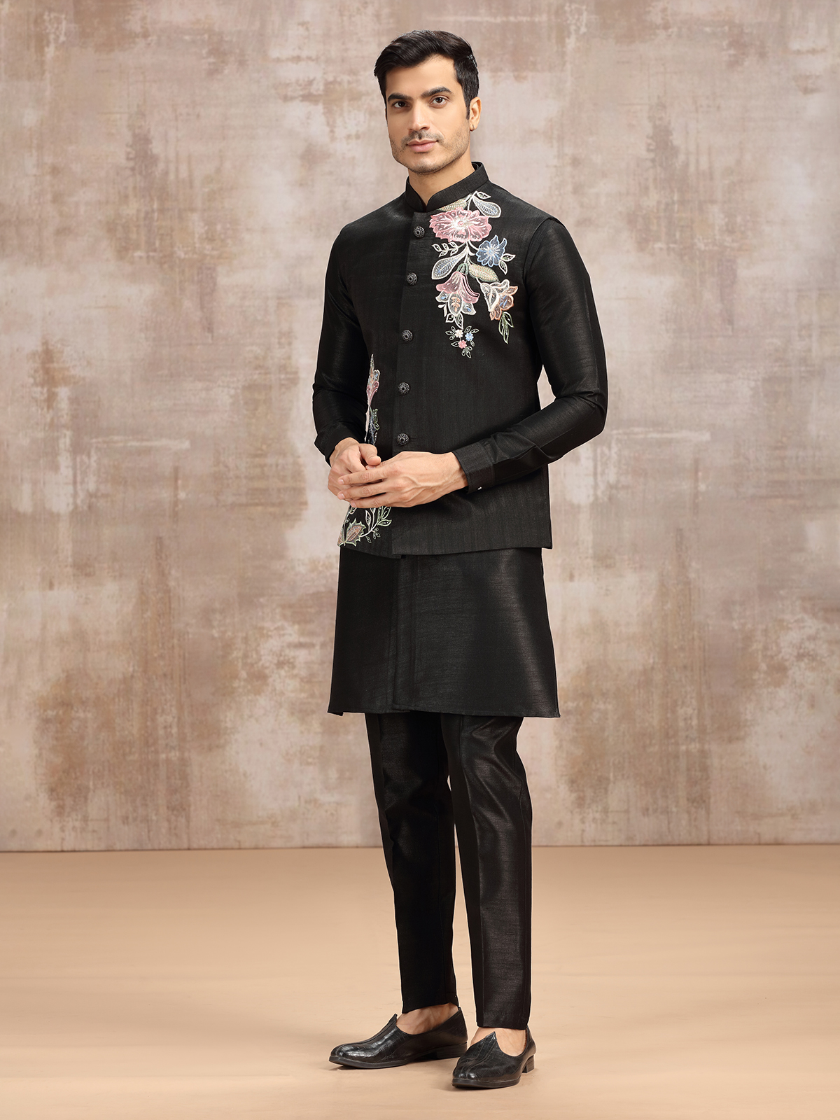 Intricate embroidery and sequins enrich this black silk waistcoat set, creating an ensemble of poised charm. A stand collar kurta with long sleeves rests beneath a sleeveless waistcoat, paired with a pant for balance. Crafted for weddings and receptions, it captures enduring sophistication, where detailed artistry enhances the power of simplicity.