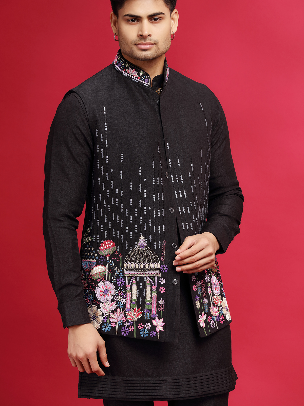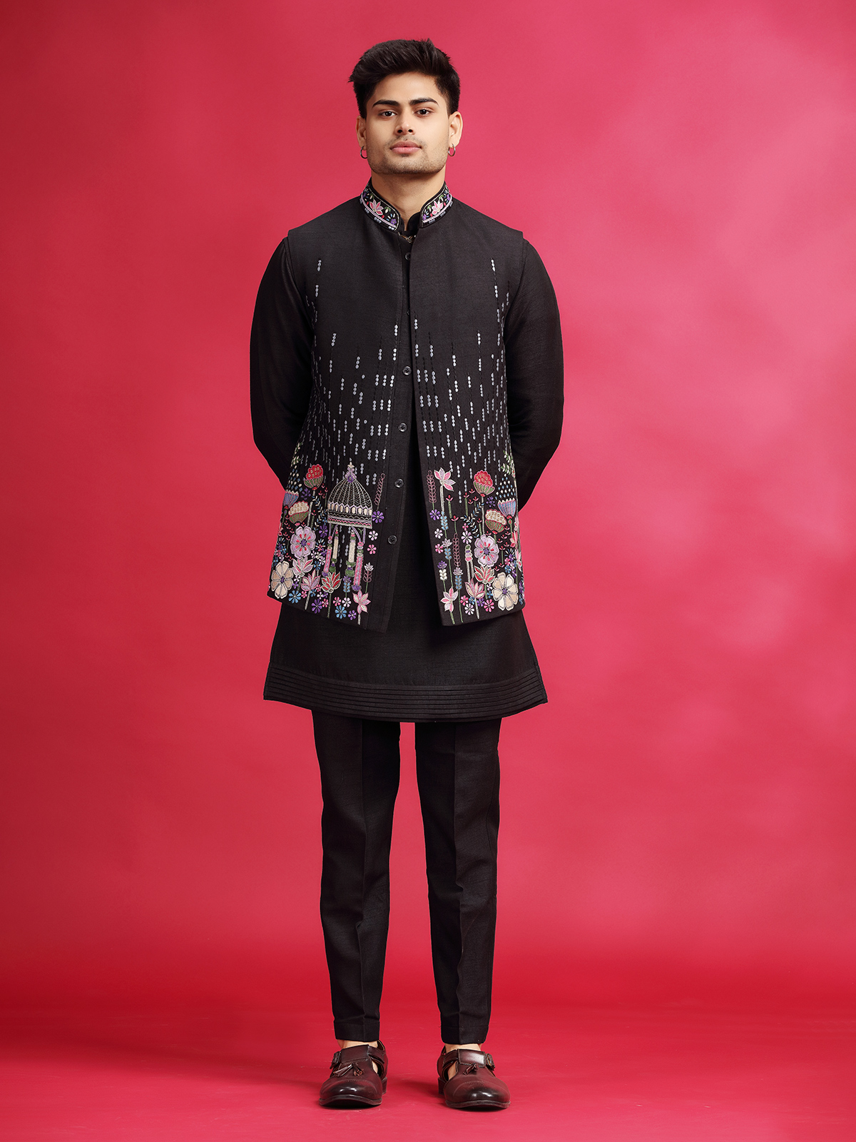 Tailored in rich black silk, this waistcoat set embodies evening grandeur. Embroidery adds a refined glimmer to the sleeveless design, enhanced by a sculpted chinese collar. Teamed with crisp pants, it defines power and poise—perfect for elegant wedding soirées.