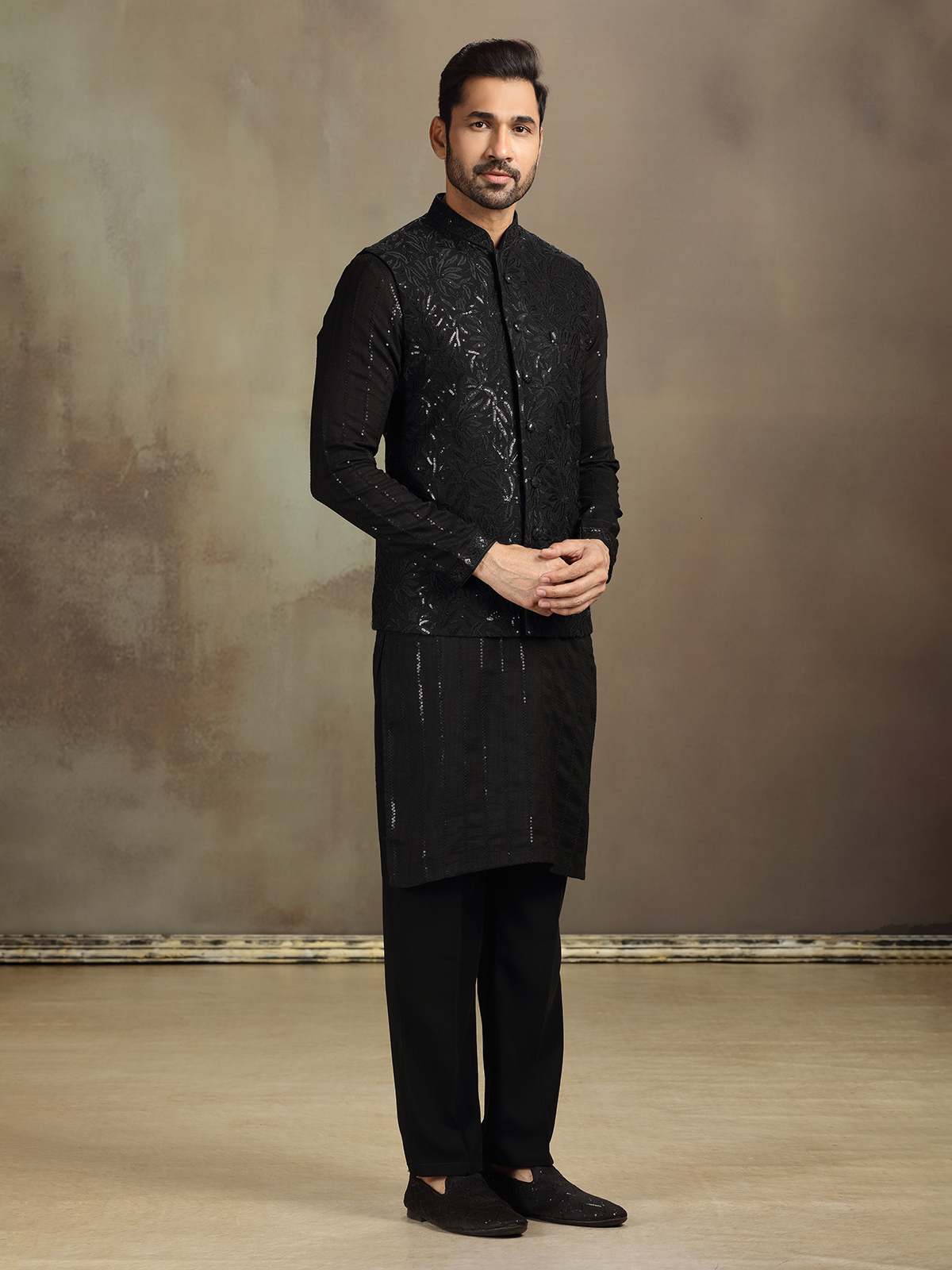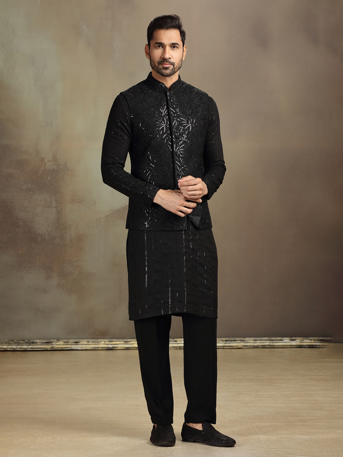 Styled in classic black silk, this waistcoat set features intricate thread and sequin detailing for a dramatic finish. A full-sleeved kurta with a sharp stand collar and pant complete the look—ideal for cocktail receptions, sangeets, or evening wedding events.