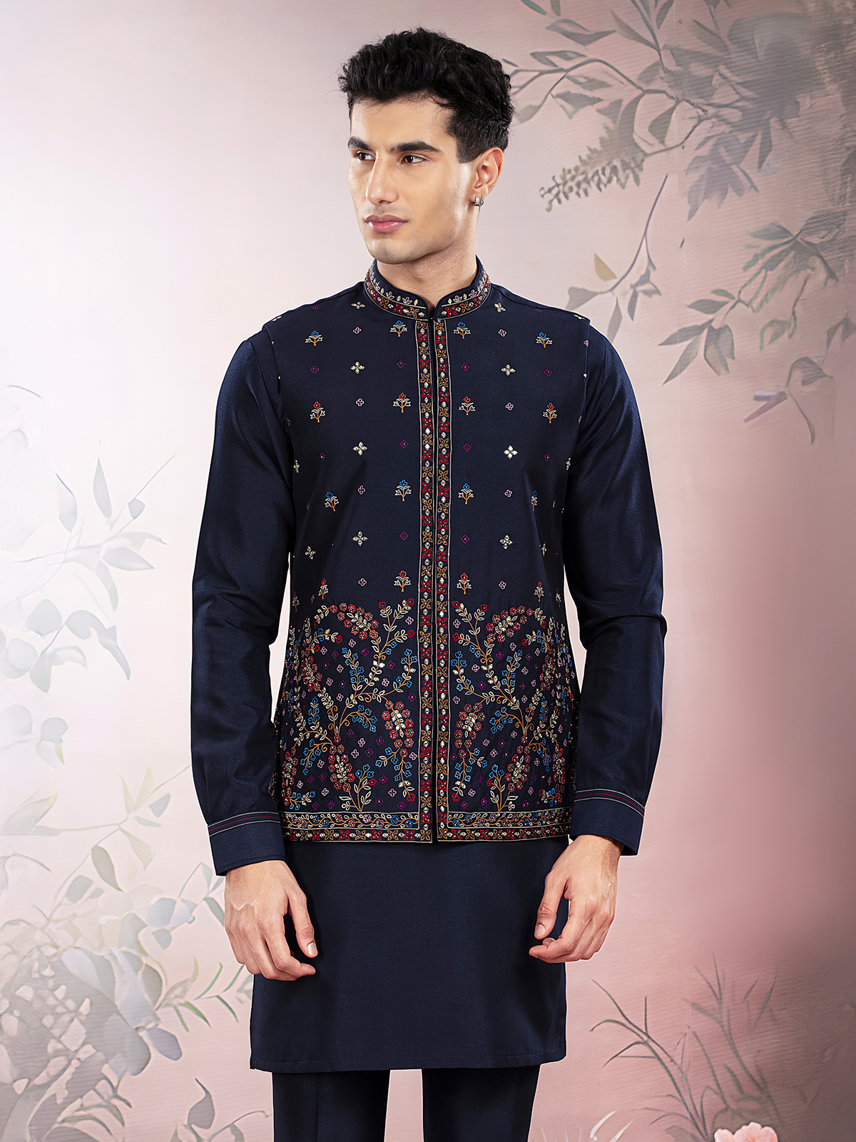 Black silk waistcoat set resonates with mystique and timeless charm. Mirror, sequins, and embroidery lend radiant detailing across the sleeveless waistcoat and full-sleeved, collared kurta. Coordinated pants enhance the look, completing an ensemble steeped in elegance and grandeur.