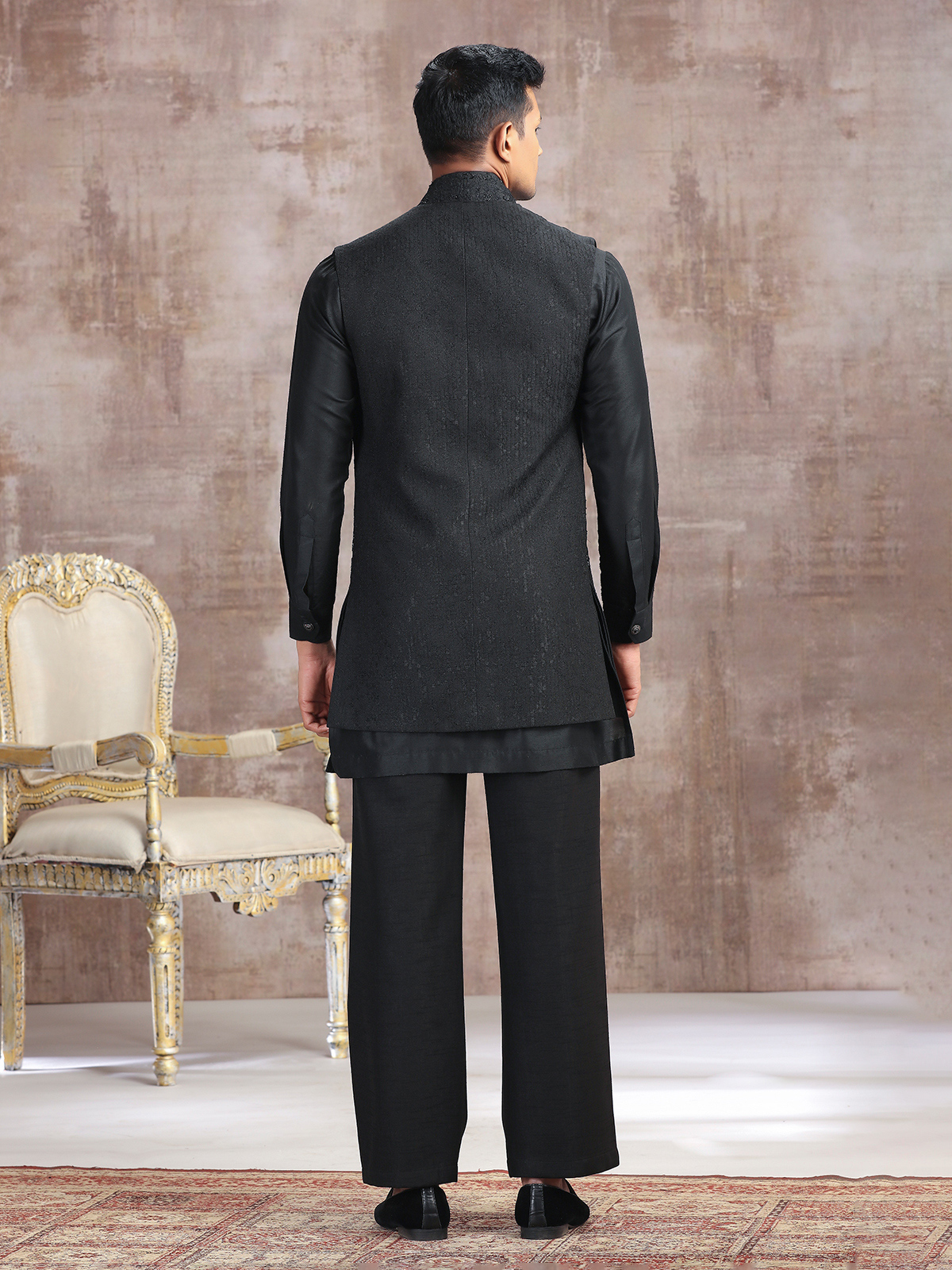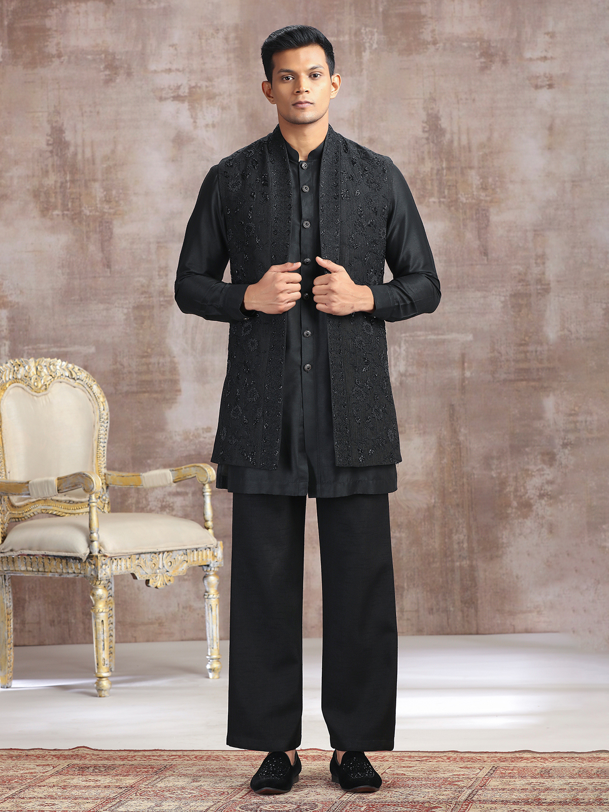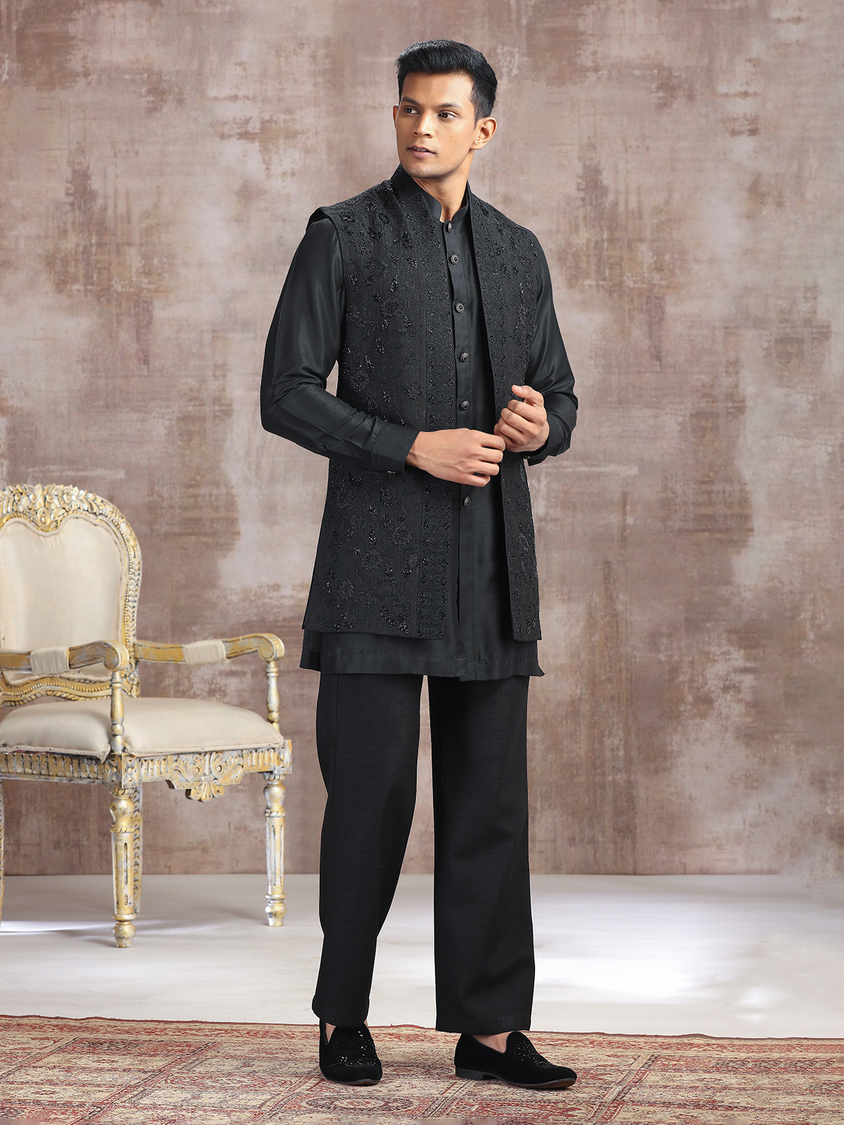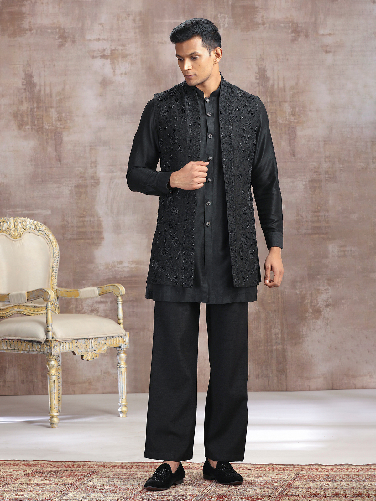 A striking choice for festive evenings, this black silk waistcoat set is adorned with refined thread, cutdana, and beads. Featuring a stand collar and paired with a pant, it radiates charm and royalty, ideal for weddings, receptions, and celebratory gatherings.