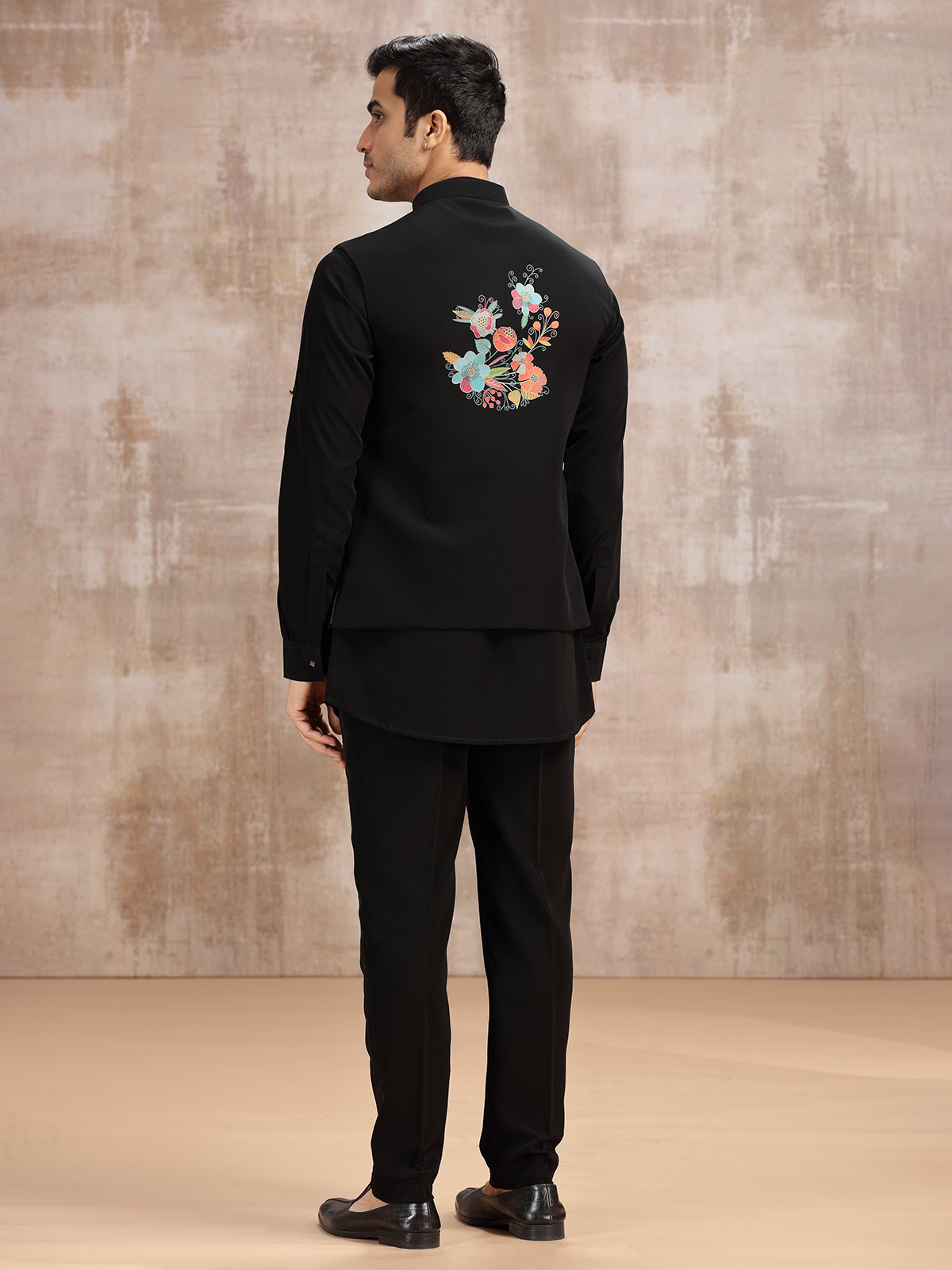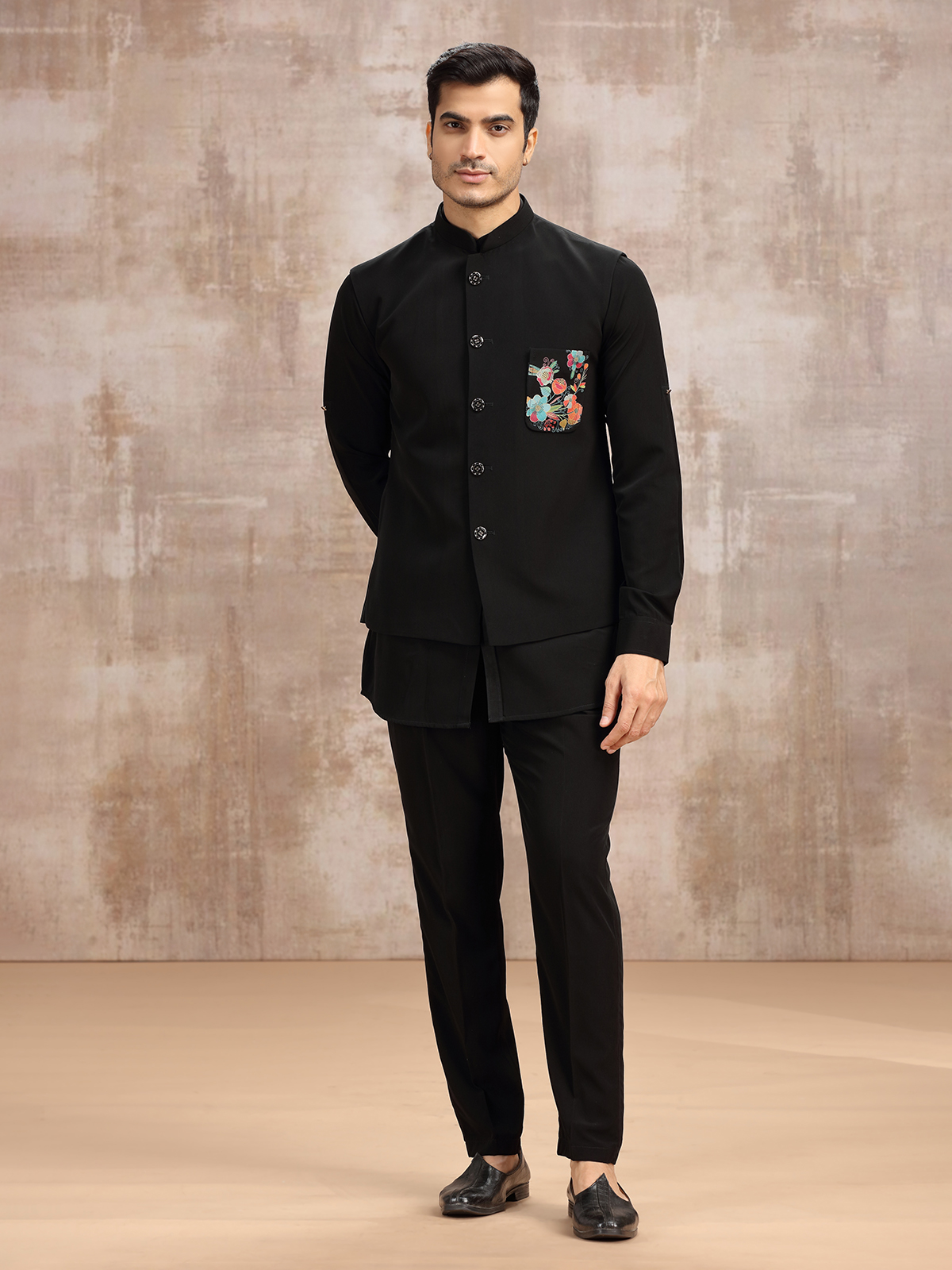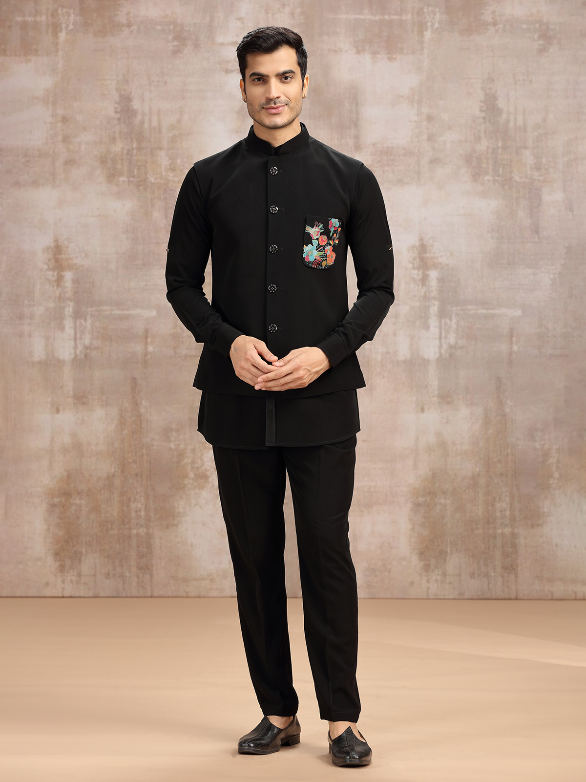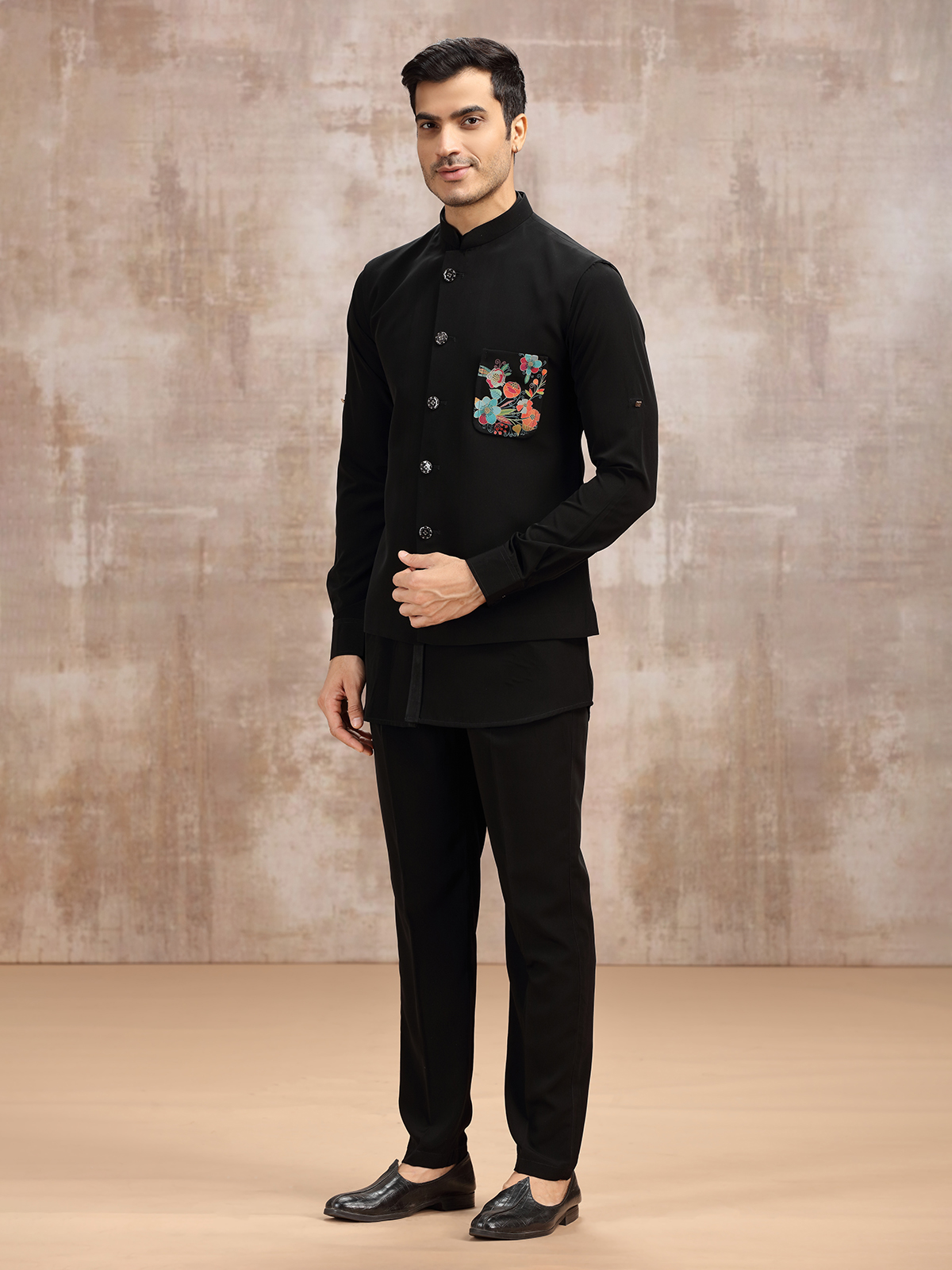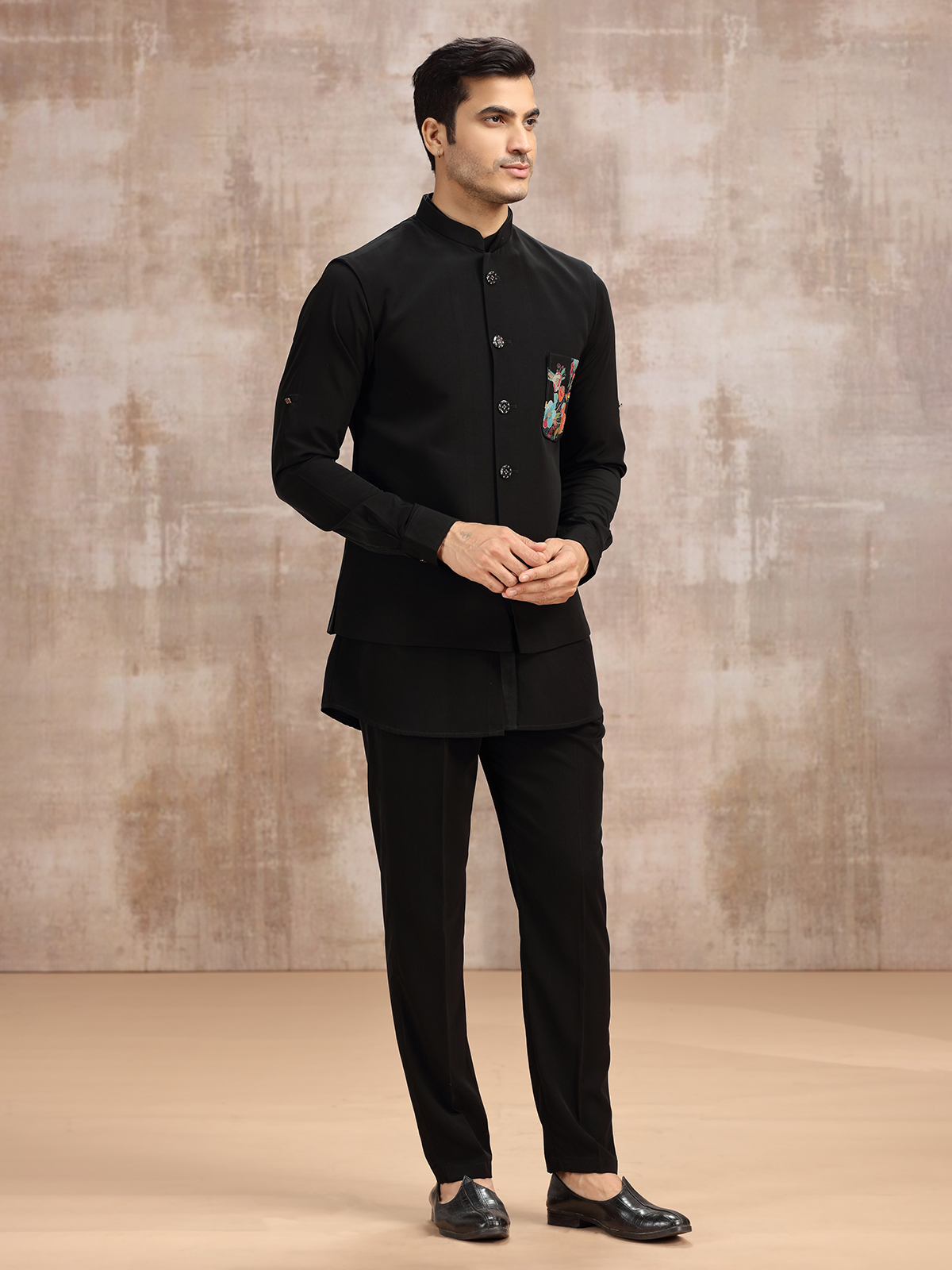 This black terry rayon waistcoat set reflects quiet elegance. Featuring a stand collar kurta with full sleeves, layered with a sleeveless waistcoat, and completed by a pant, the attire offers refined balance. Perfect for weddings and receptions, it merges tradition with contemporary styling, embodying charm in simplicity.