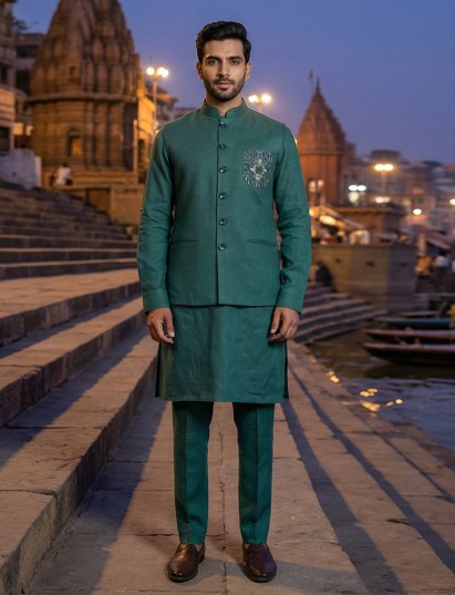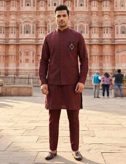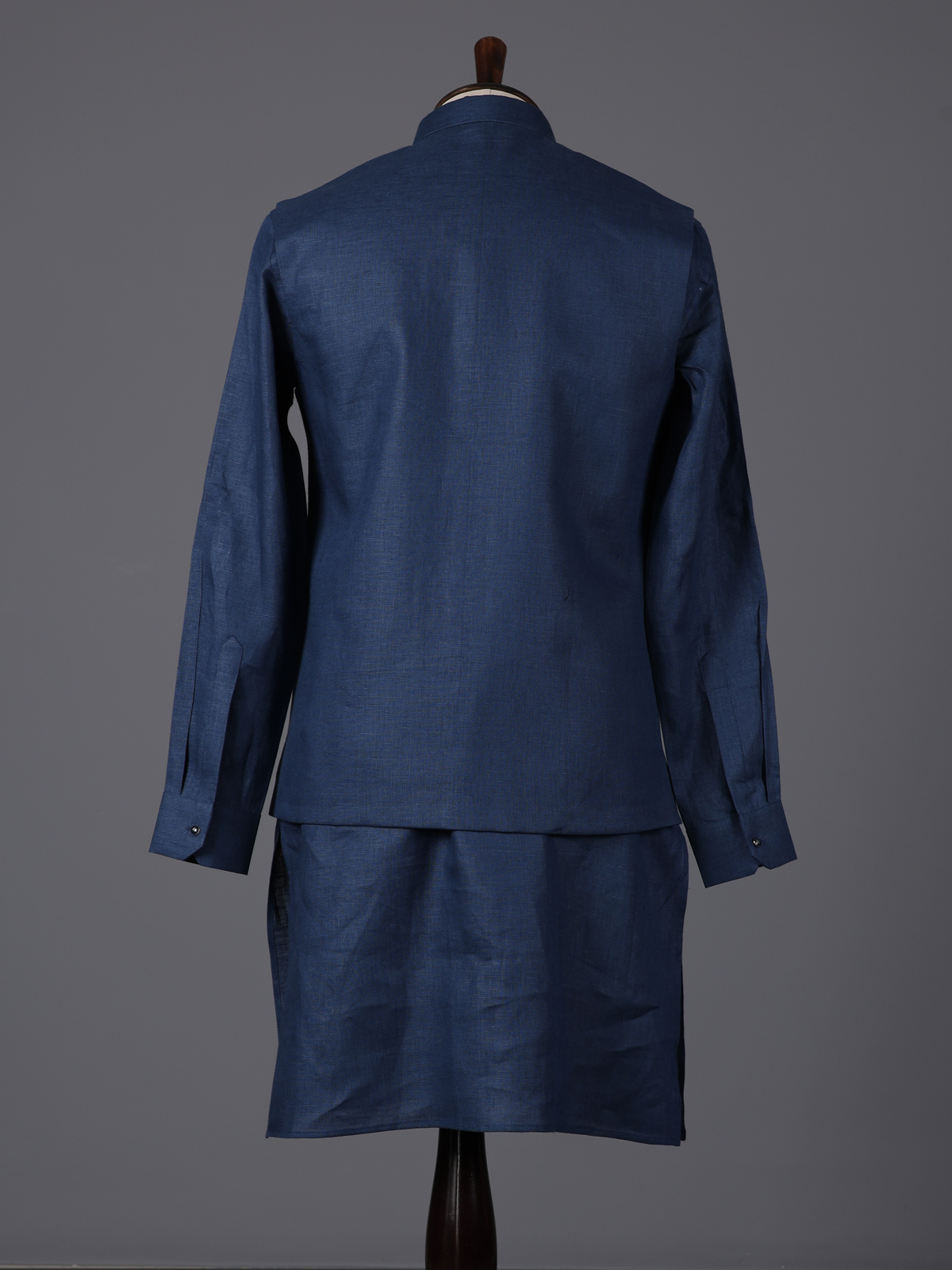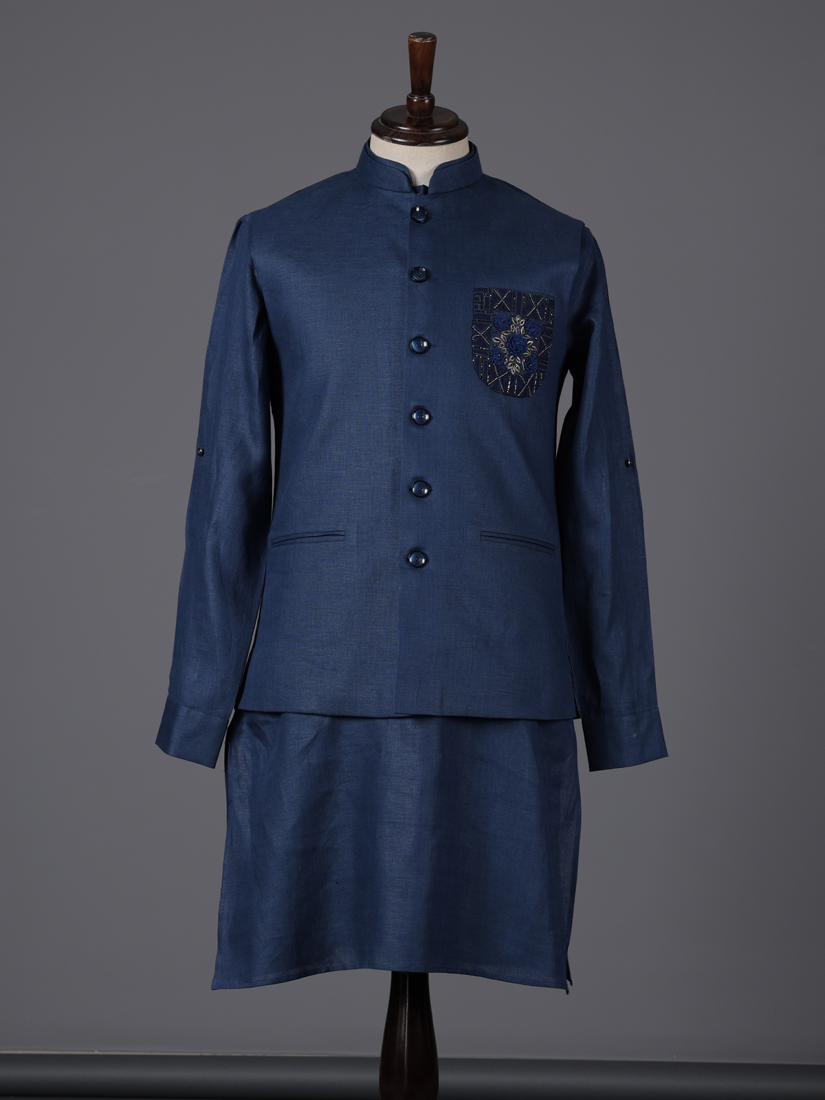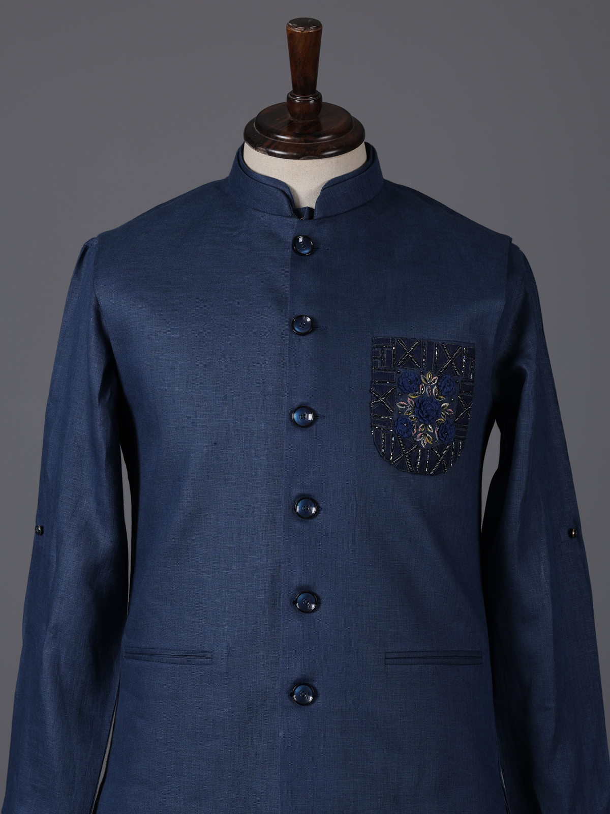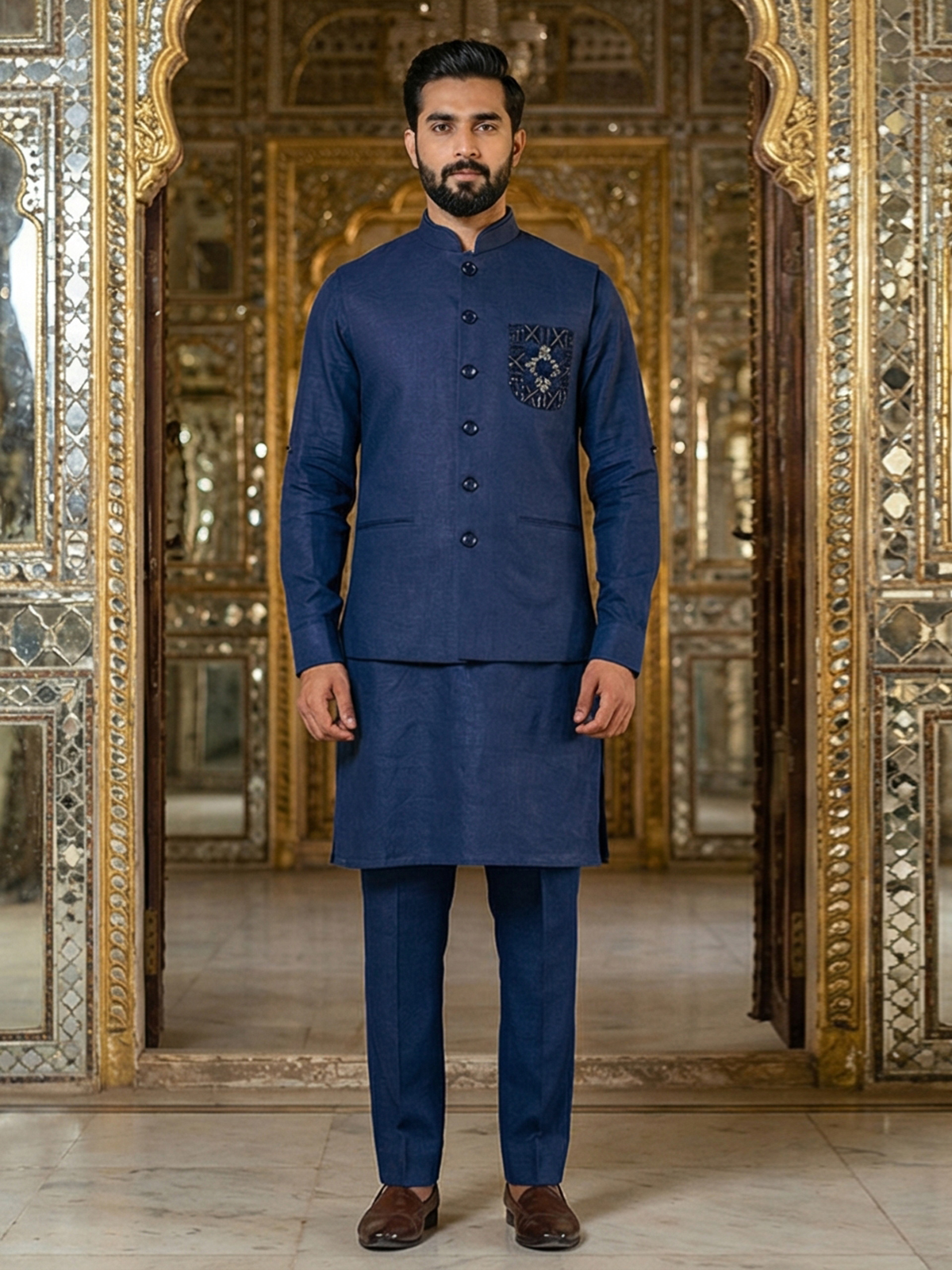 Elegant blue tones define the appeal of this cotton blend waistcoat set designed for refined festive wear. Featuring cutdana, thread and bead detailing on the pocket, it adds graceful artistry. The mandarin collar enhances its clean silhouette, while the breathable fabric ensures comfort. Paired with kurta and pants, this outfit delivers a polished and modern ethnic look for celebrations.
