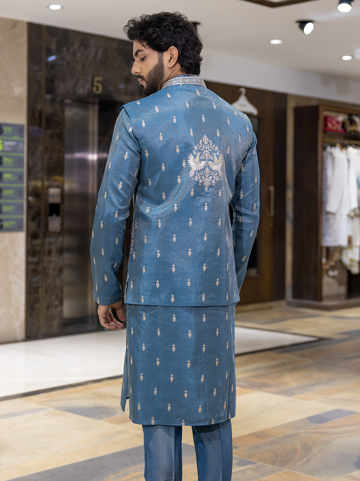 Blue Wedding Wear Waistcoat Set With Resham And Sequins Shine