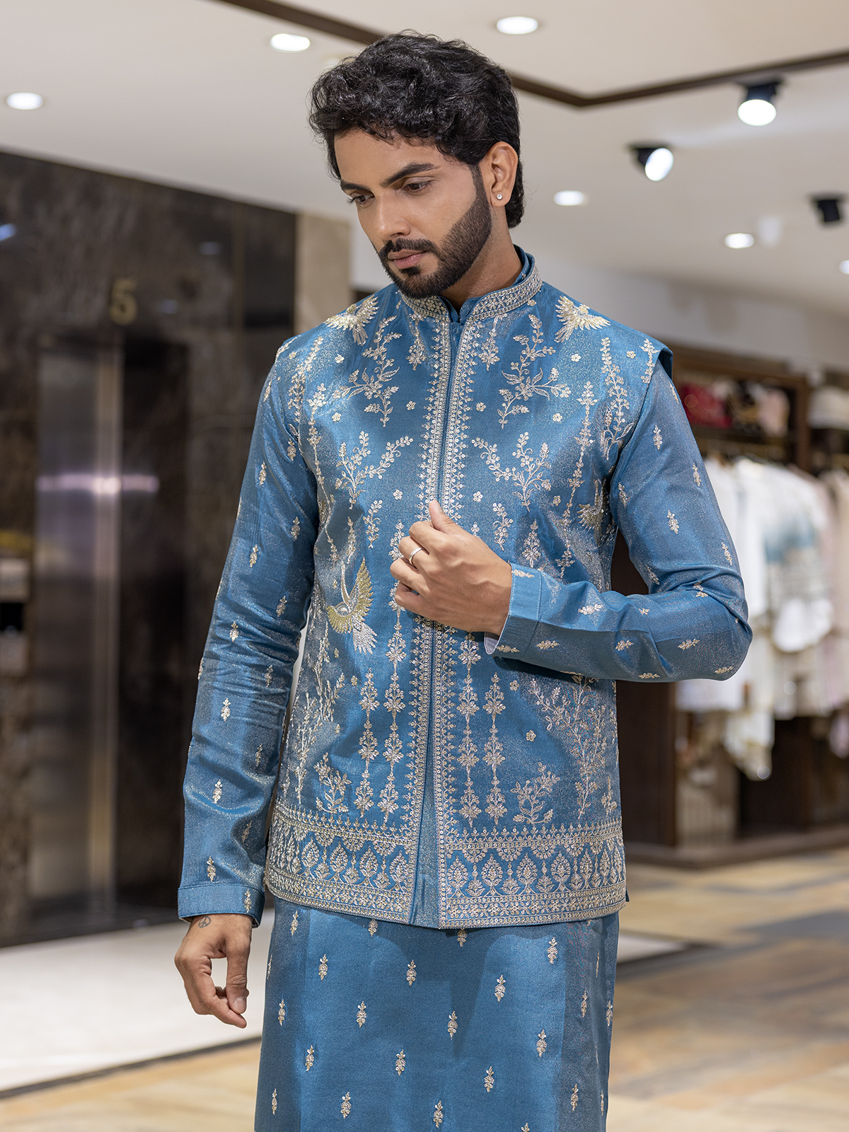 Tailored in regal blue silk, this waistcoat set reflects refined festive grace. The sleeveless waistcoat shimmers with resham and sequin detailing, paired with a mandarin-collared kurta for a touch of timeless poise. Complemented with elegant pants, it is designed for celebrations that exude charm and understated luxury.