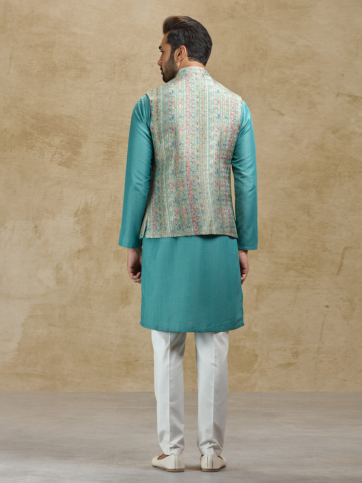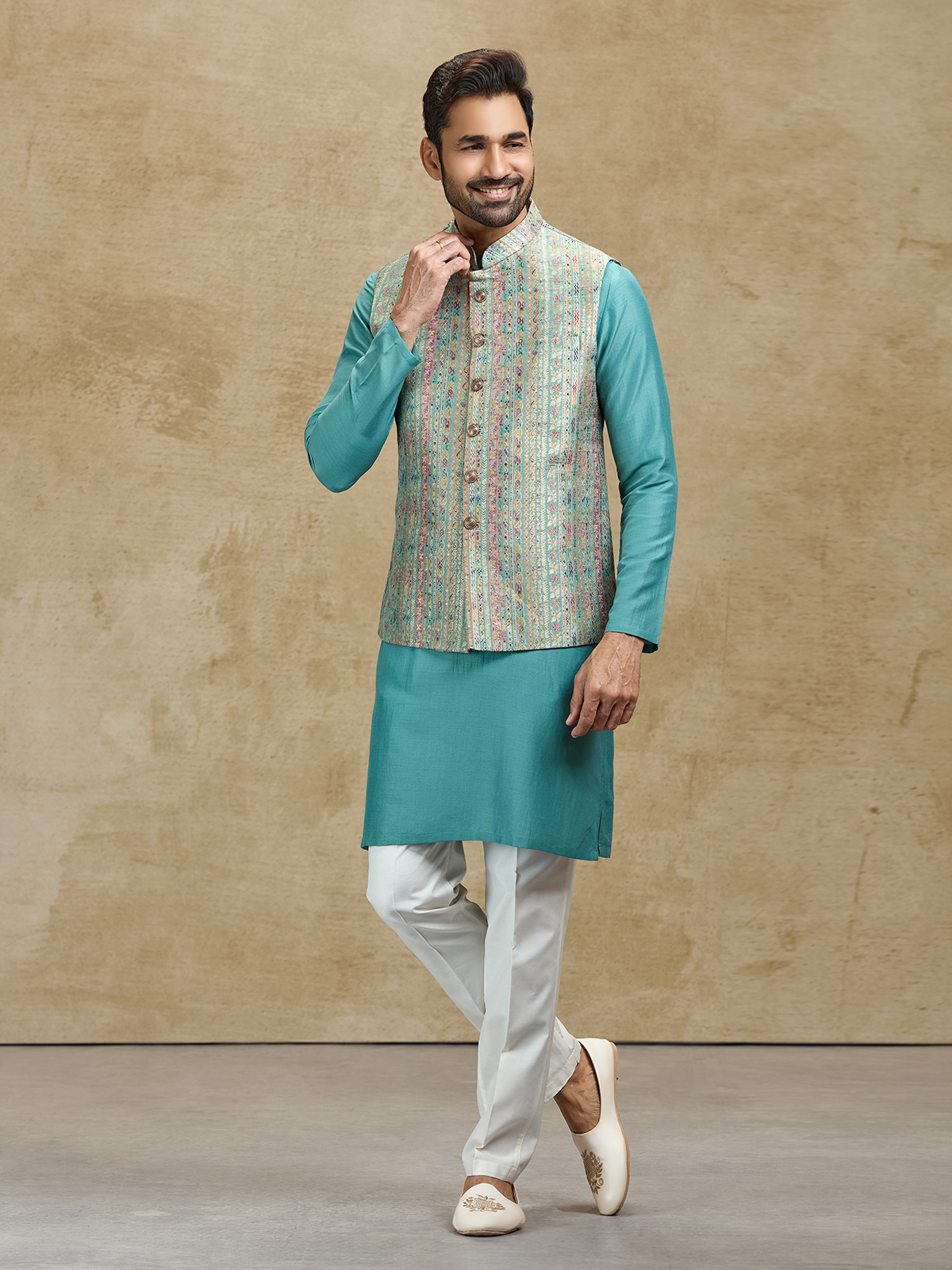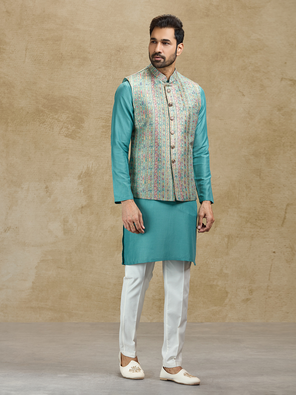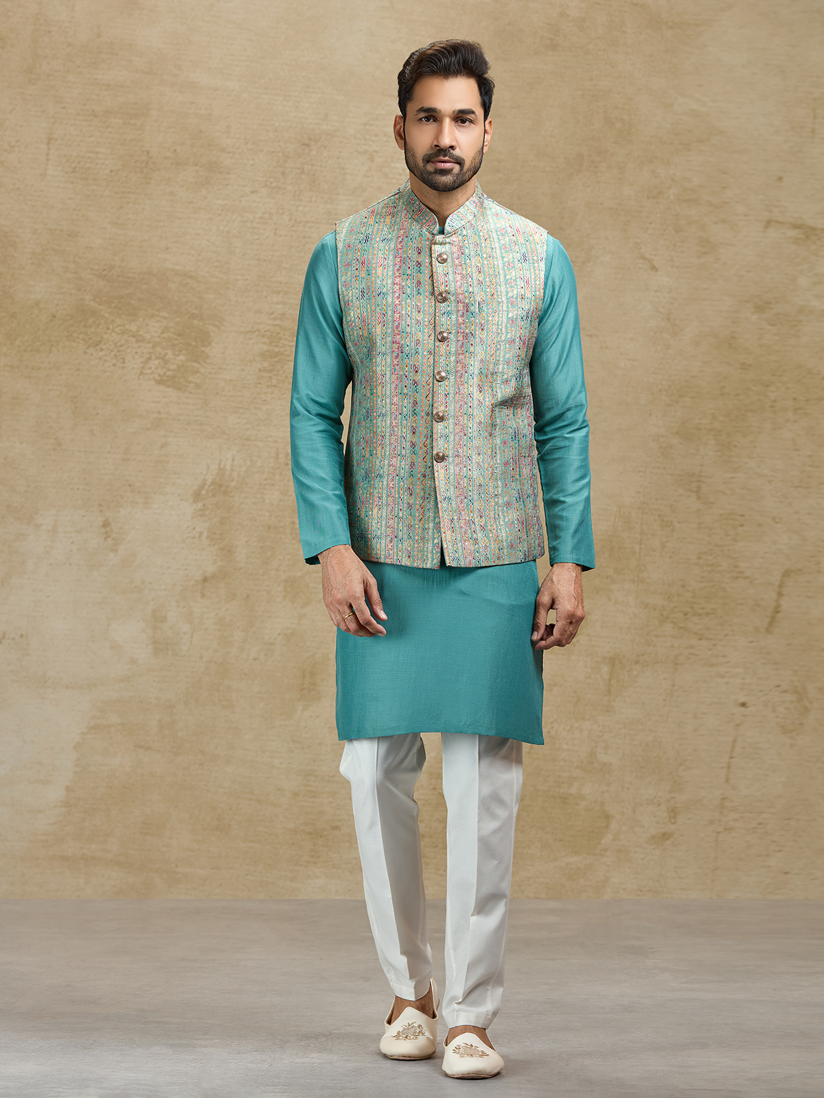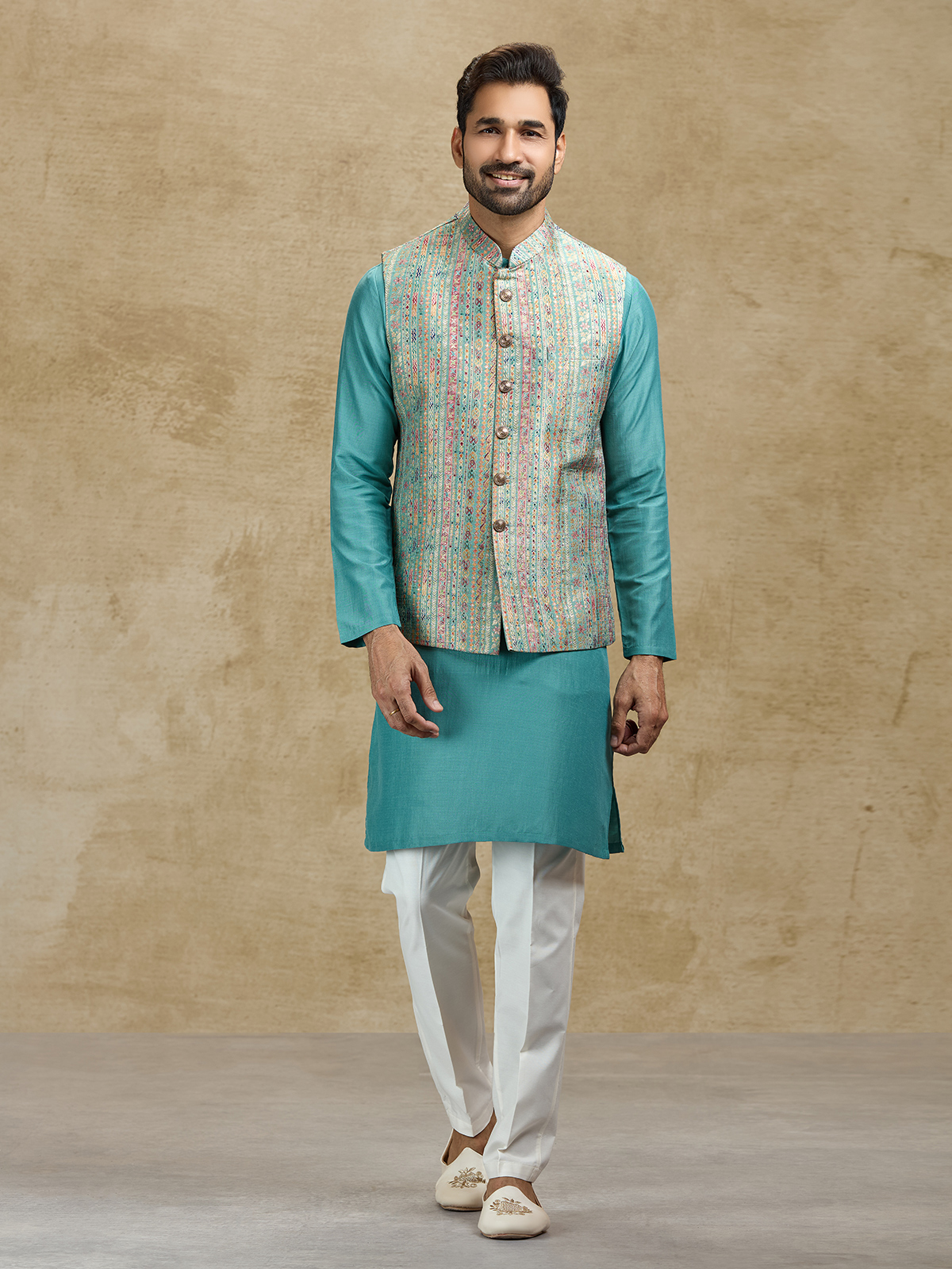 This blue silk waistcoat set showcases elegant craftsmanship through its richly woven jacquard waistcoat. The textured design enhances the classic kurta silhouette, creating a sophisticated festive ensemble. Paired with tailored pants, this outfit is perfect for weddings, receptions, sangeet celebrations and festive occasions.