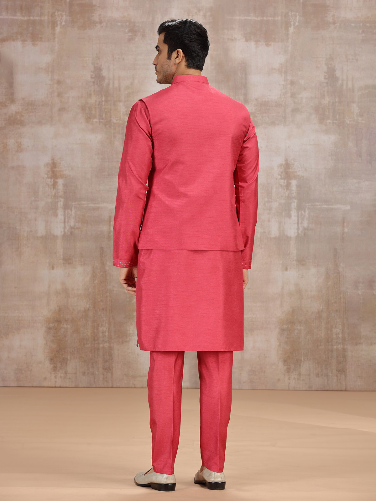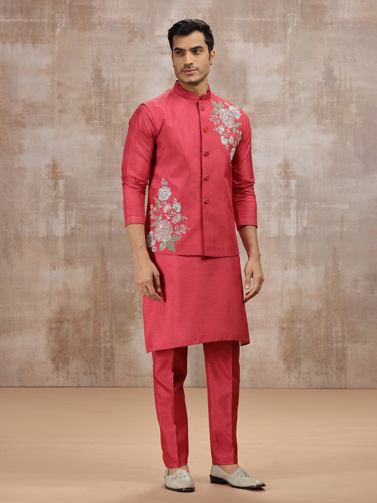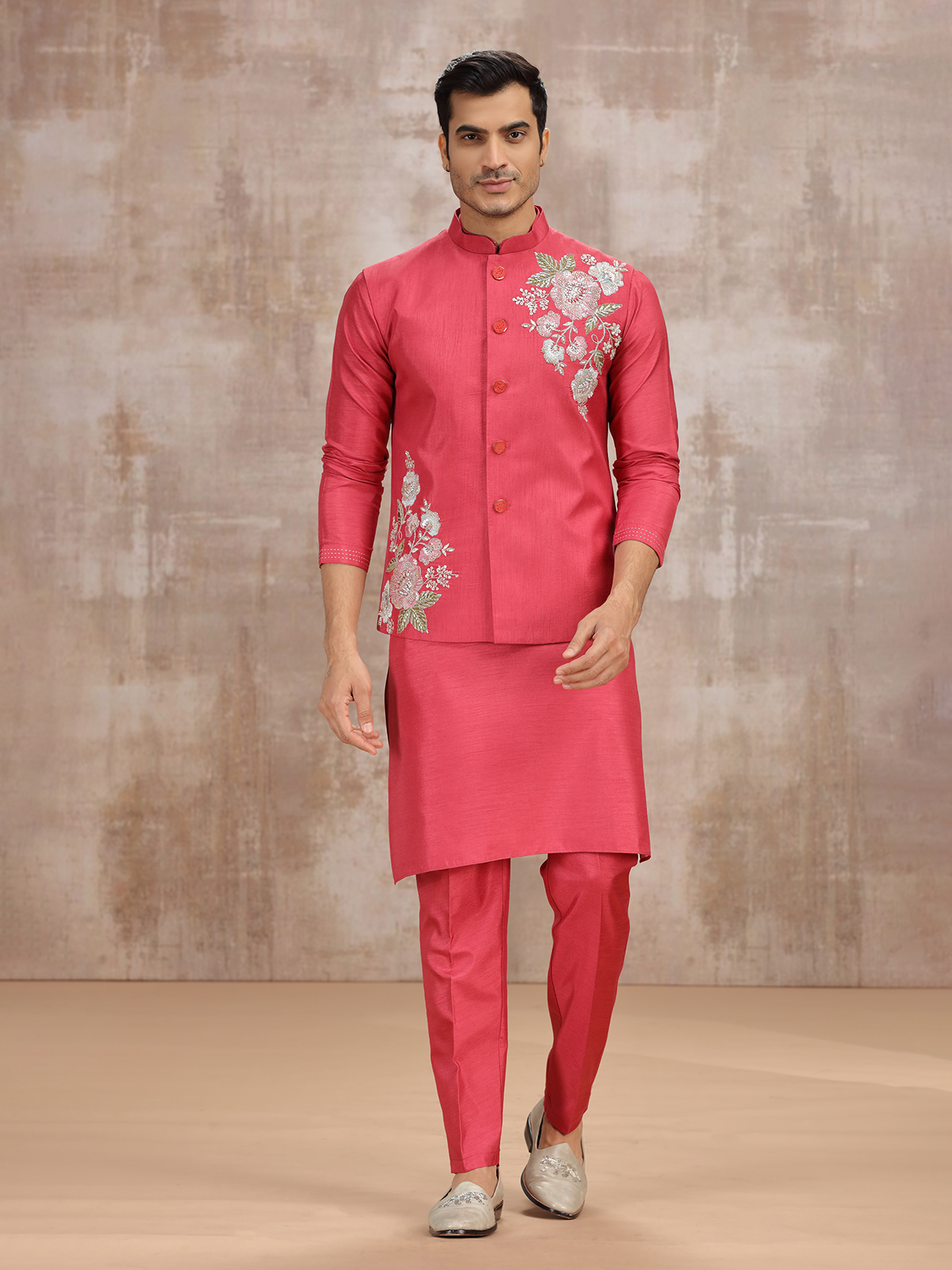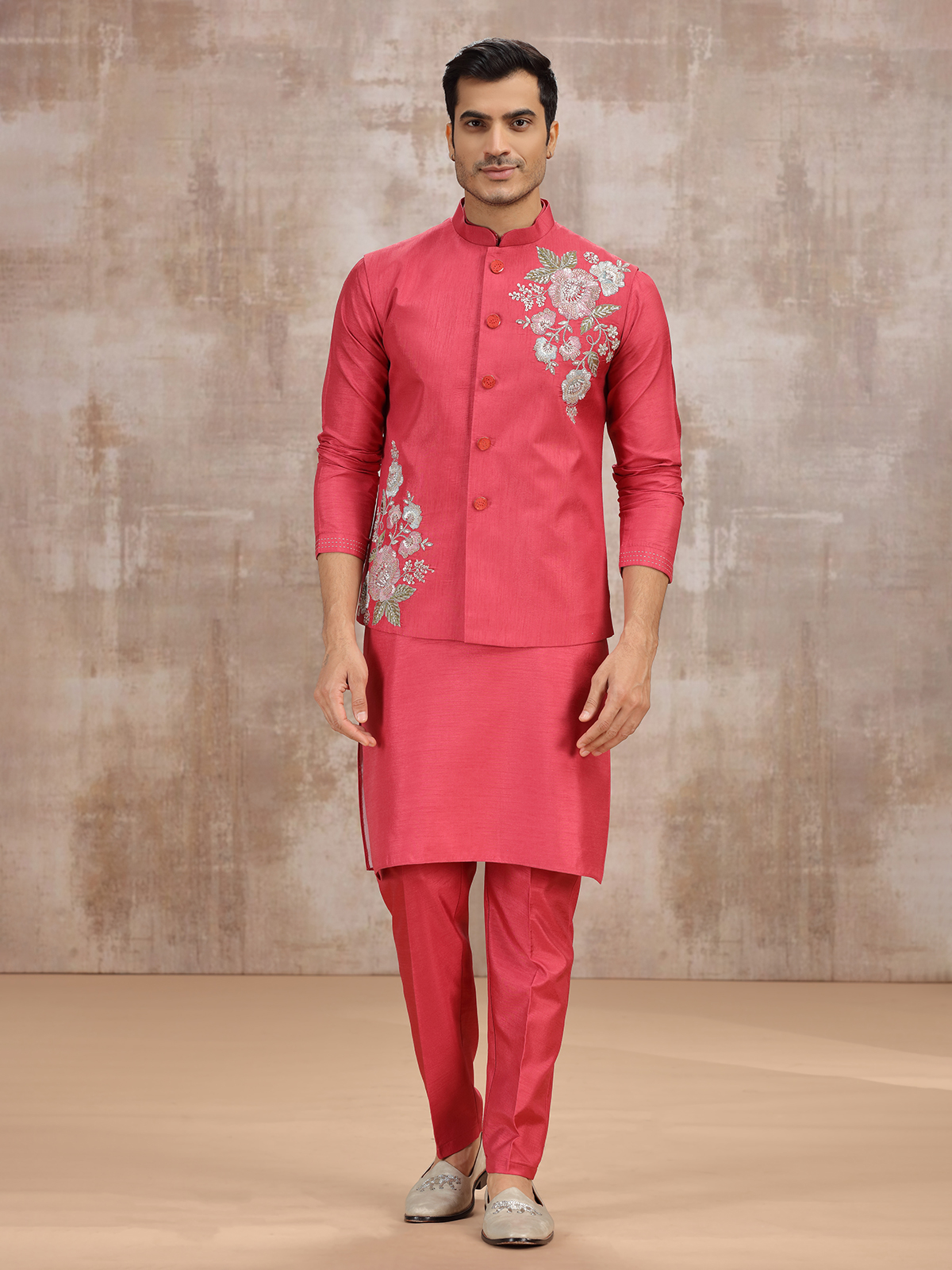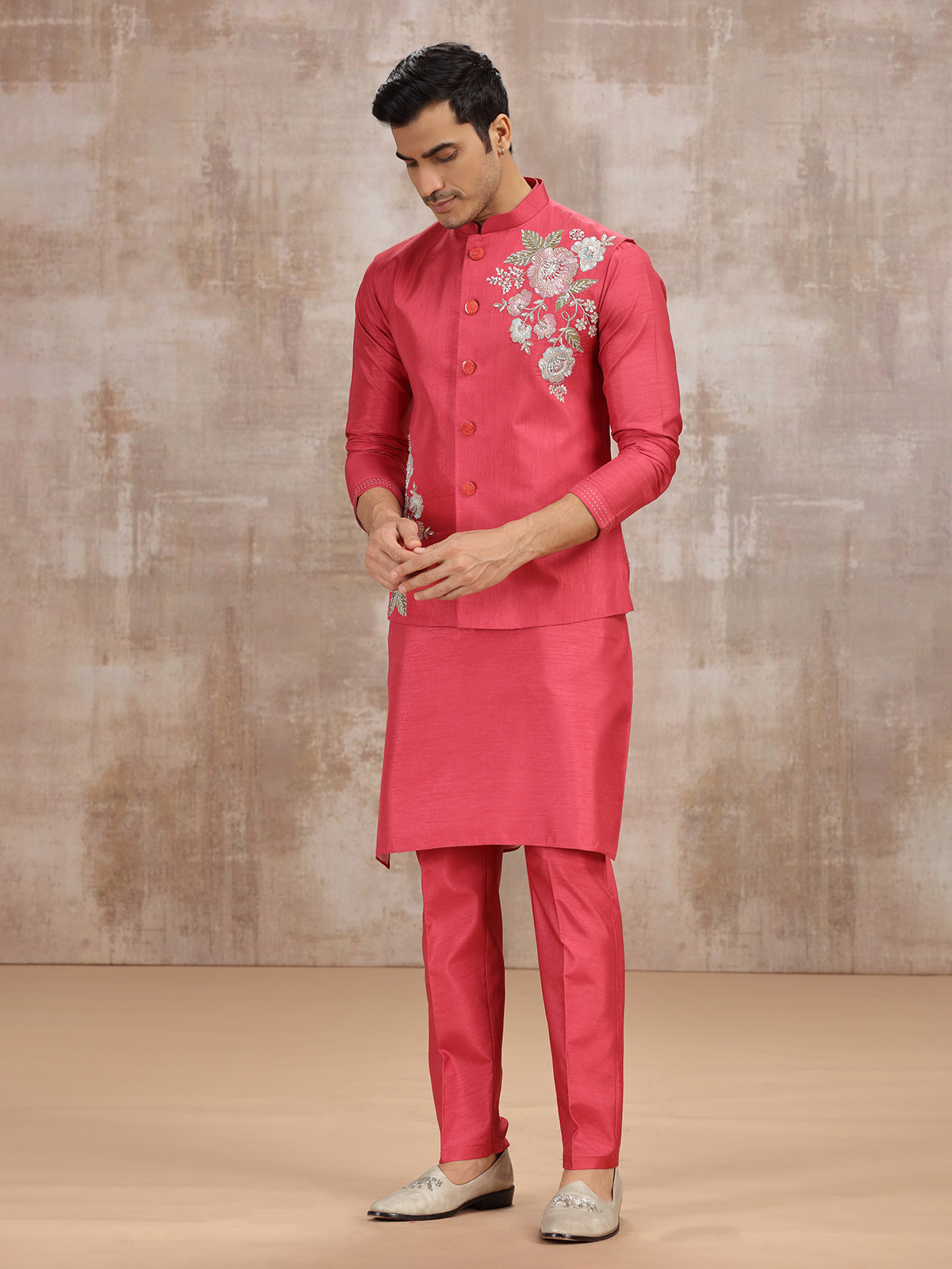 Resham, cutdana, and sequins illuminate this bright pink silk waistcoat set with festive radiance. A stand collar kurta with full sleeves layers beneath a sleeveless waistcoat, completed by a pant. Suited for weddings and receptions, it reflects joyful grandeur, where bold color and shimmering embellishments unite to create celebratory attire.