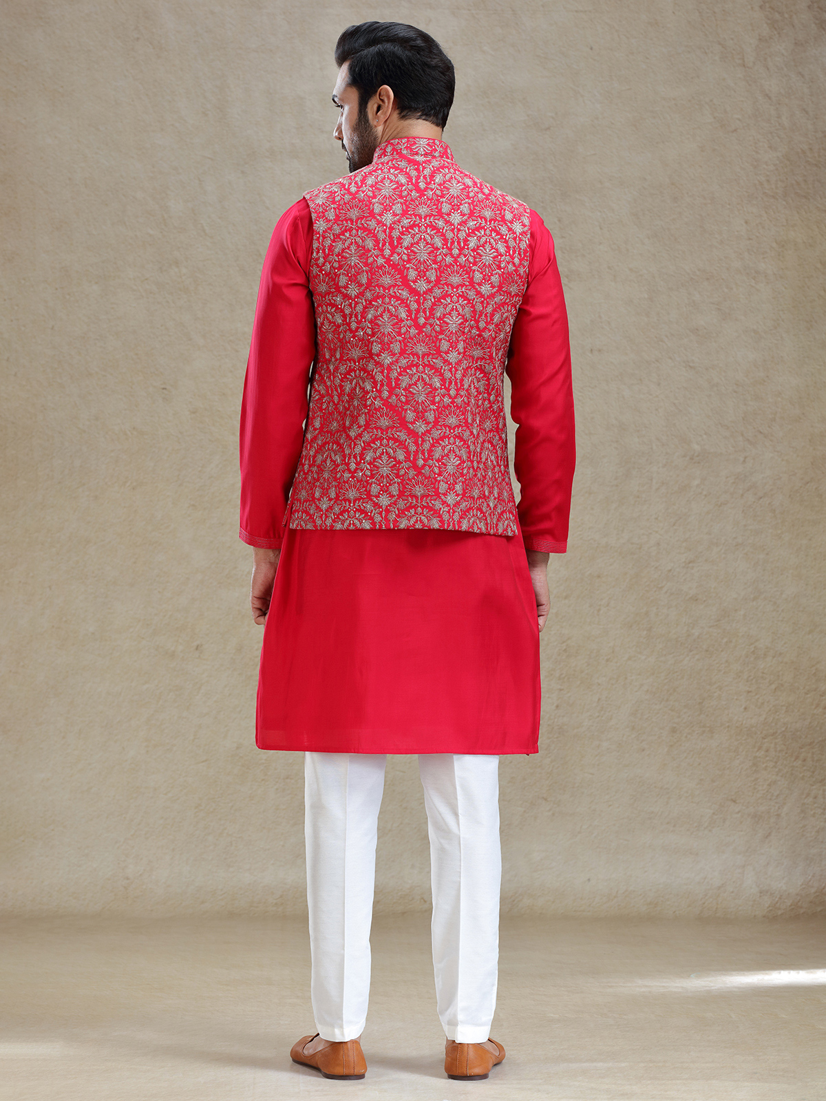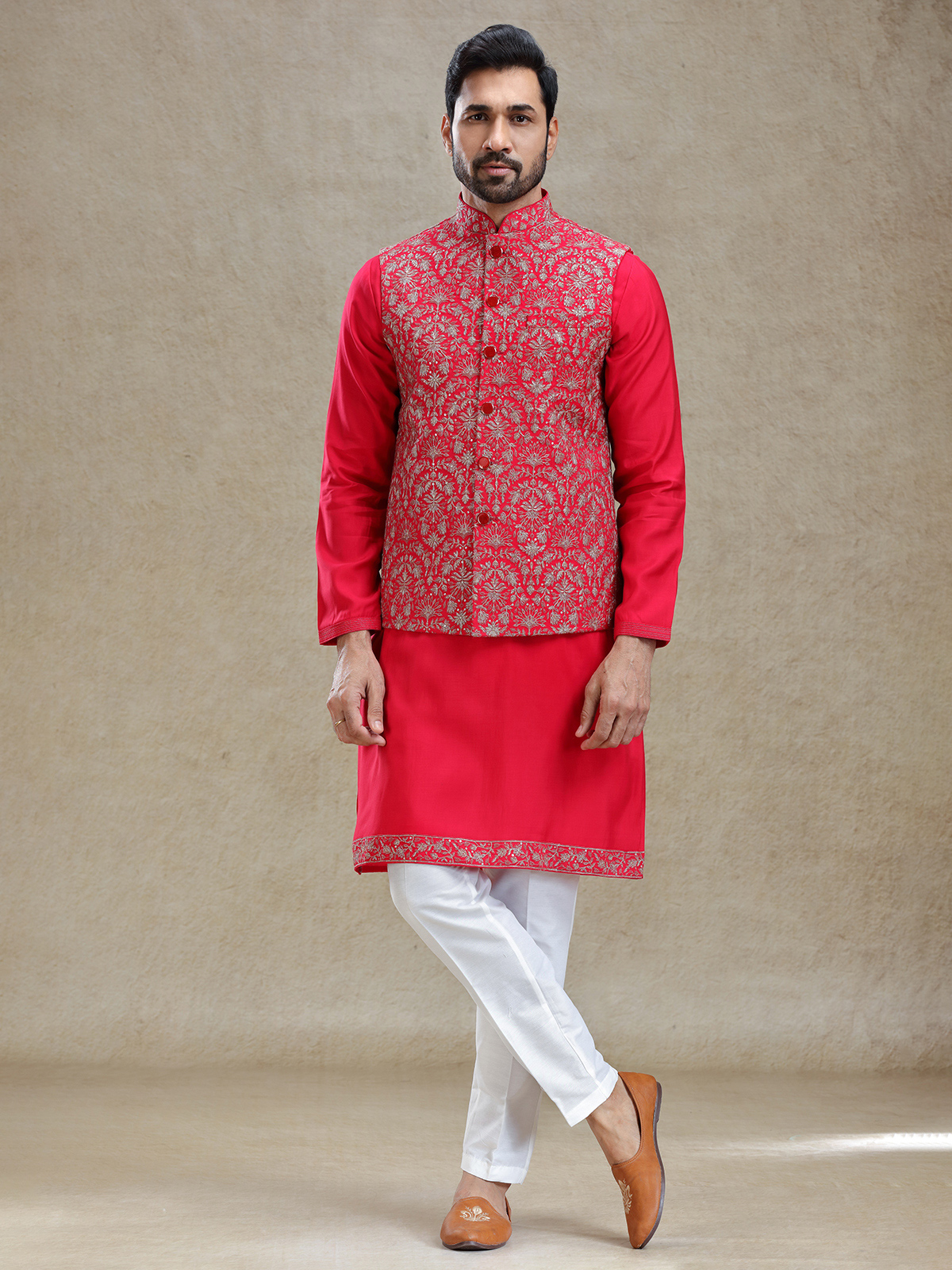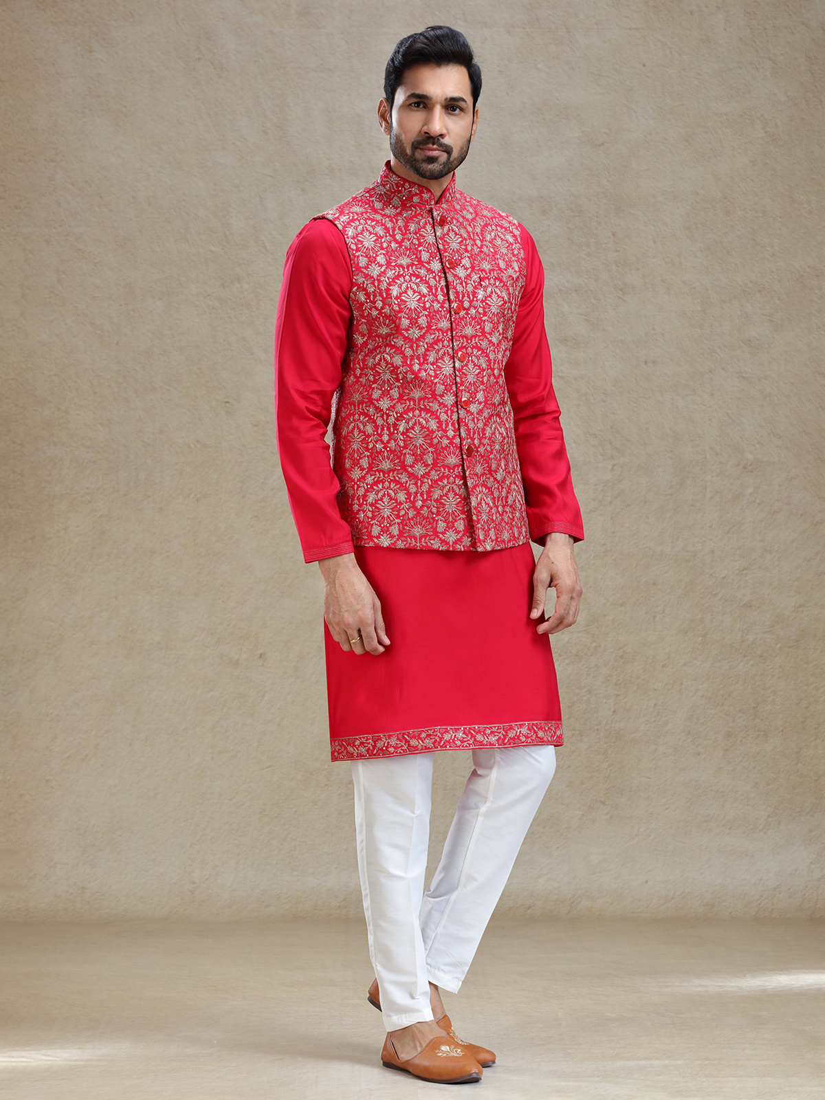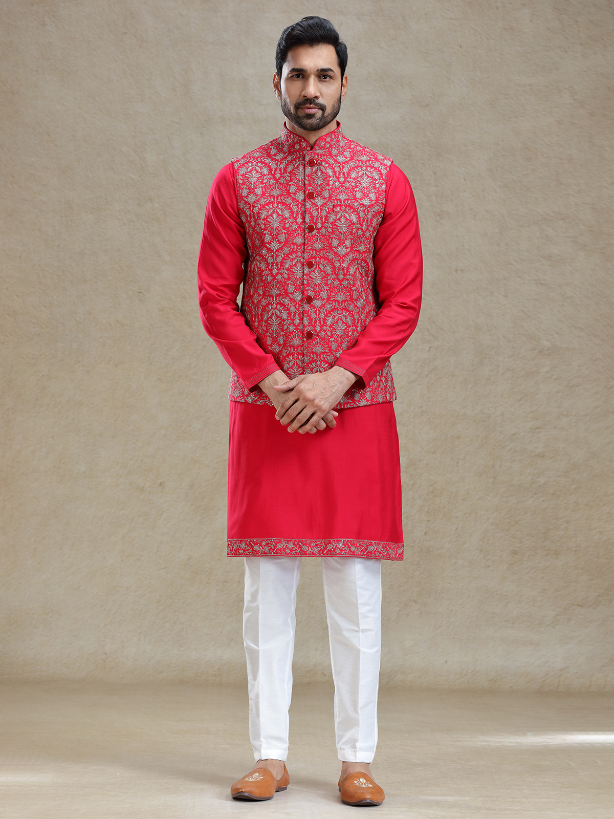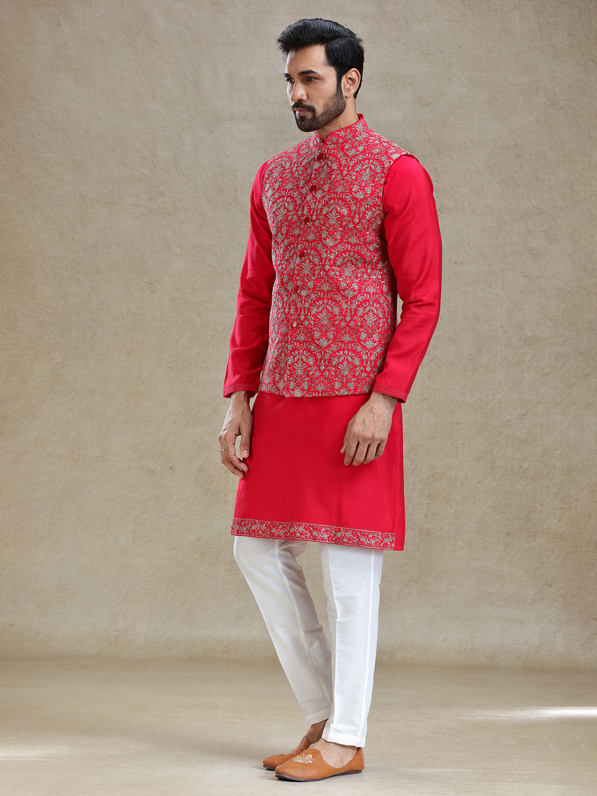 A perfect blend of sophistication and tradition, this bright red kurta jacket set exudes regal charm. The richly woven cotton silk jacket is beautifully adorned with intricate resham, thread, and sequins, offering a timeless appeal. The detailed worked collar enhances its refined look, making it an ideal choice for festive occasions and wedding ceremonies. Elevate your ethnic collection with this striking ensemble, designed to make a memorable statement.