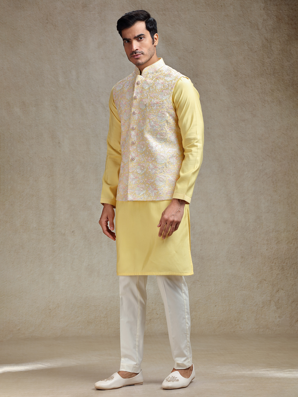 Charming Pastel Yellow Waistcoat Set For Festive Occasions