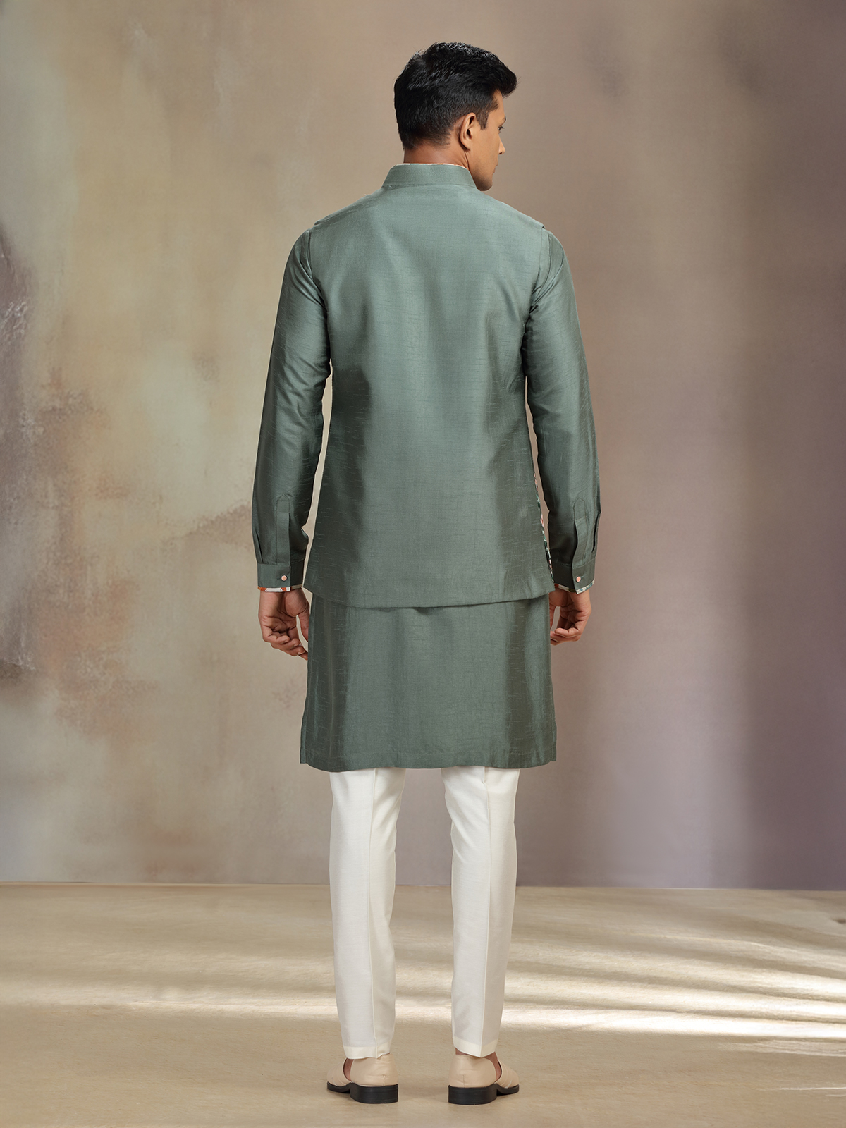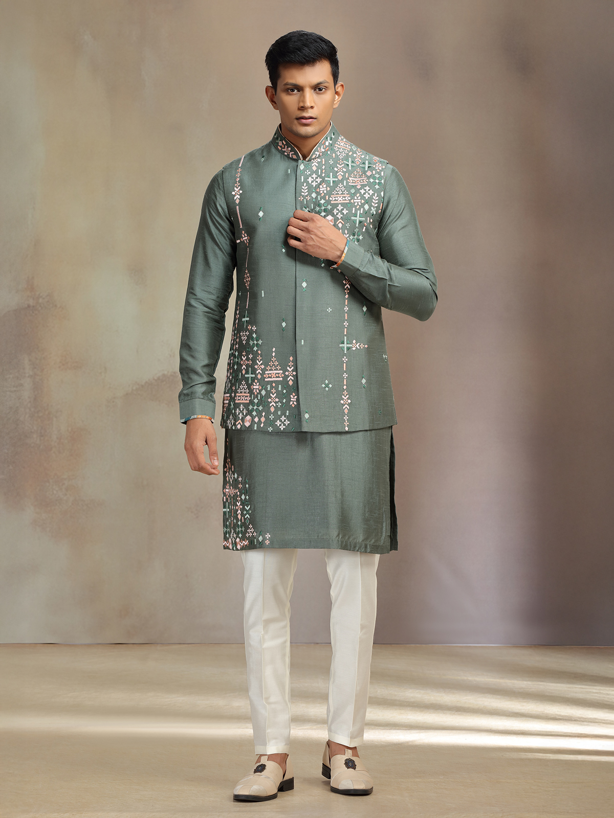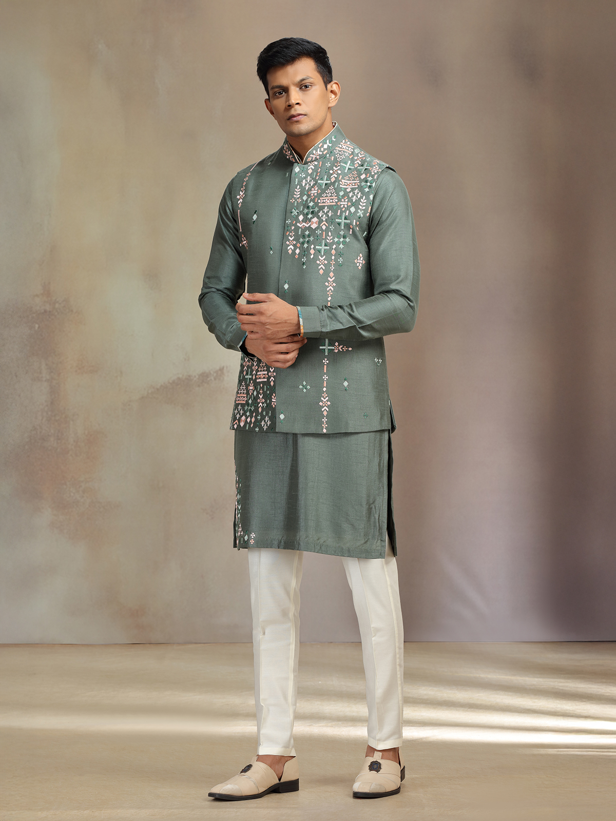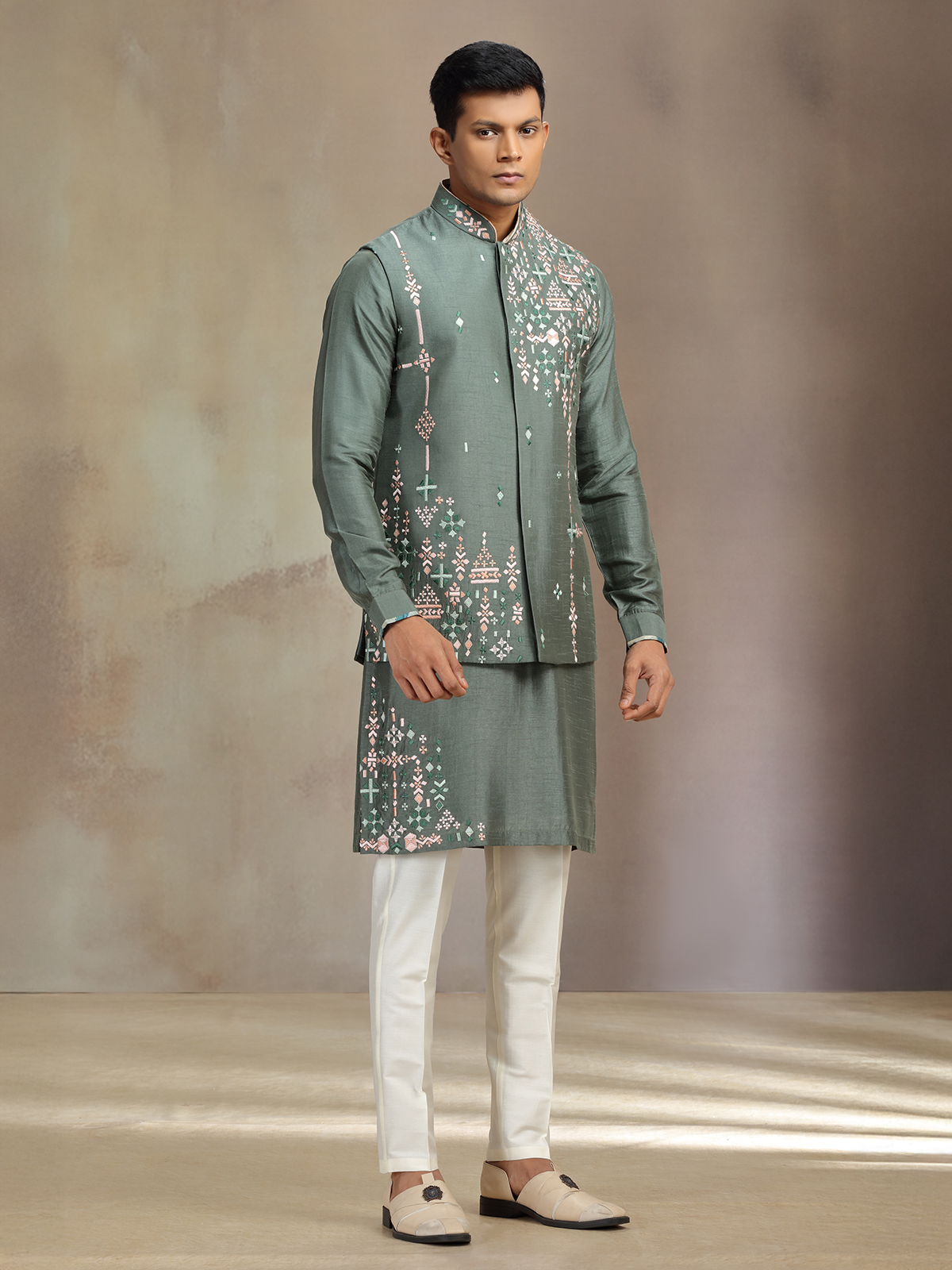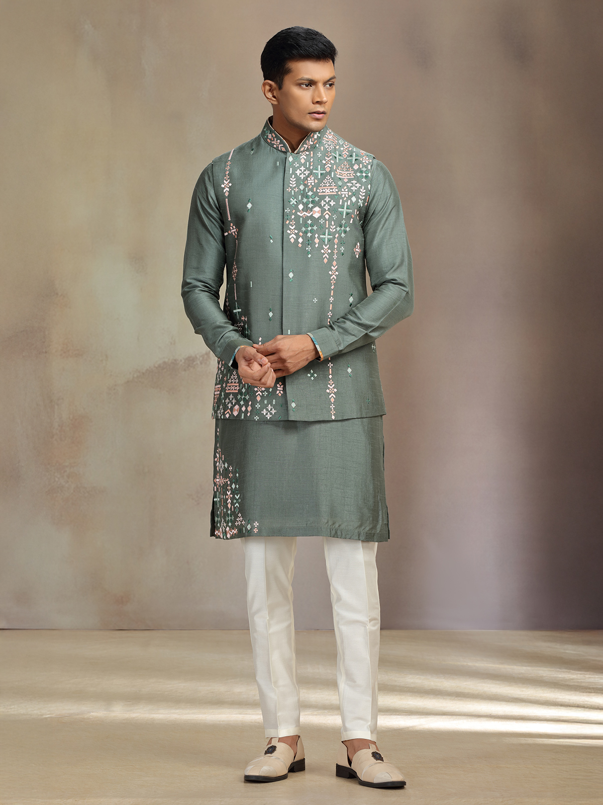 Exuding timeless grace, this green silk waistcoat set highlights intricate embroidery work on a beautifully printed base. Paired with pants, it is designed for weddings and receptions, bringing together heritage detailing and contemporary flair for men seeking polished elegance at special events.