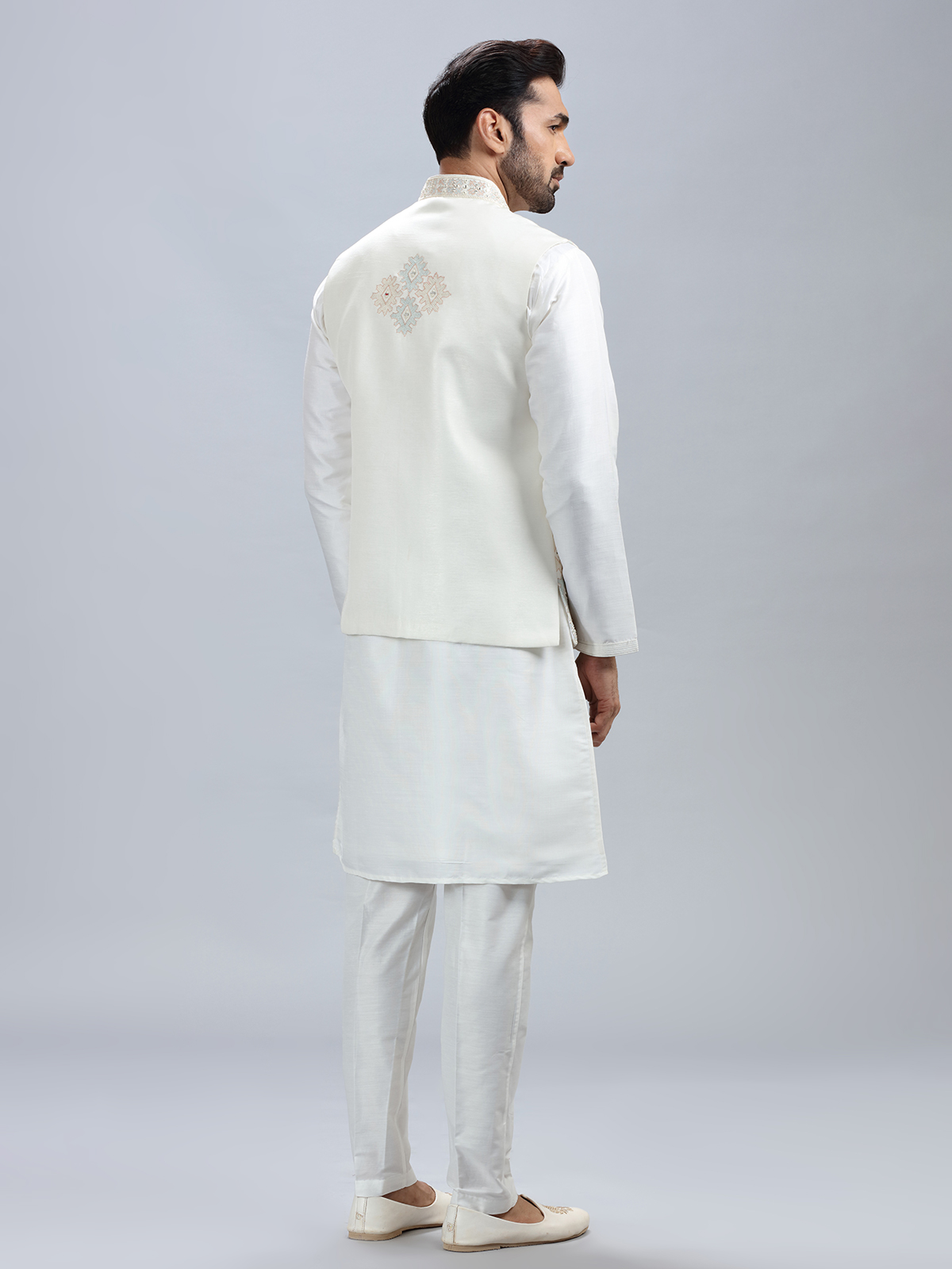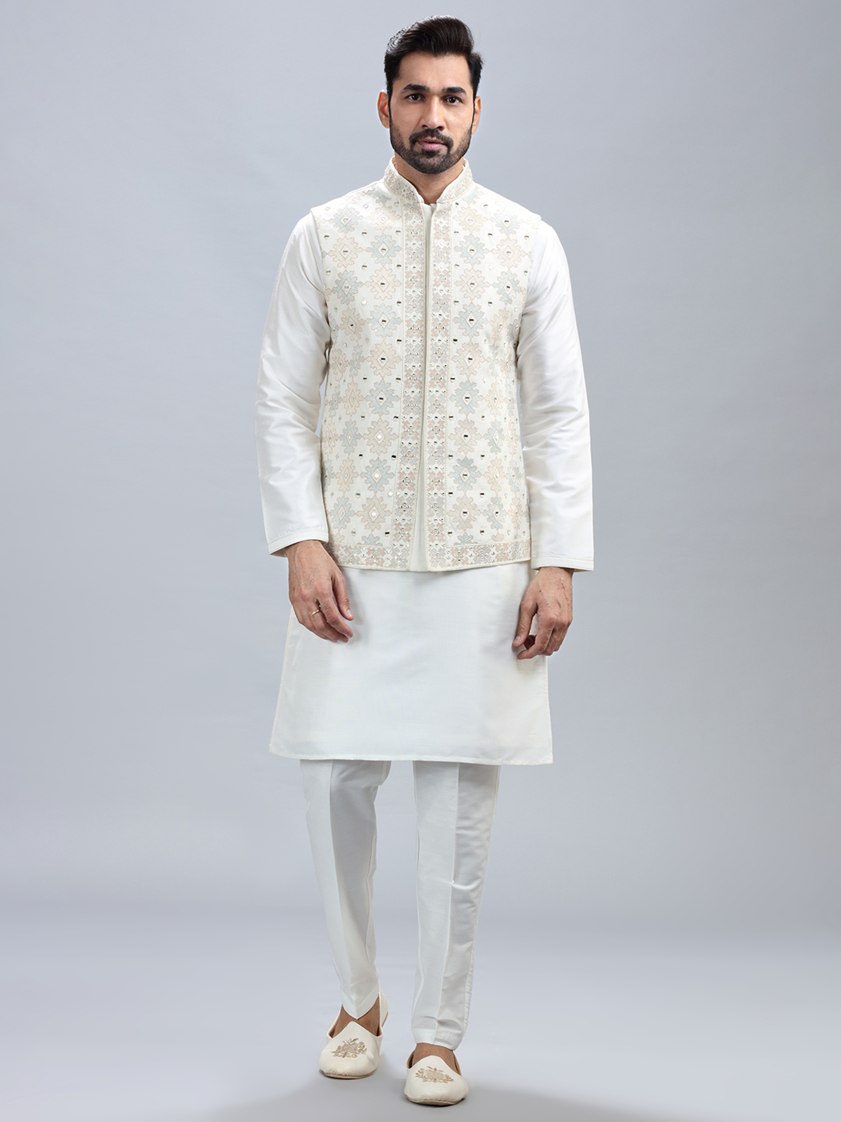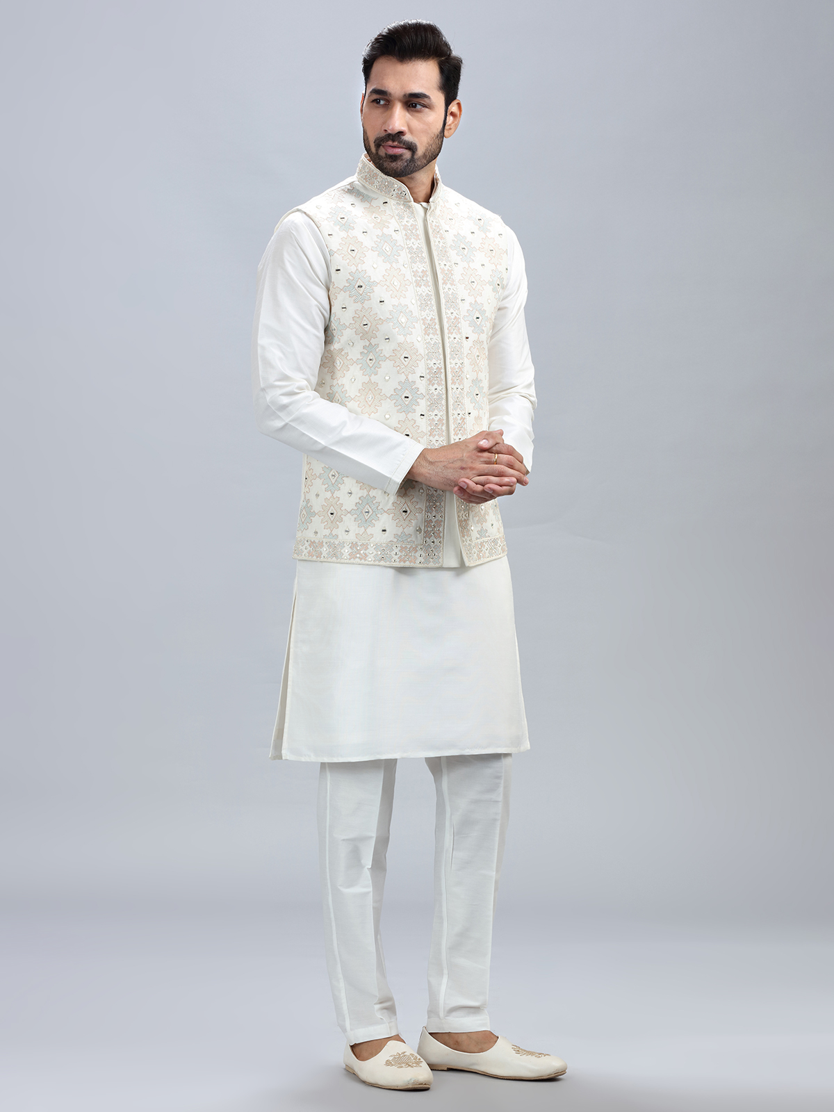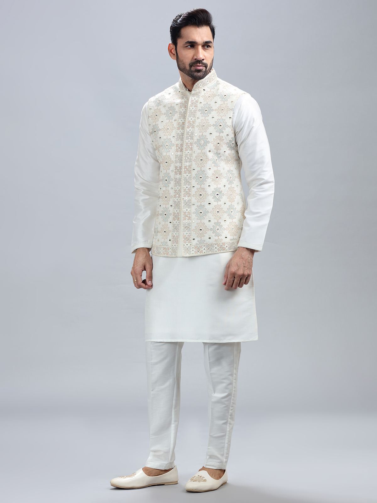 When worn with a bottom, this off-white silk printed waistcoat with exquisite embroidery and aabla work will finish off your unique ensemble.