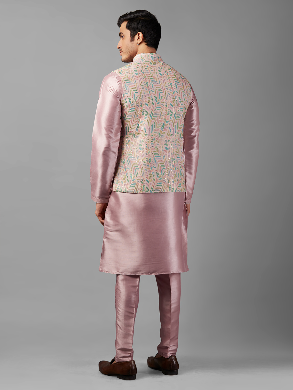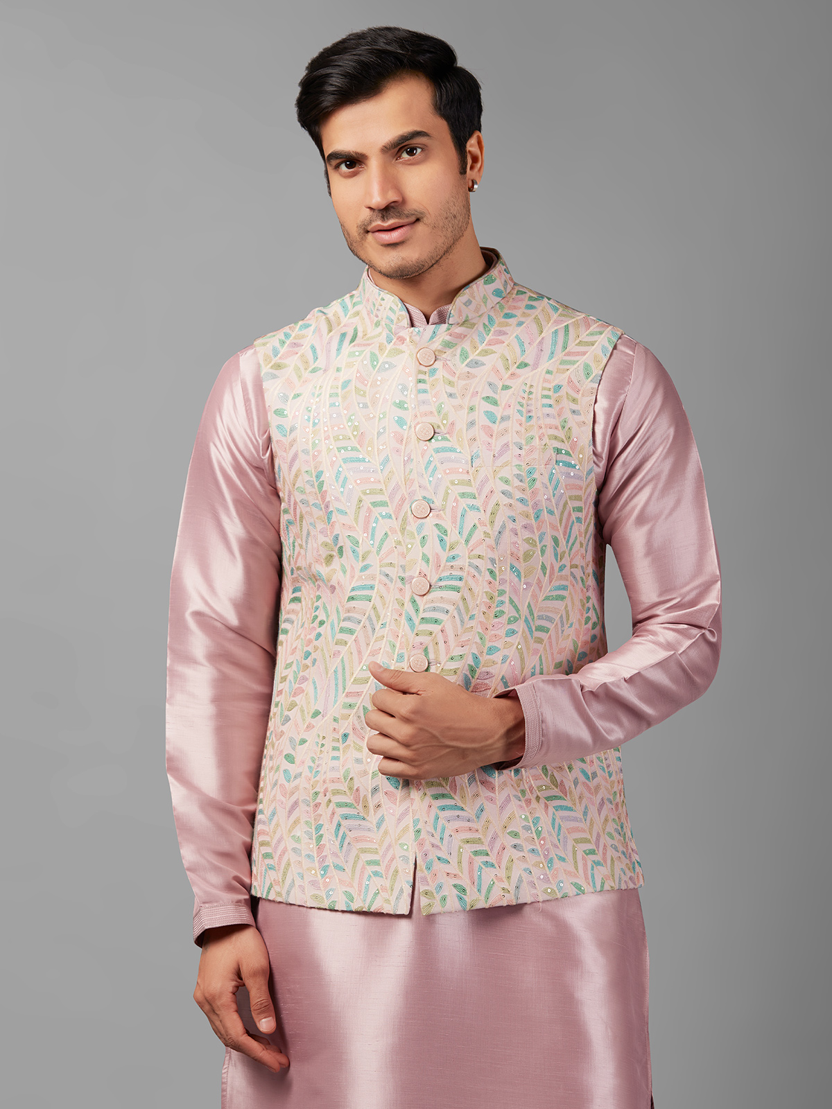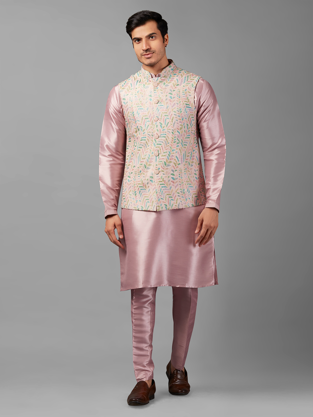 Embrace joy and elegance with our pink silk waistcoat set. Crafted from superb silk and adorned with embroidery and sequins work, it adds a touch of sophistication to your ensemble. Complete with a bottom.