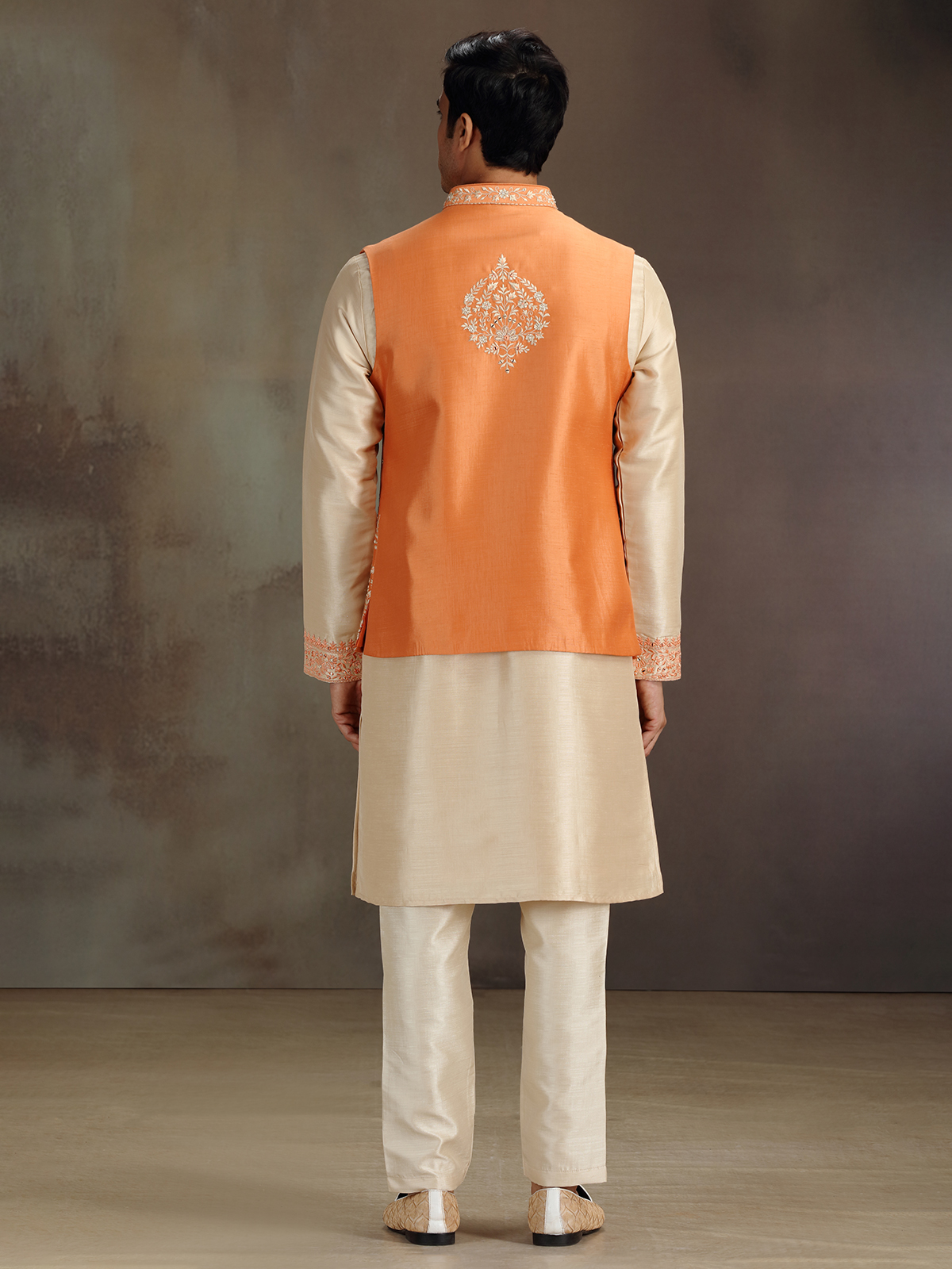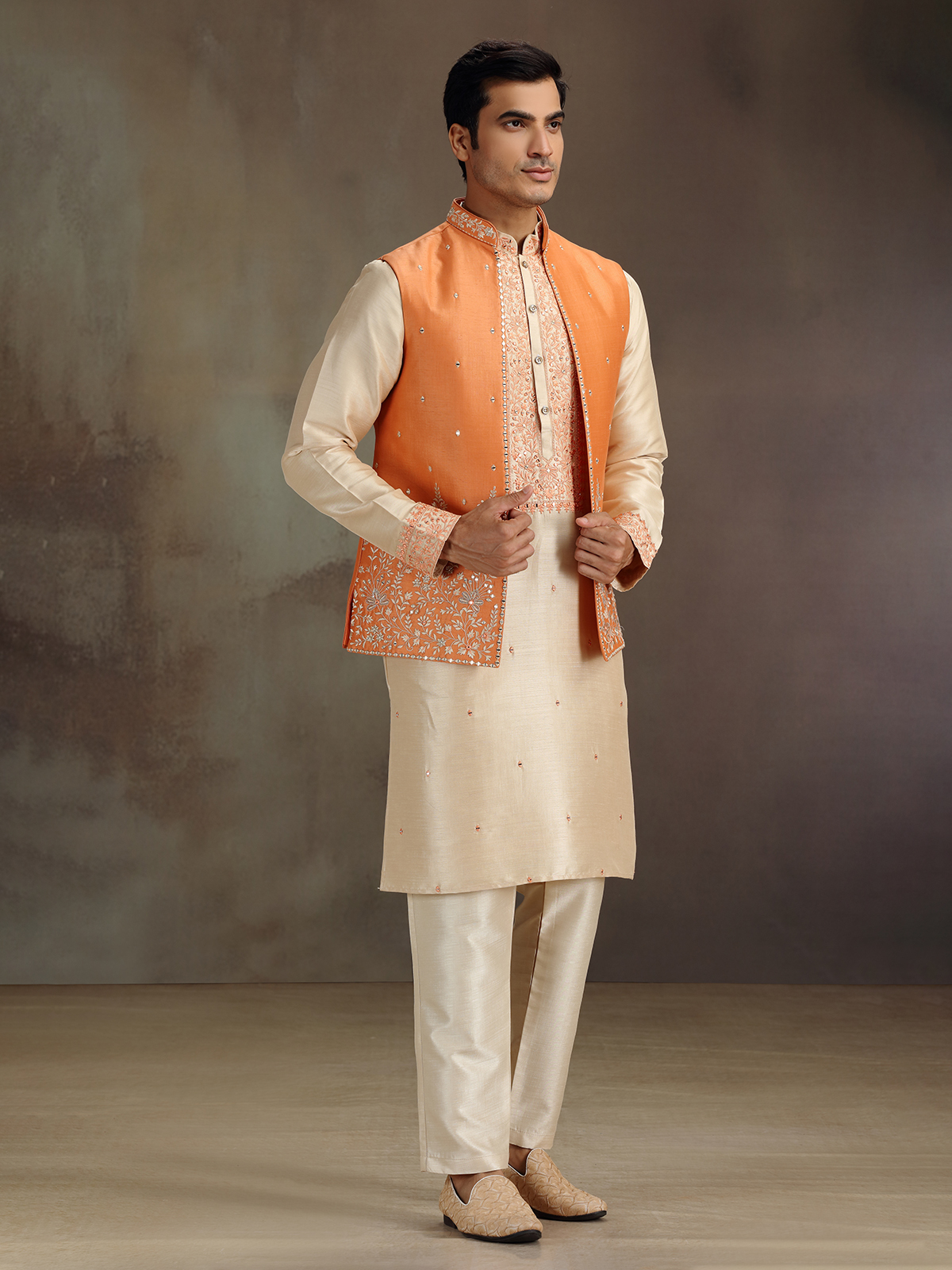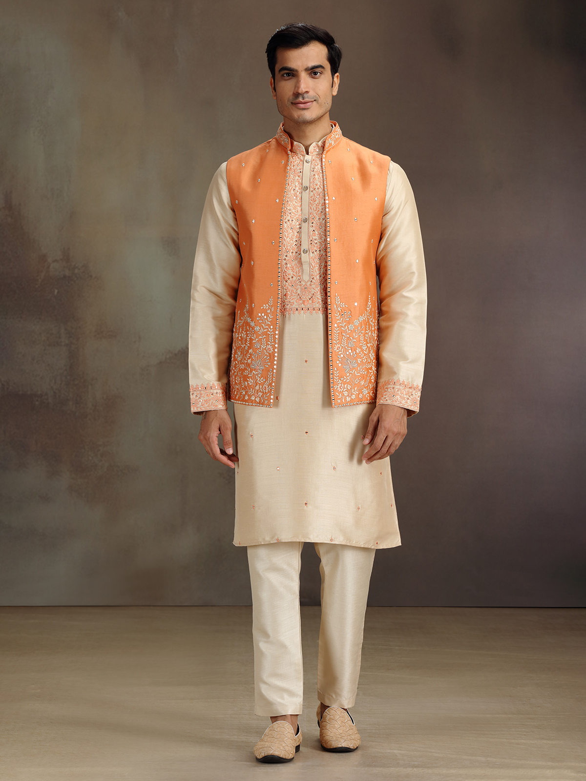 This cream and orange waistcoat set designed in premium silk, glows with embroidery, sequins, cutdana, and mirror accents. A sleeveless waistcoat crowns the chinese-collared, full-sleeve kurta with vibrant artistry. Paired with pant, ideal for radiant wedding occasions.