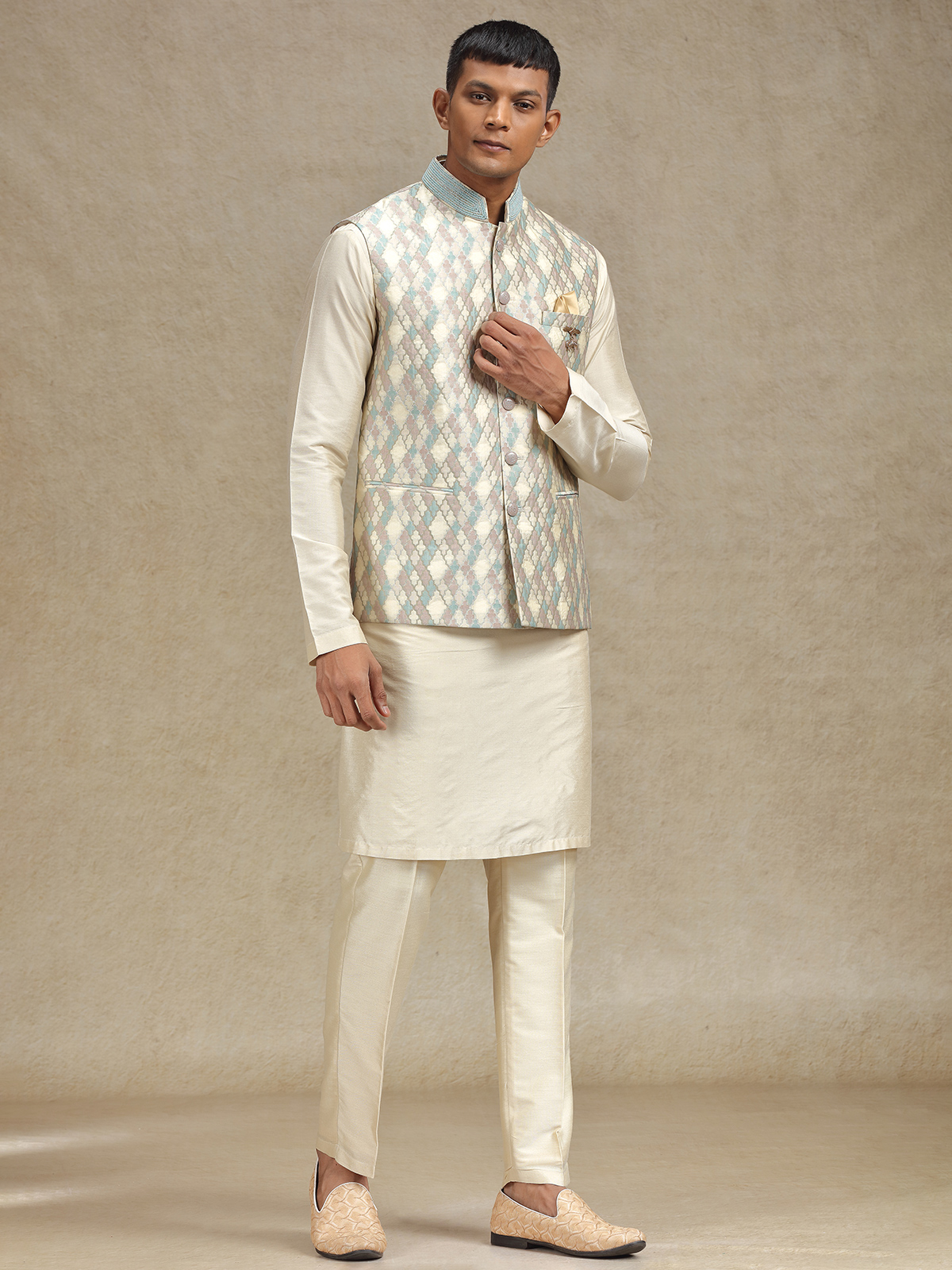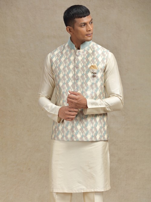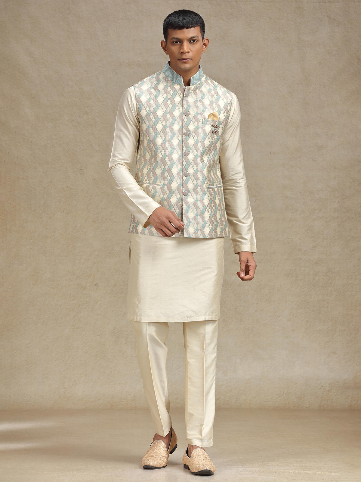 This cream and pista waistcoat set for men marries traditional artistry with modern design. Crafted from fine silk, it highlights intricate thread and zari weaving. The mandarin collar offers a crisp, updated silhouette, while the matching trousers ensure a coordinated and graceful outfit for any celebration.
