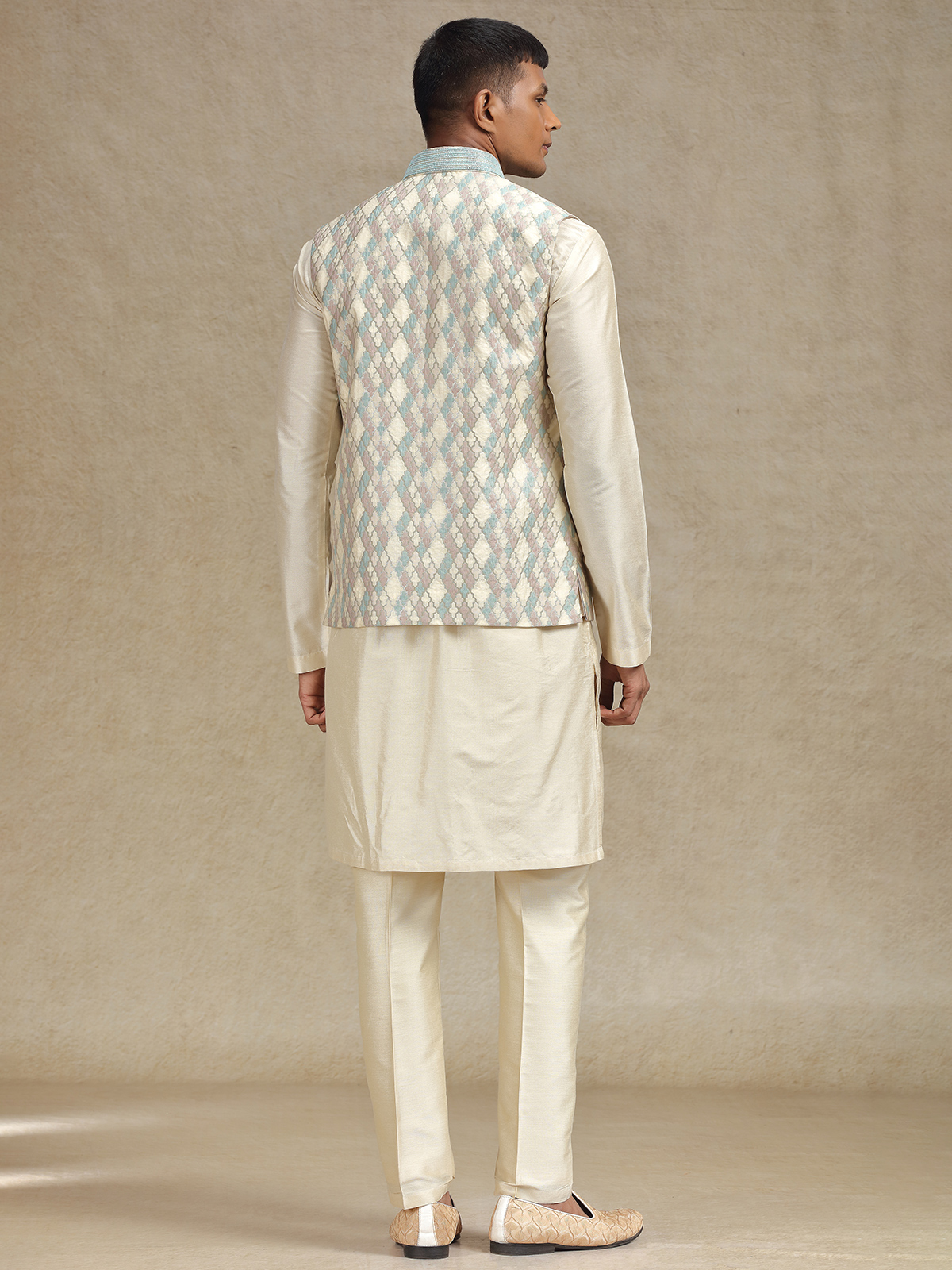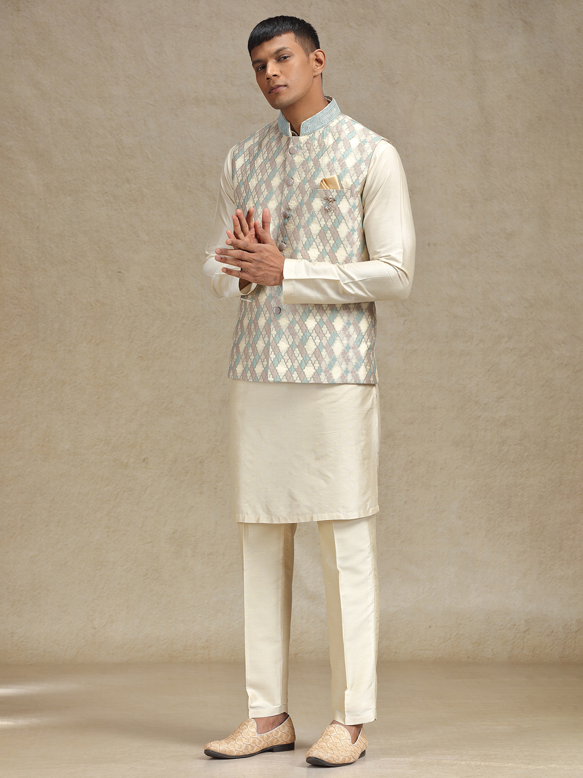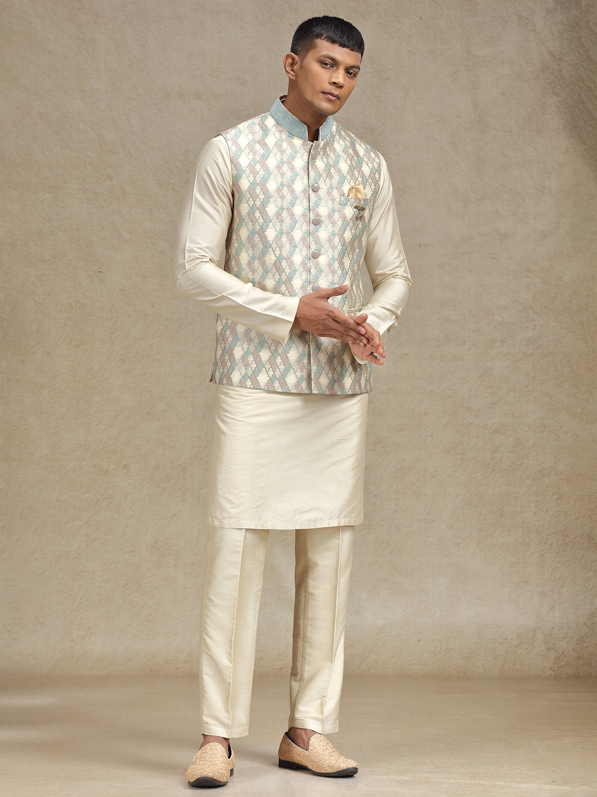 This cream and pista waistcoat set for men marries traditional artistry with modern design. Crafted from fine silk, it highlights intricate thread and zari weaving. The mandarin collar offers a crisp, updated silhouette, while the matching trousers ensure a coordinated and graceful outfit for any celebration.