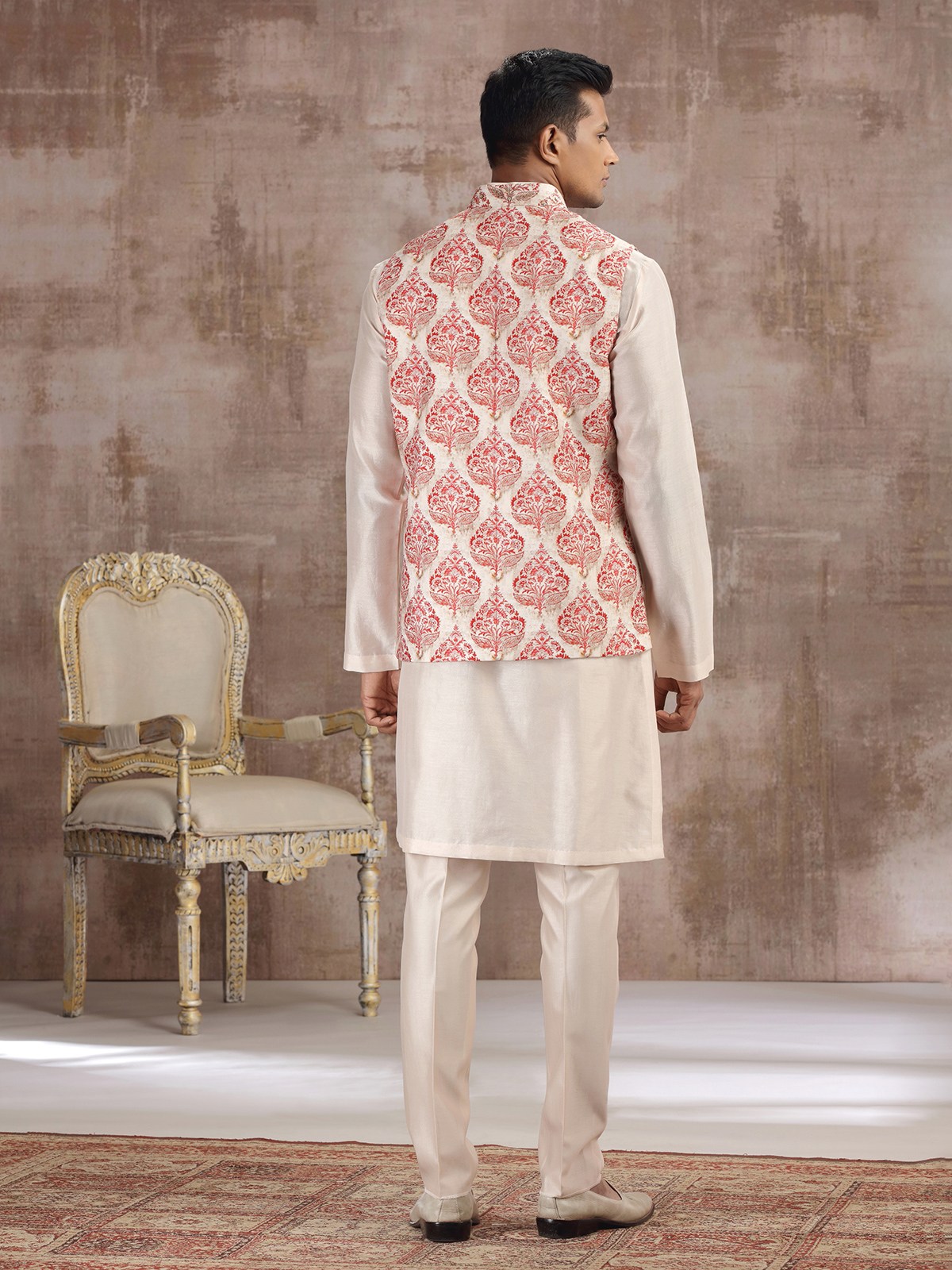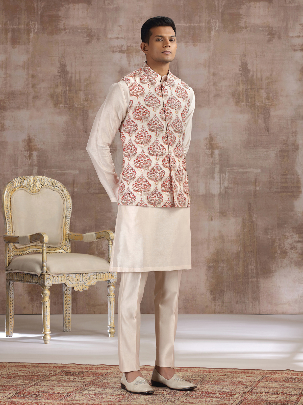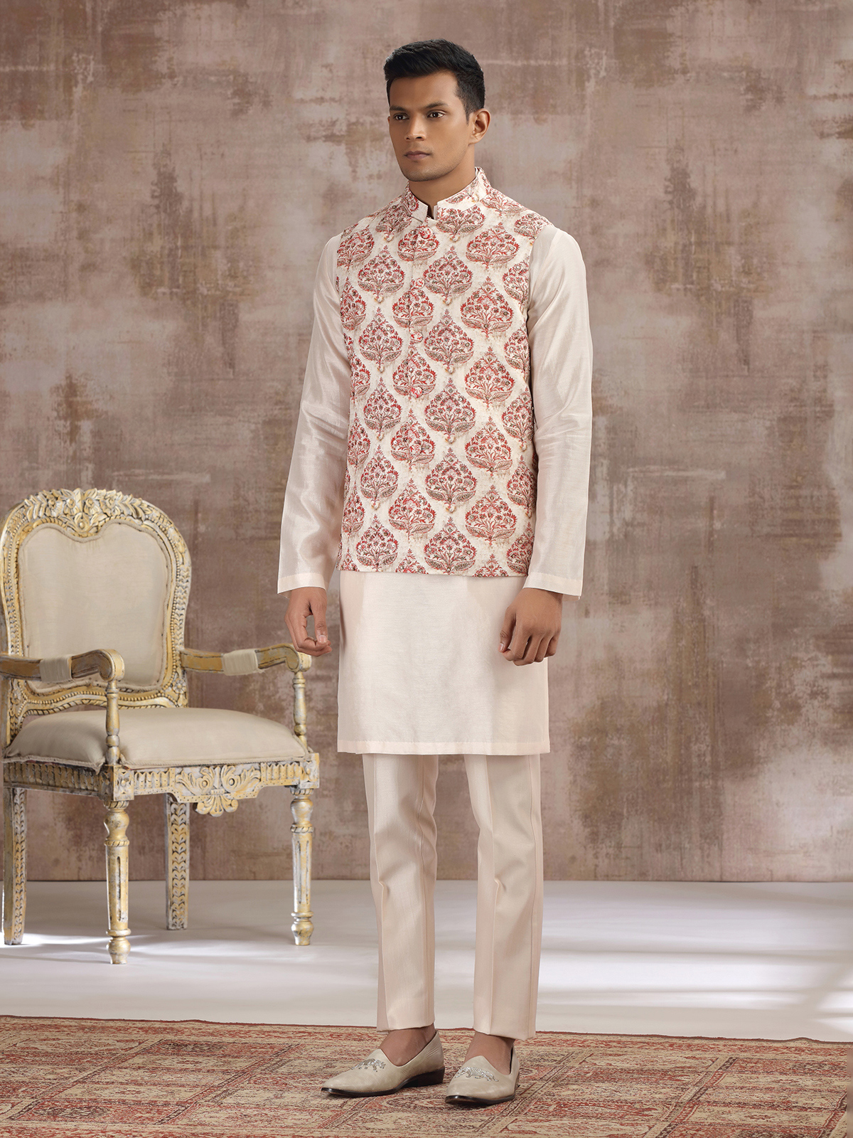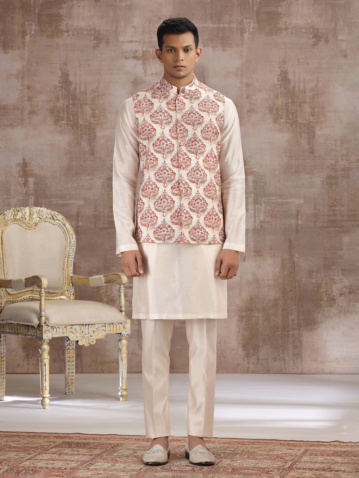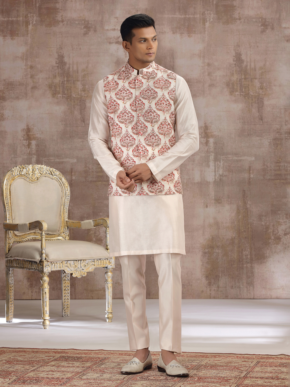 Bring vibrance to occasions with this cream and red printed silk waistcoat set, crafted with resham, sequins, and beads. The stand collar adds refinement, while the pant balances the look. Perfect for weddings, receptions, and festive gatherings.