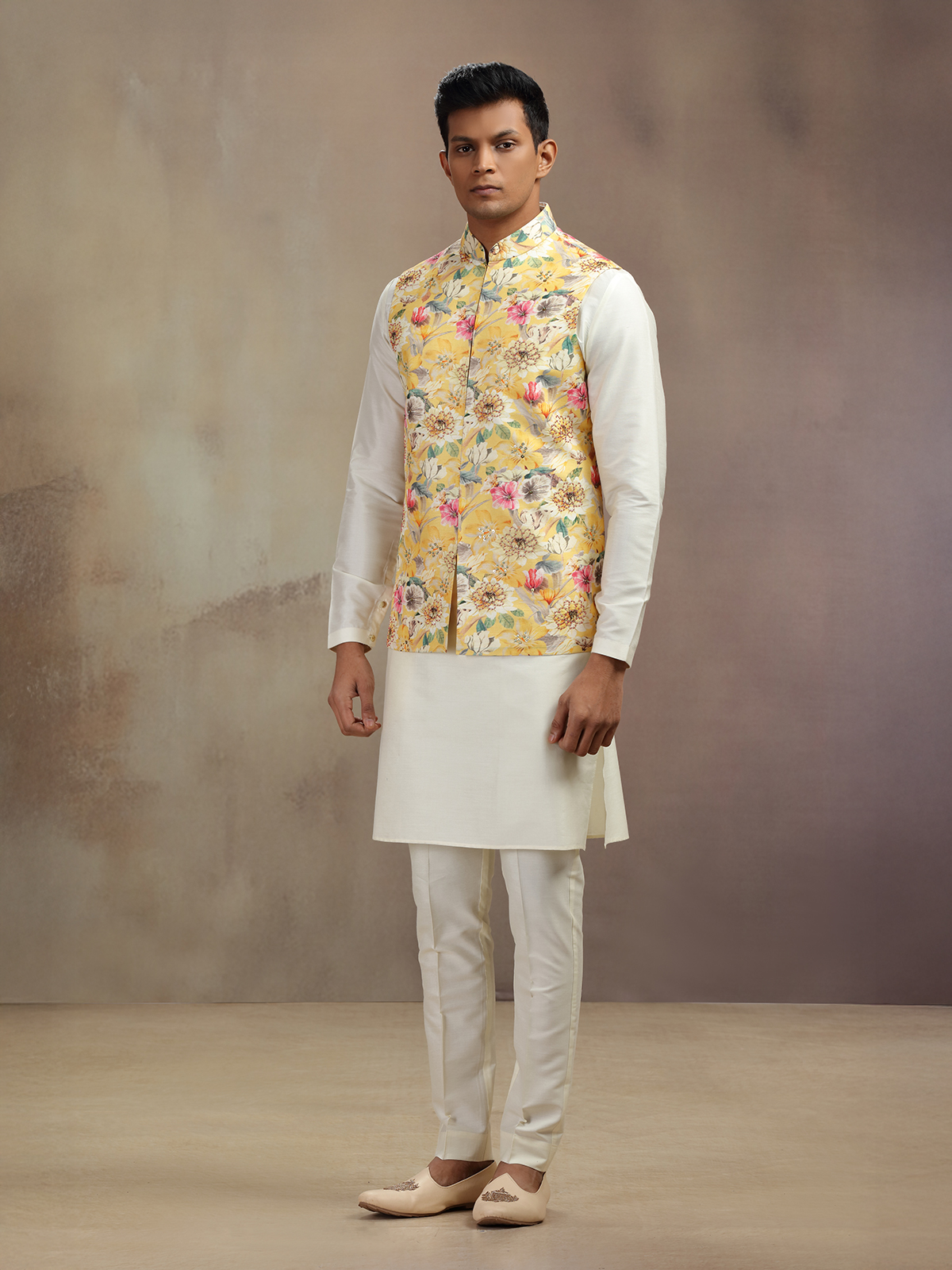 Cream And Yellow Cotton Silk Waistcoat Set With Contemporary Print